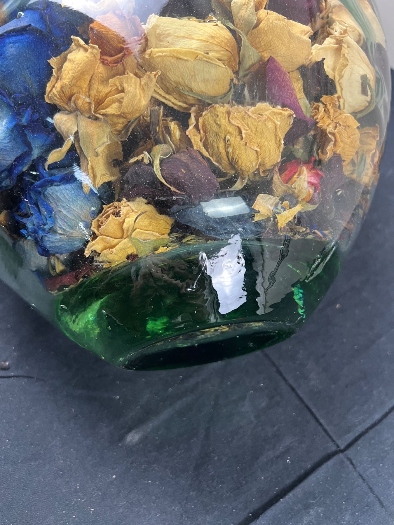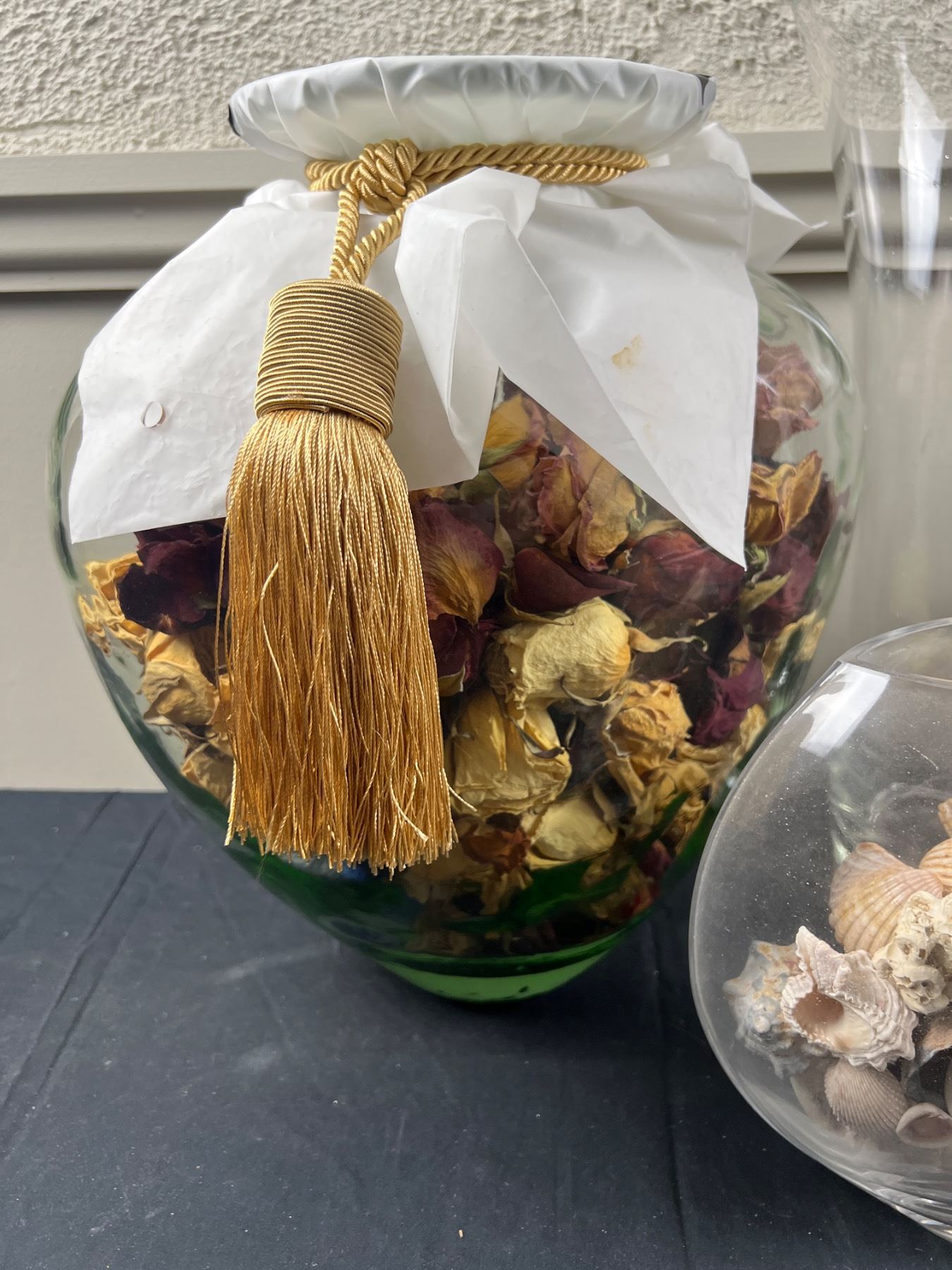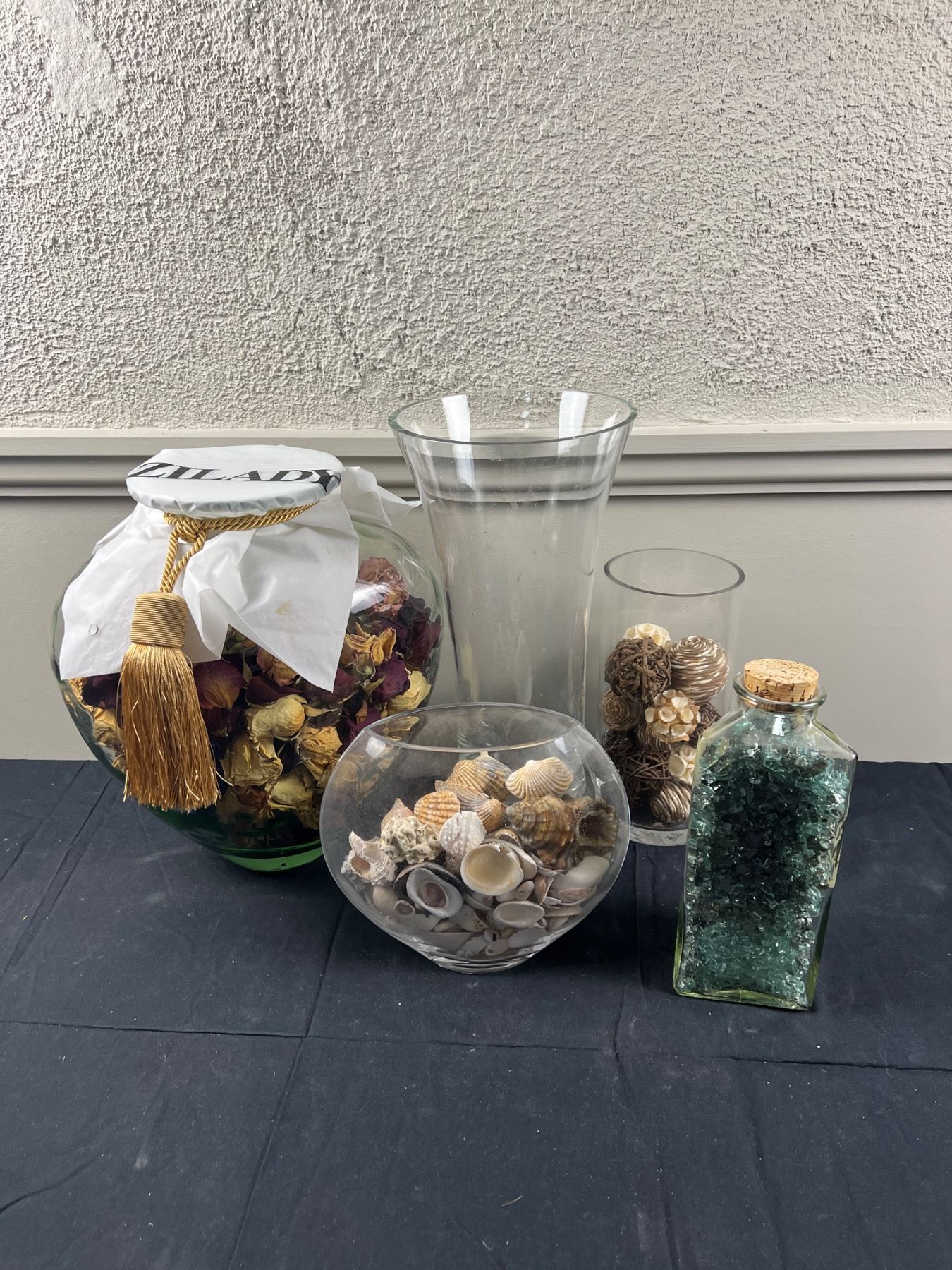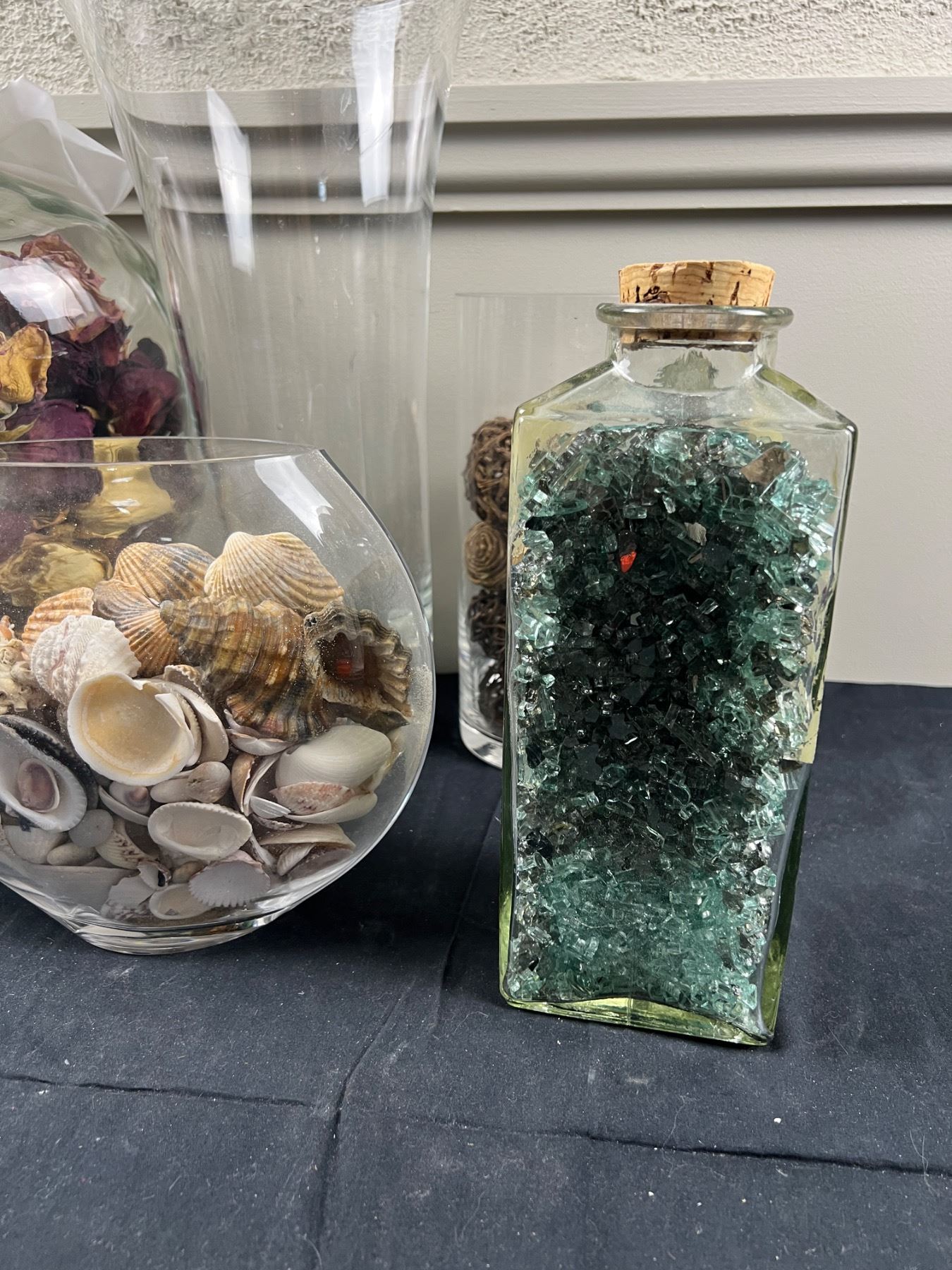 Some tape and residue stuck to bottle. Damage to large vase rim. Large vase is 16" tall