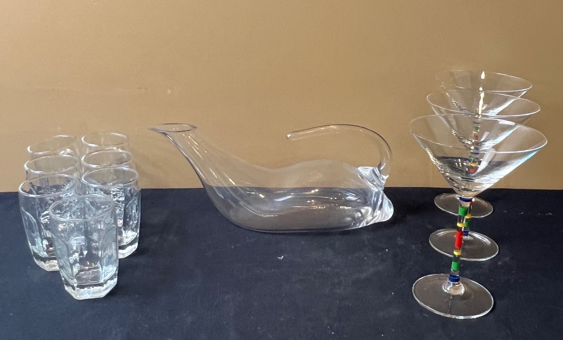 Includes 7 short glasses, 3 colourful martini glasses, and a wine decanter