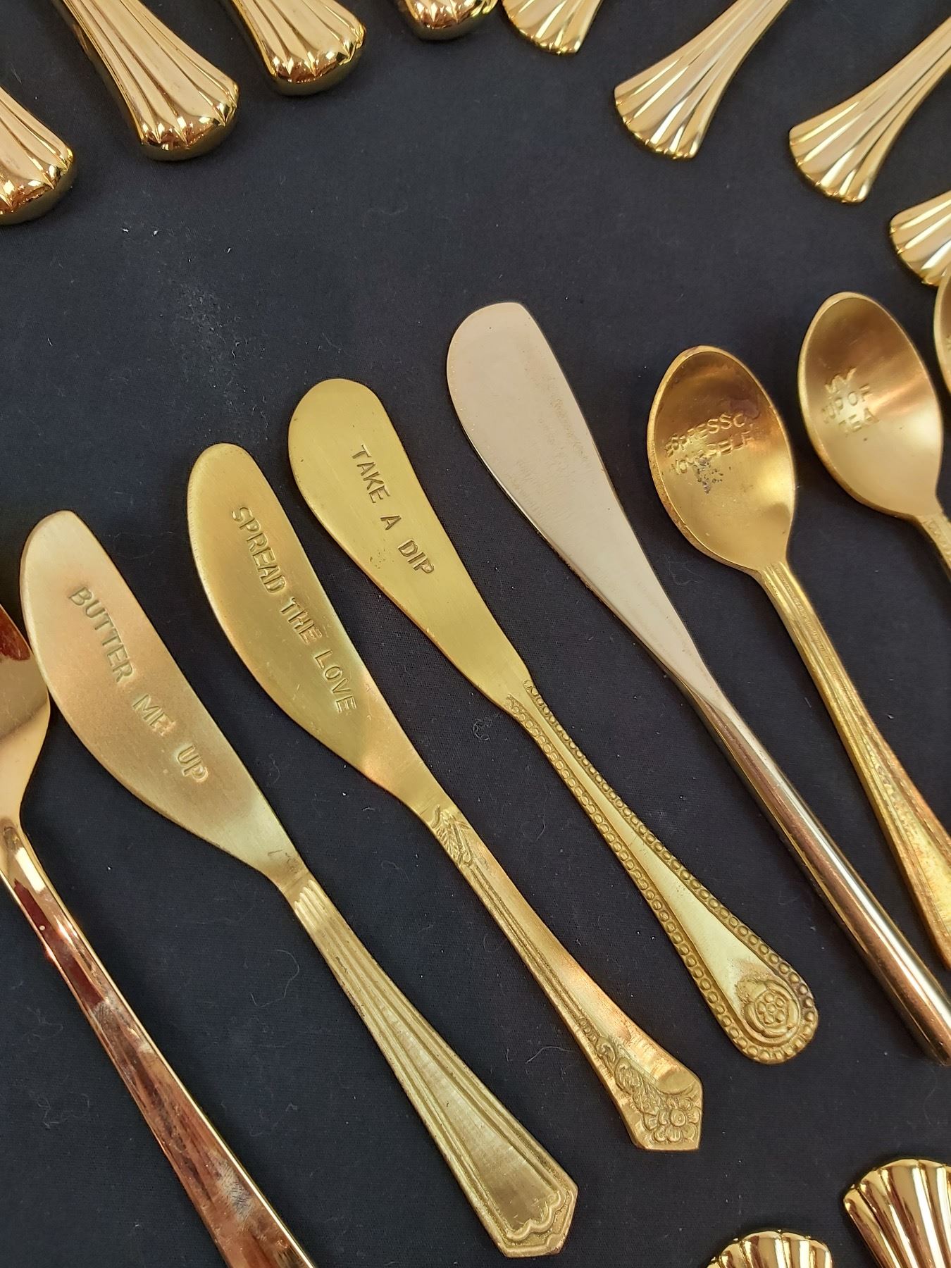 Includes, Roma Gold, Splendide Stainless Steel, assorted tea spoons and spreading knives, Aproximatly 58pcs and box