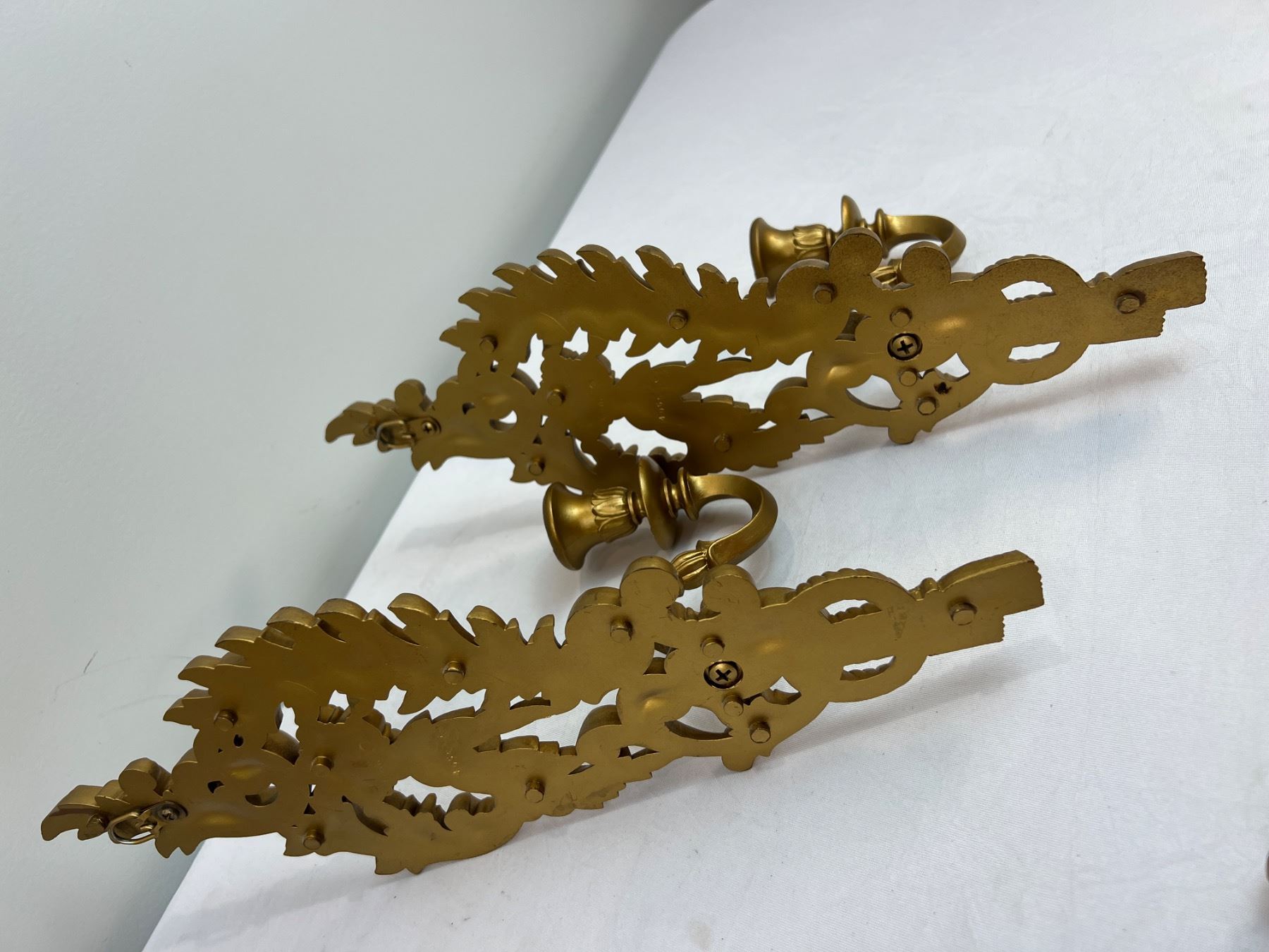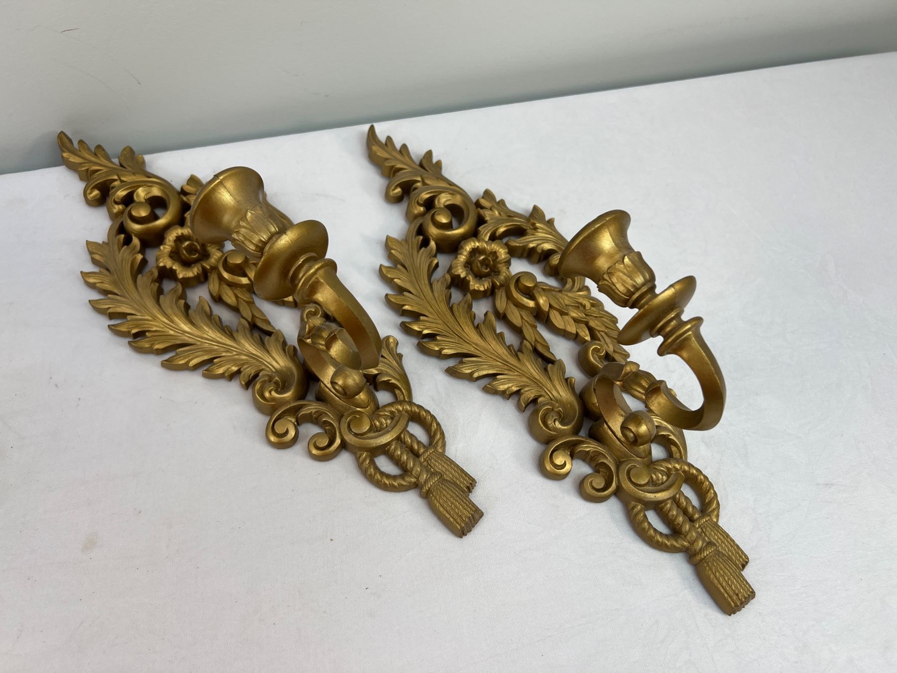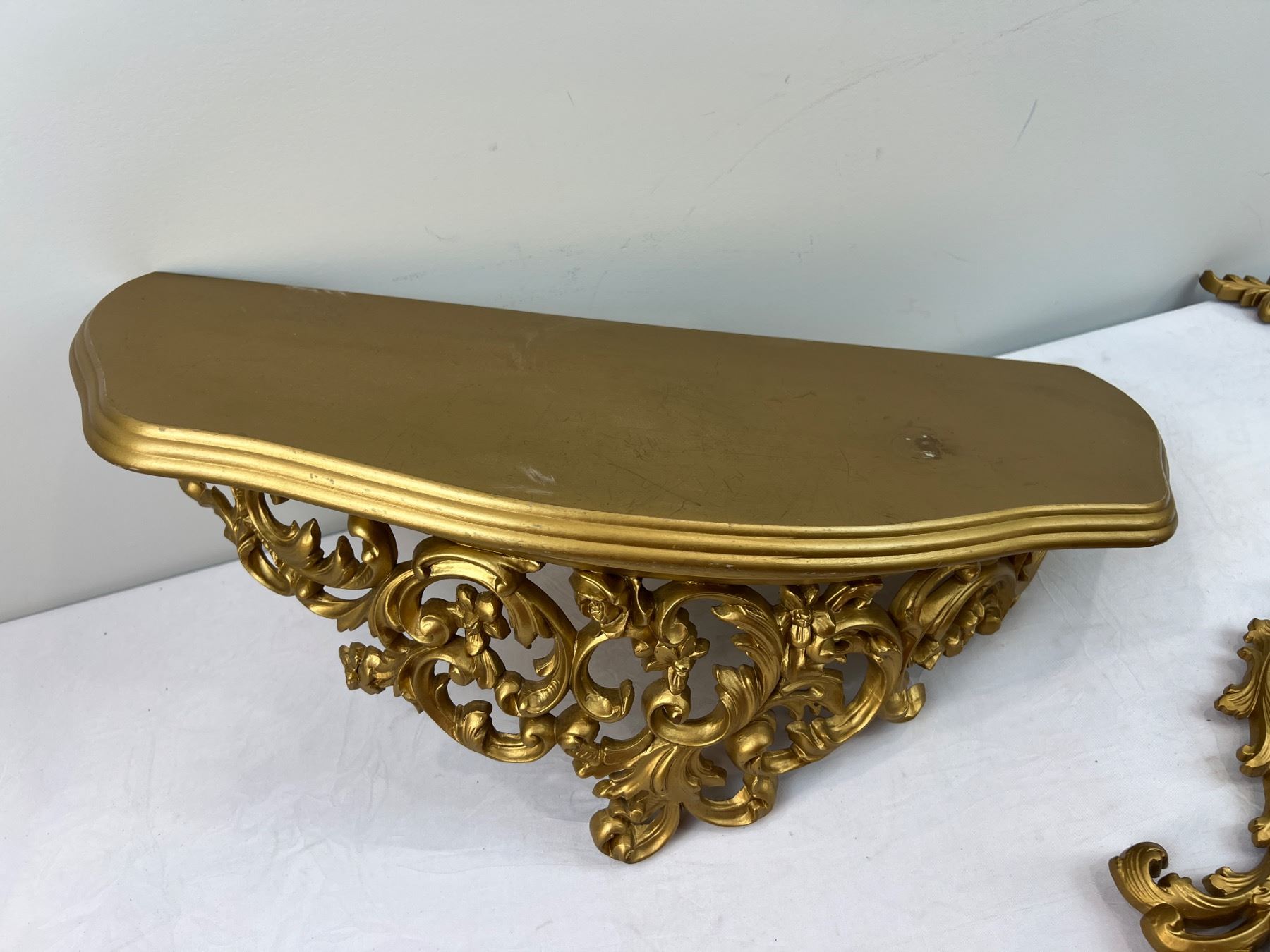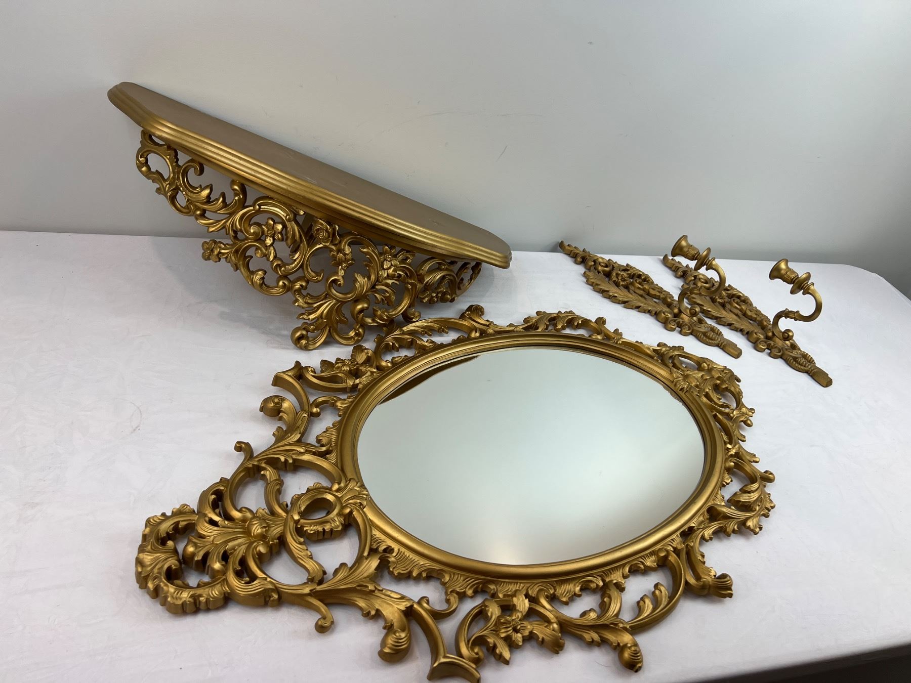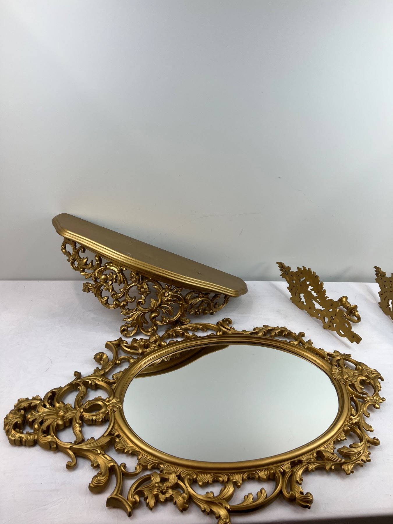 Includes wall mirror 33" tall x 22" wide - 2 wall candle holders 14.5" tall - wall shelf (has scuffs) 23" wide x 9.5" deep