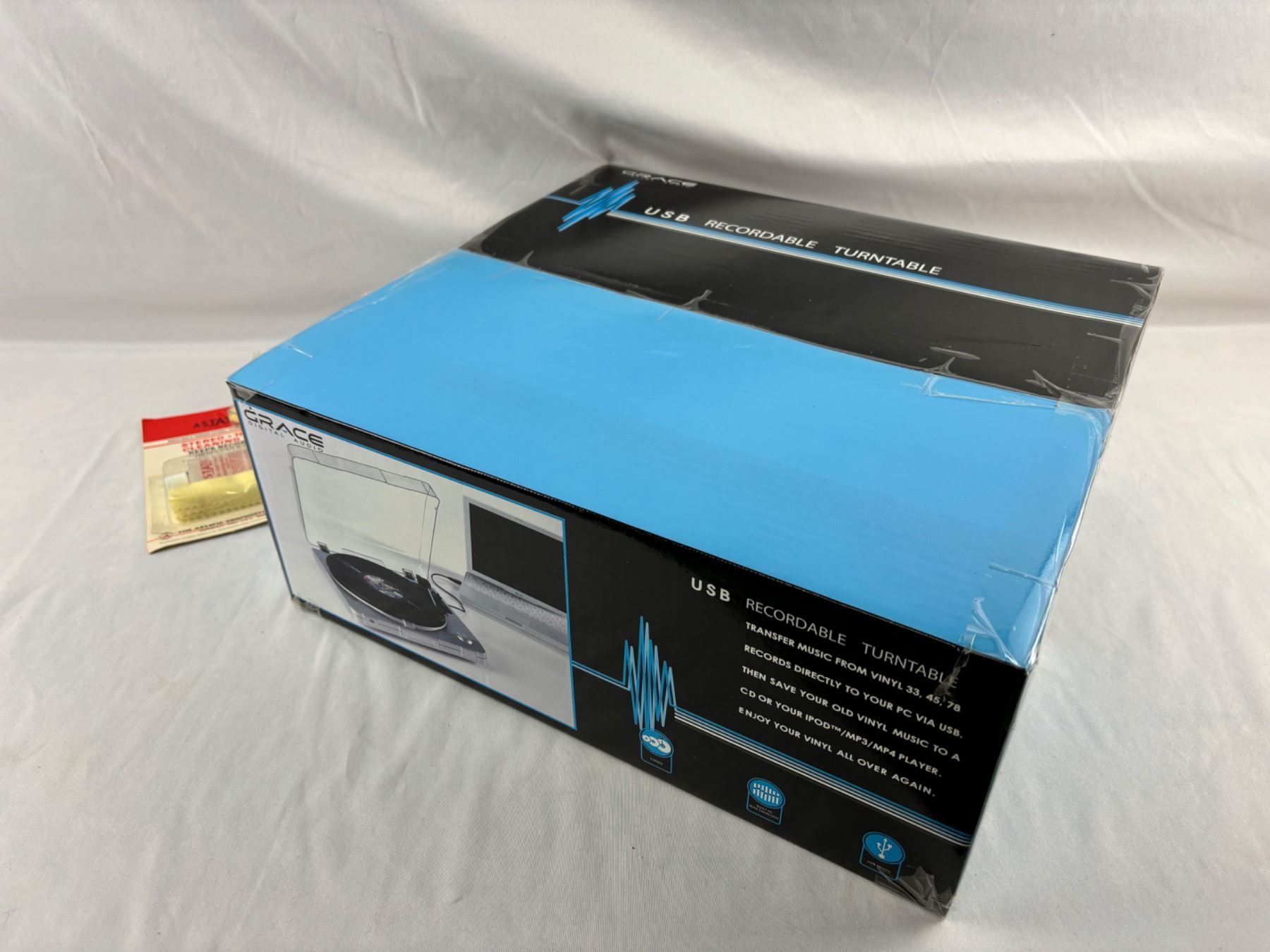New in box, 33-45-75rpm Speed Turntable, includes cleaning kit