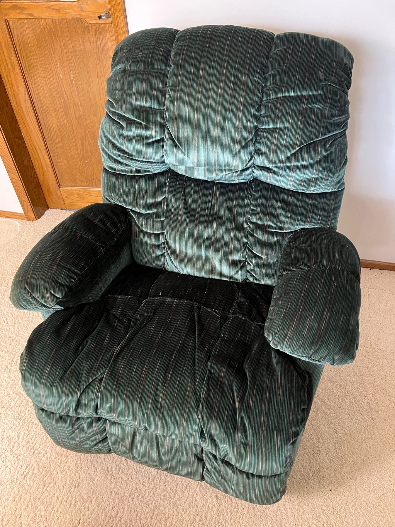 Fully reclined it is 54"L x 39"H x 39"W, Closed it is 38"L, some small spots of wear