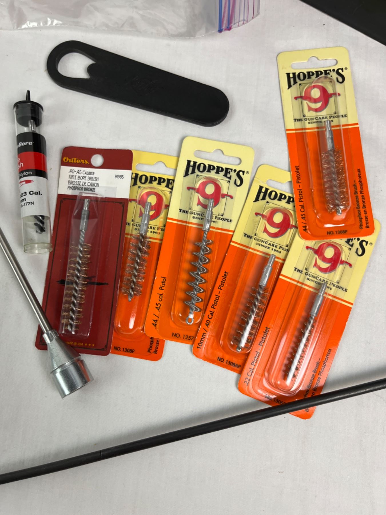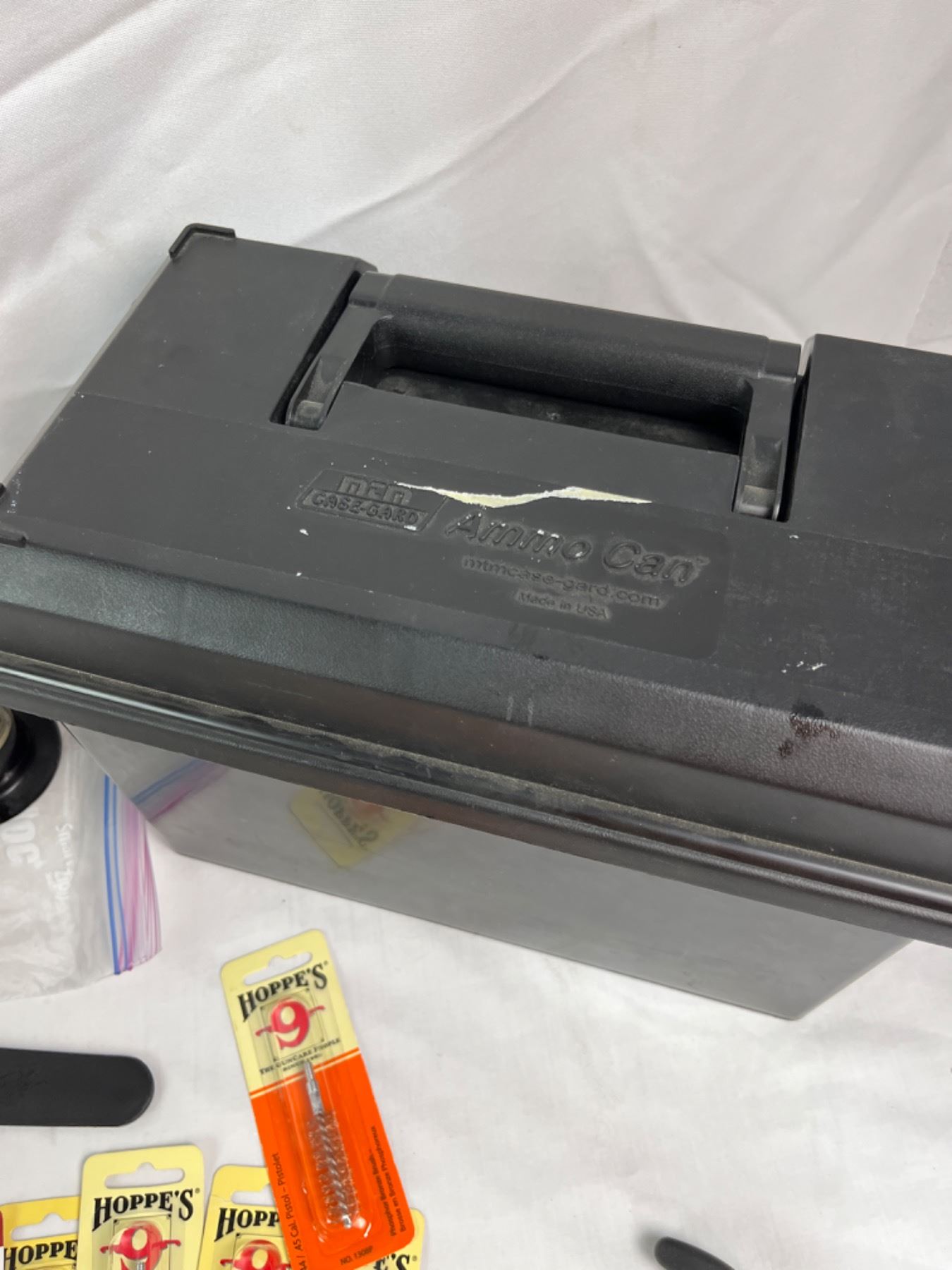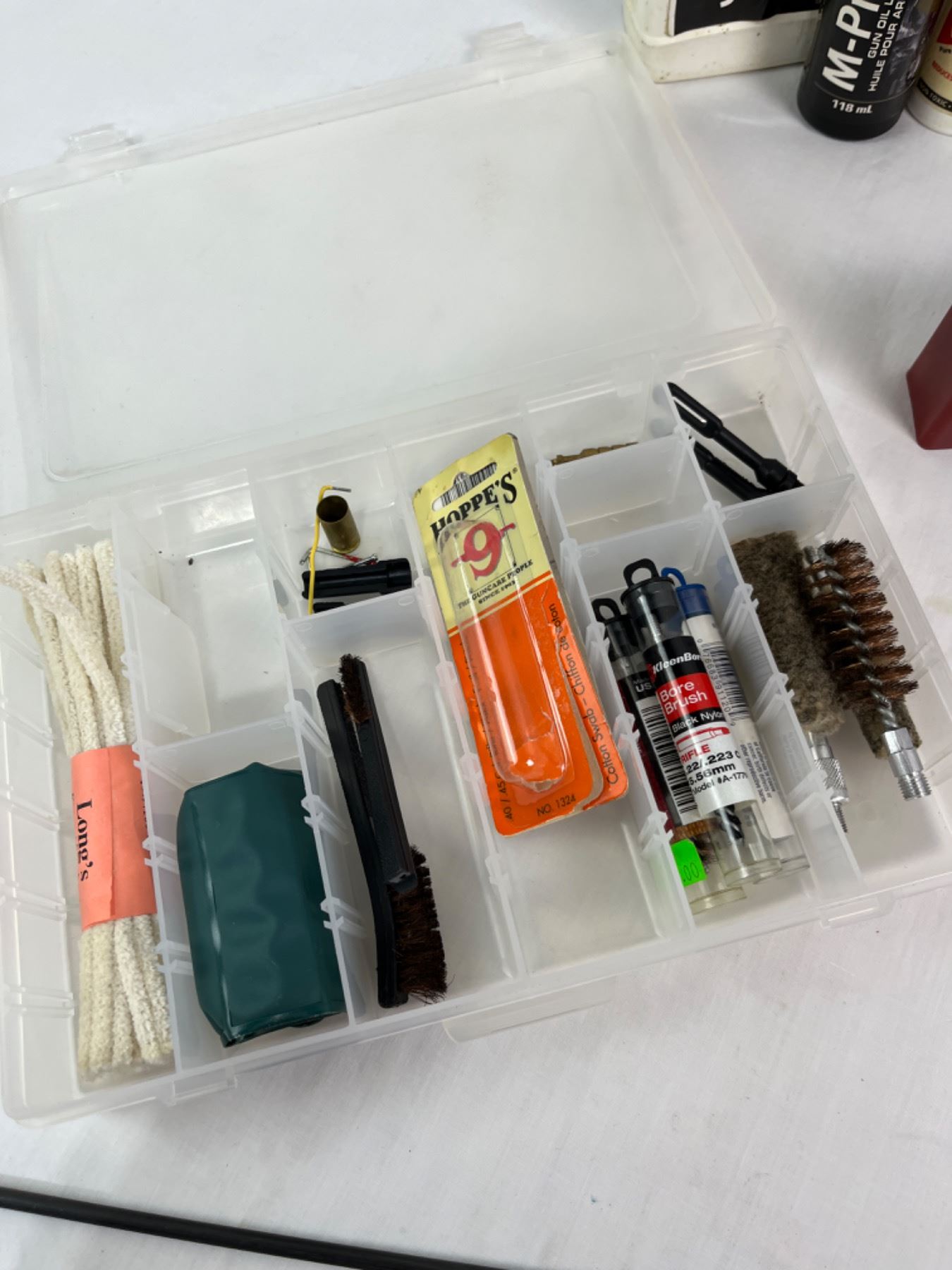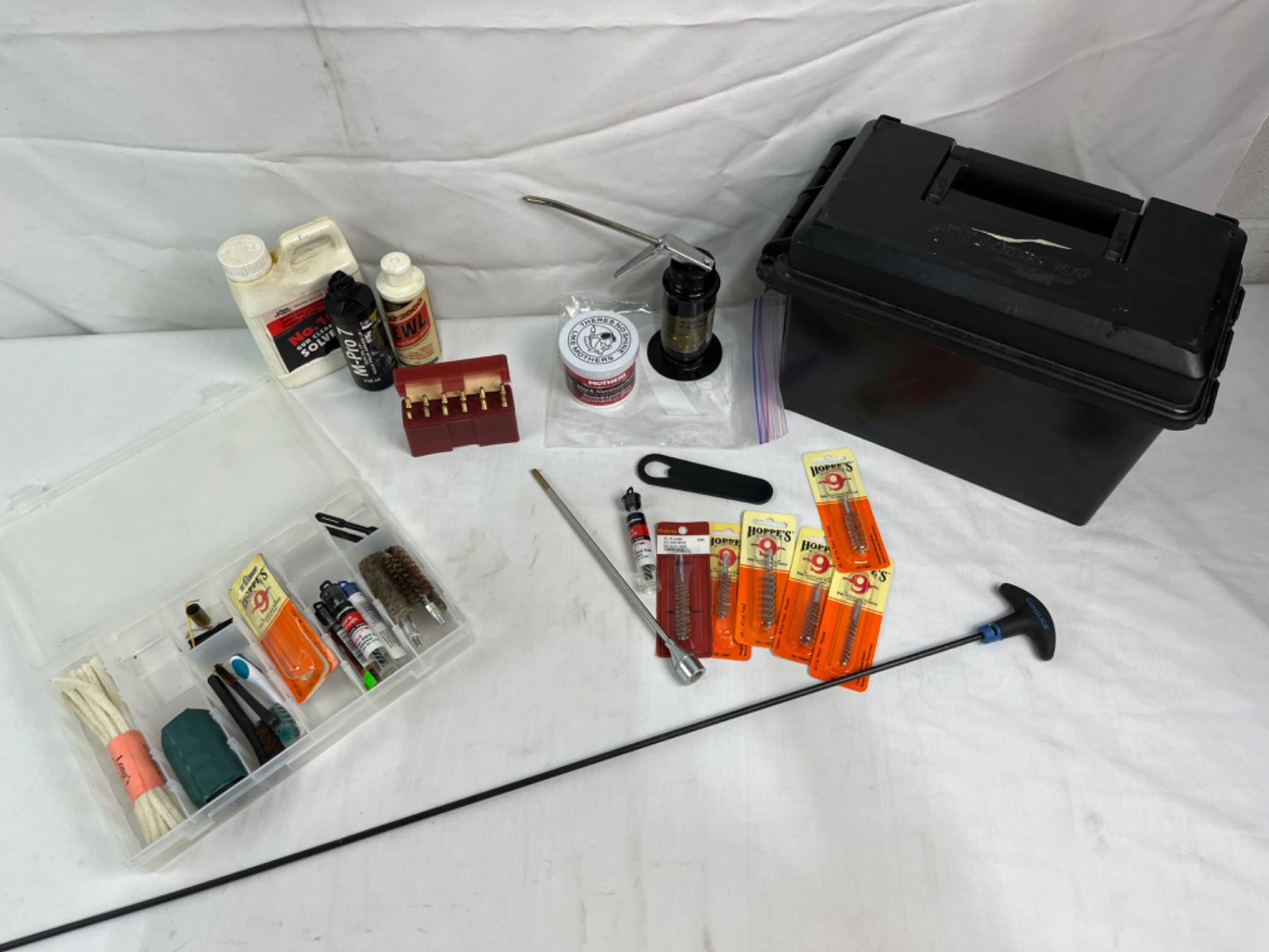 Includes bronze brushes, gunslick rod, aluminum polish, ammo can etc. Some solvents are under 1/2 full
