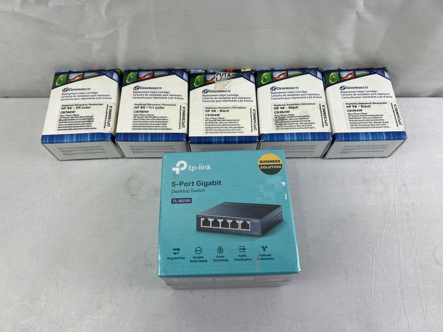 5 New Ink Cartridges For HP & New Sealed 5 Port Desktop Switch