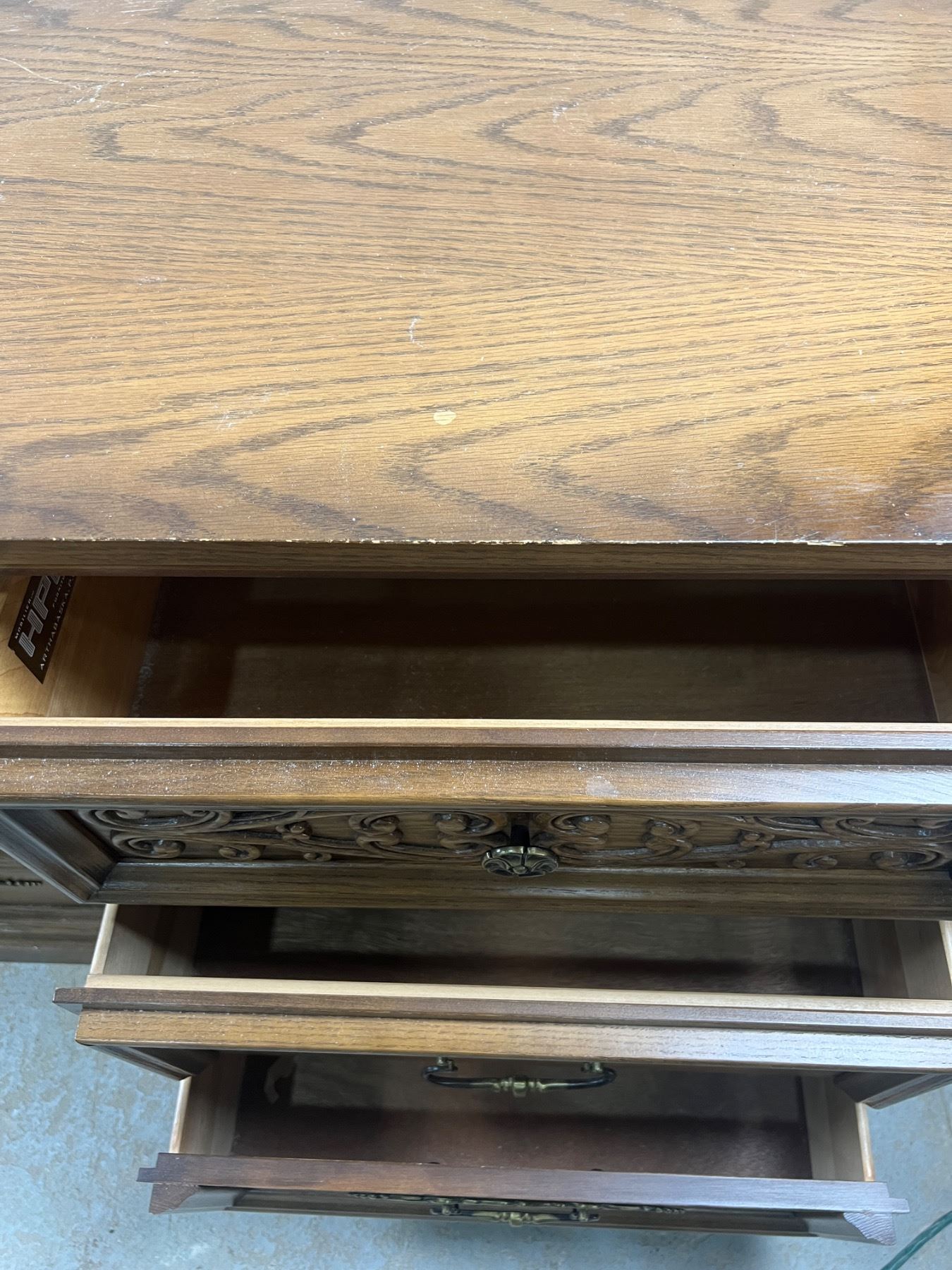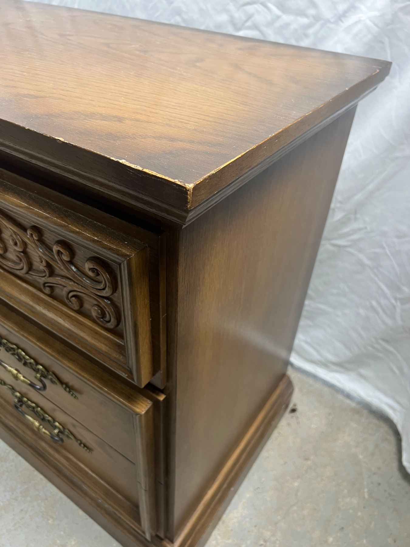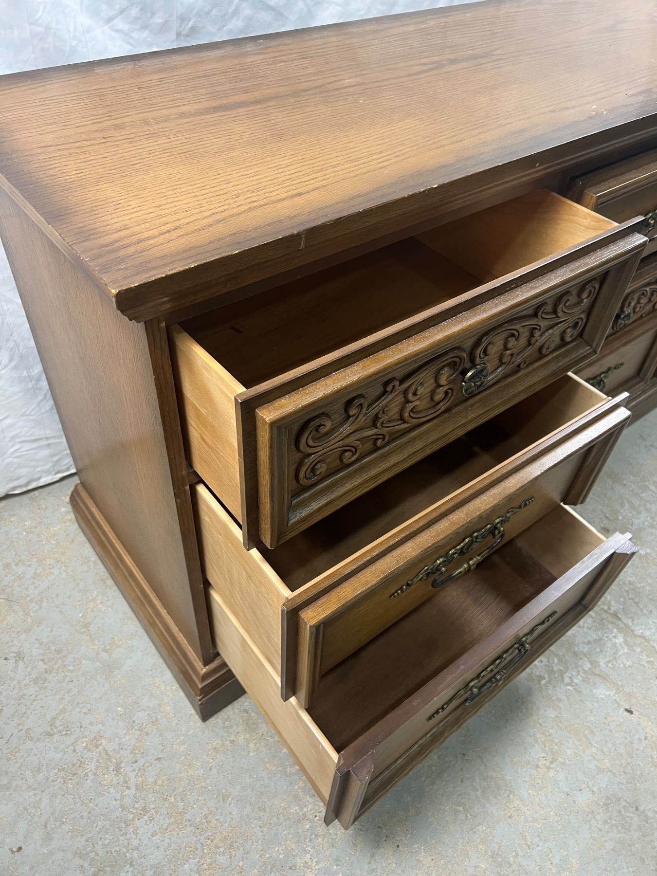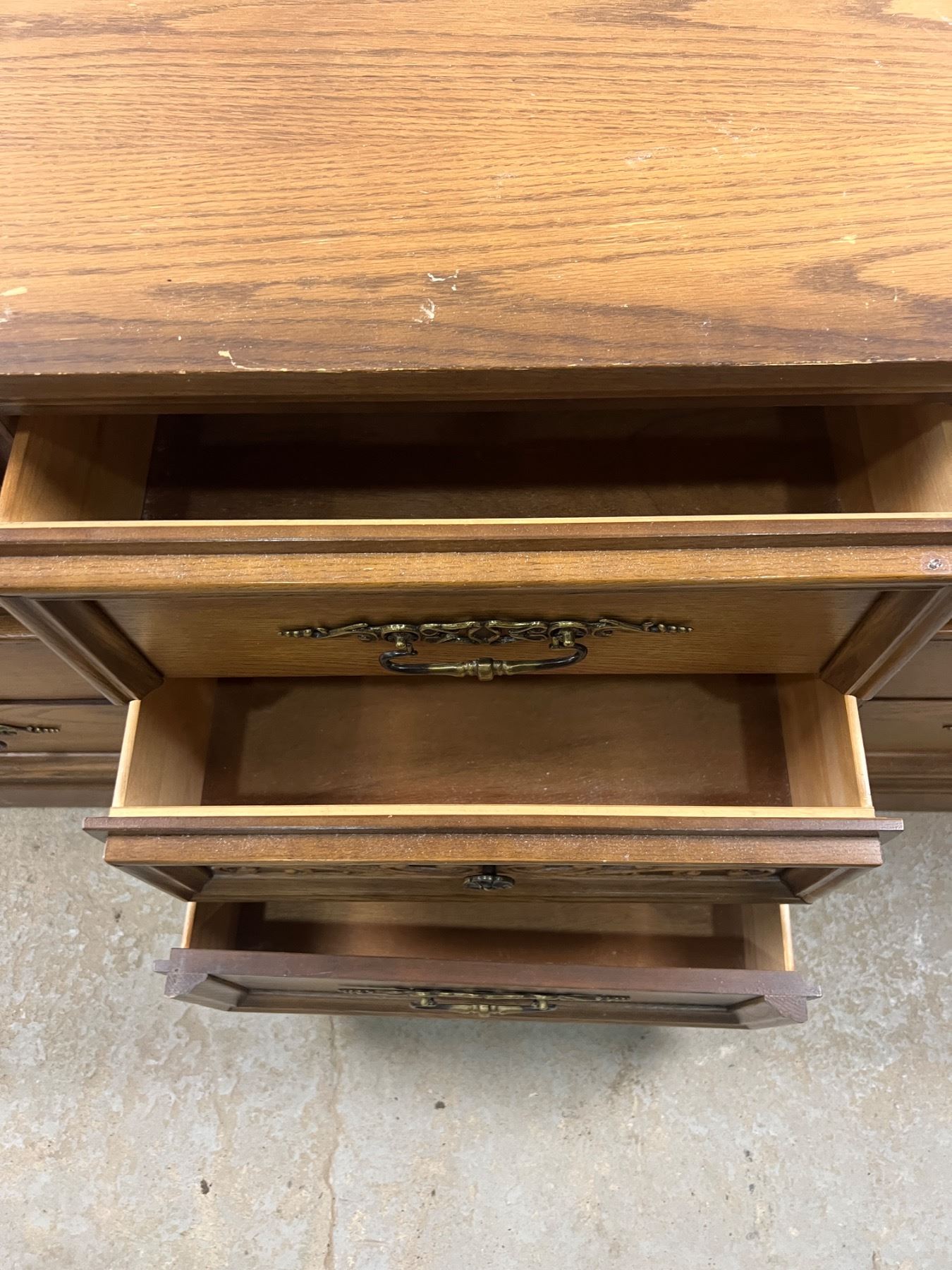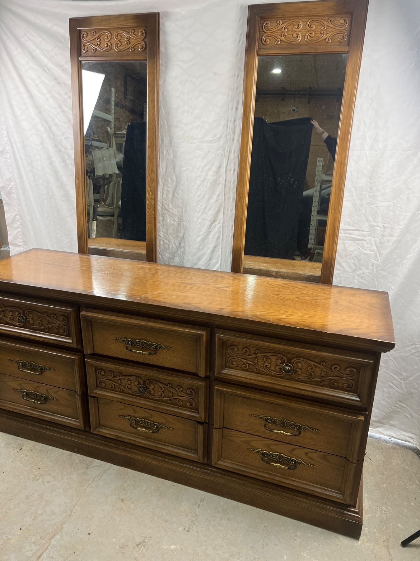 The dresser has some scuffs and scratches along the top, Includes two mirrors and the mounting hardware, The dresser measures 30"H x 66"L x 18"D, the mirrors are 70.5"H x 17"W