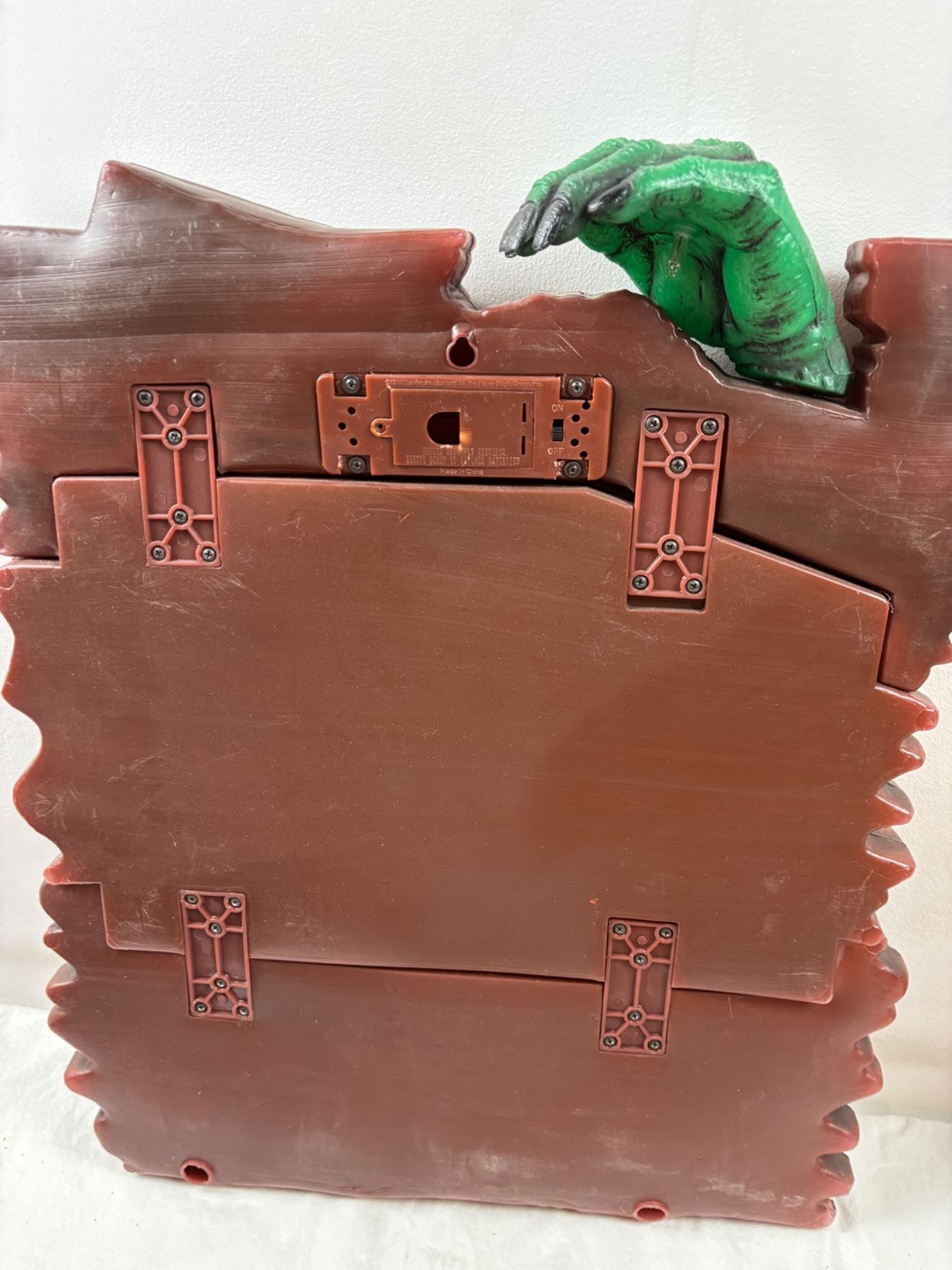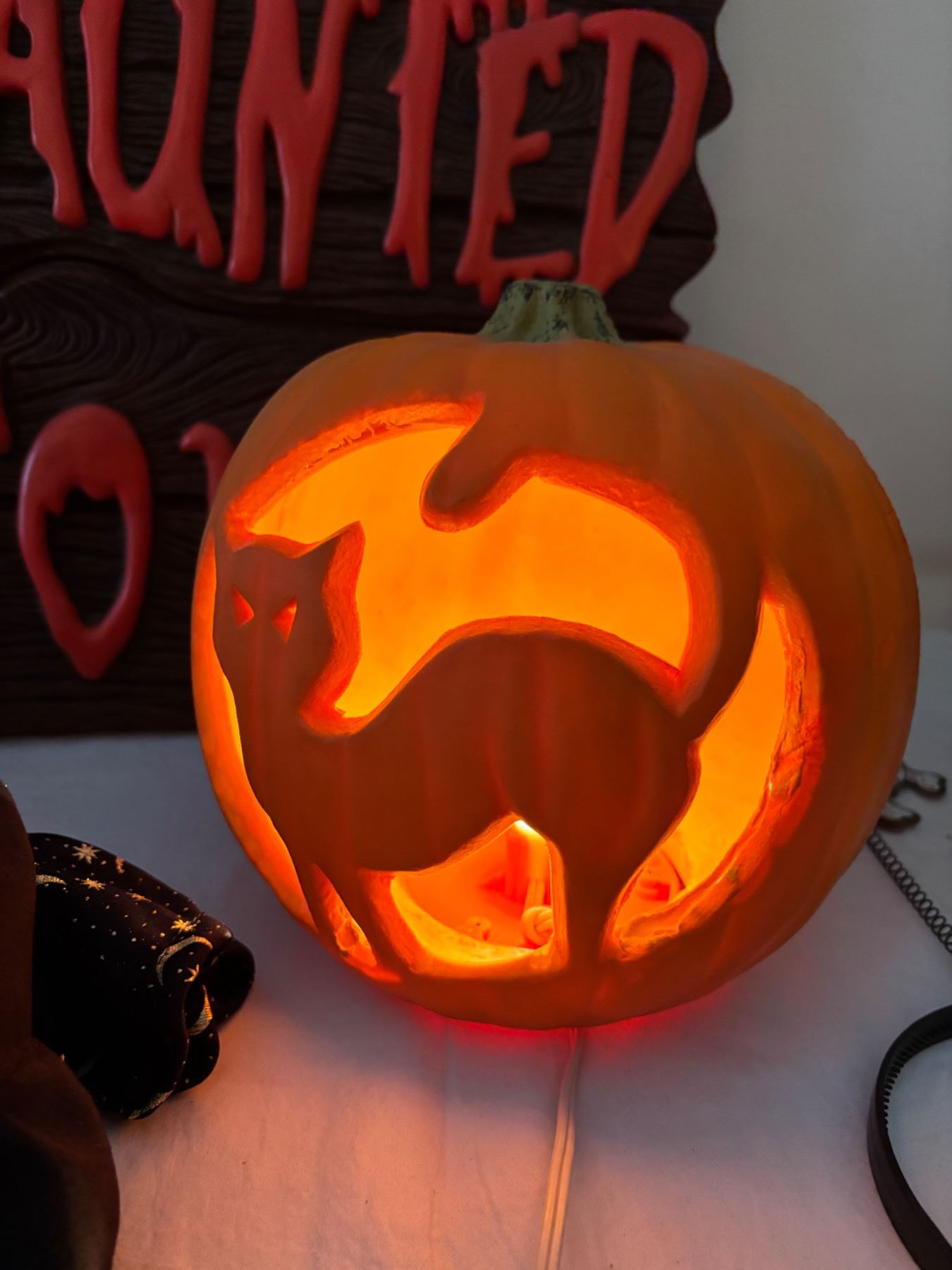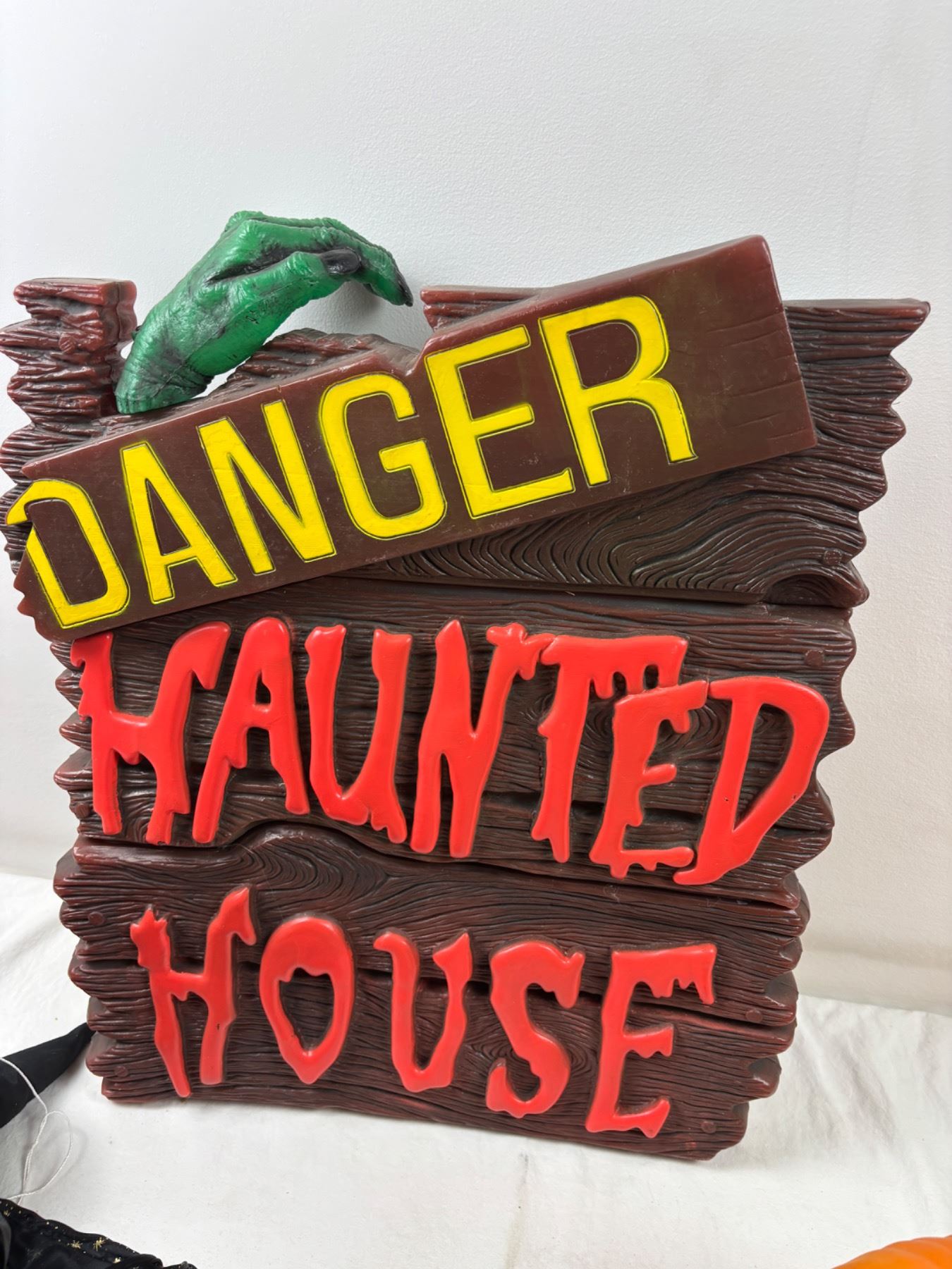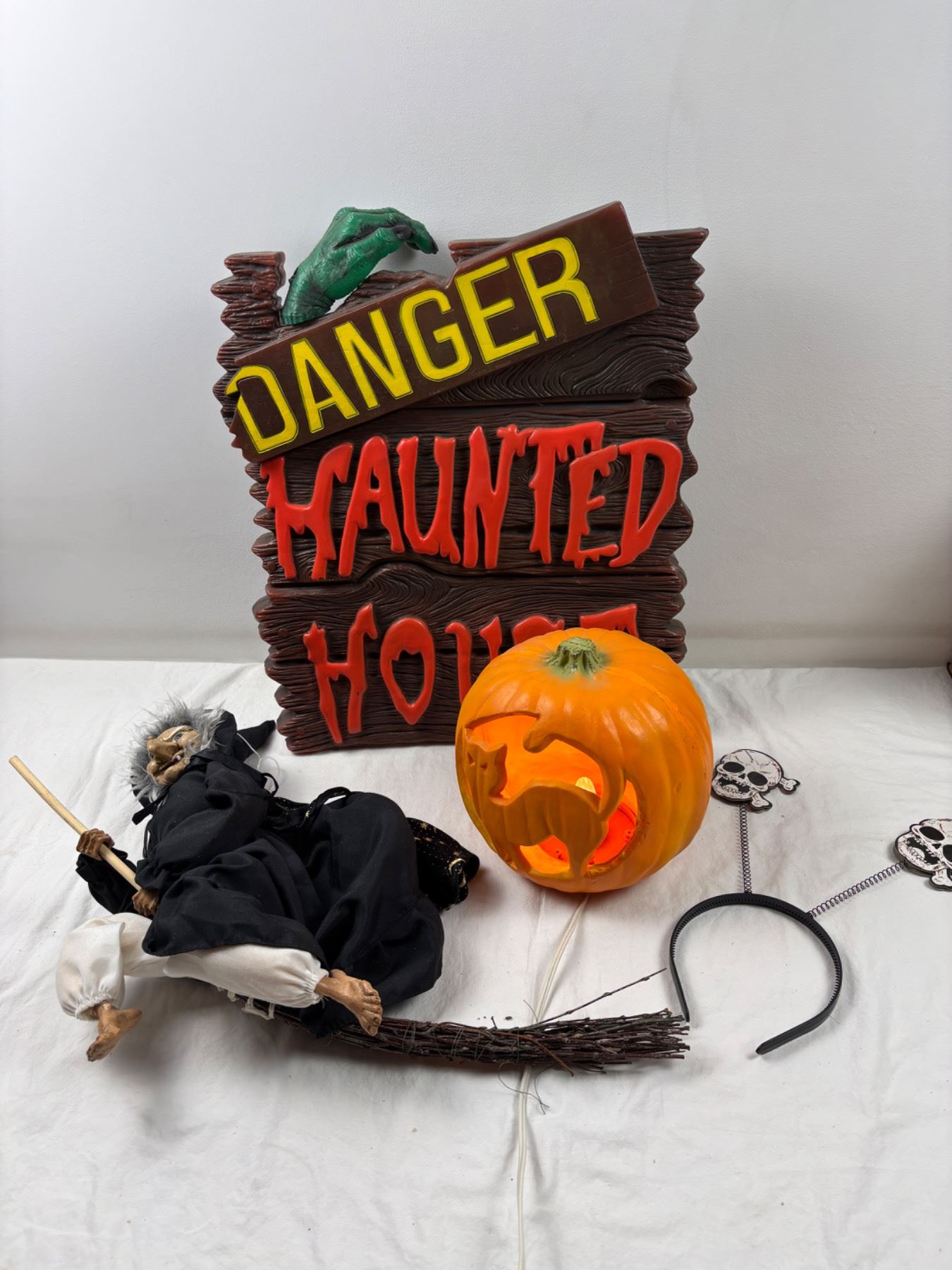 The jackolantern light does work, Haunted house sign needs batteries (not tested) 21"H x 17"W