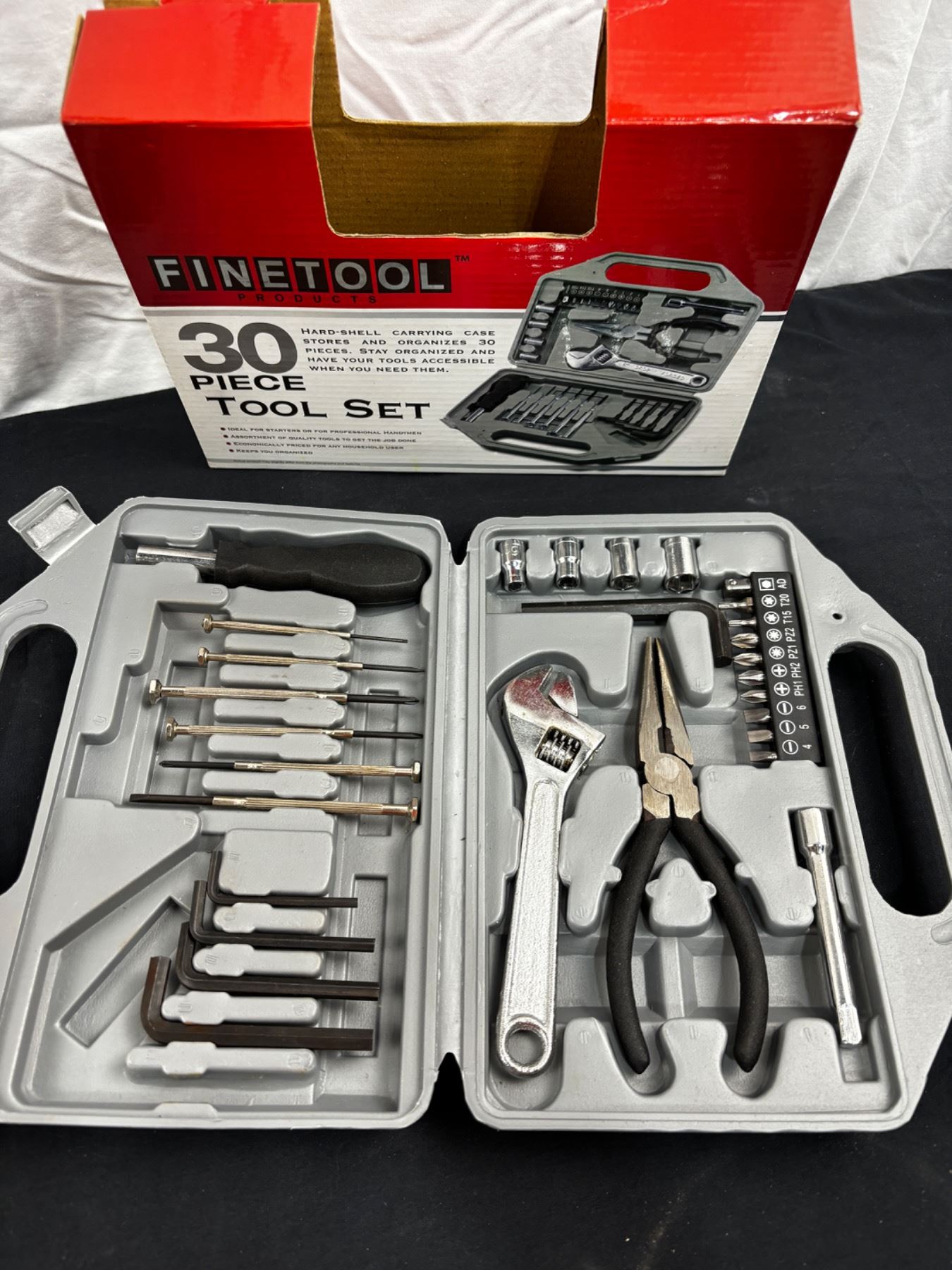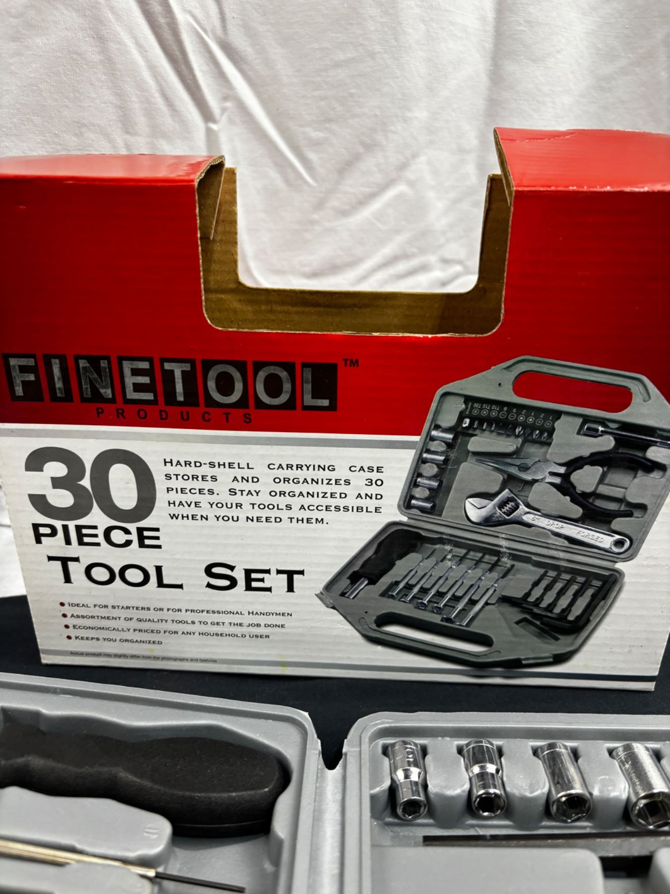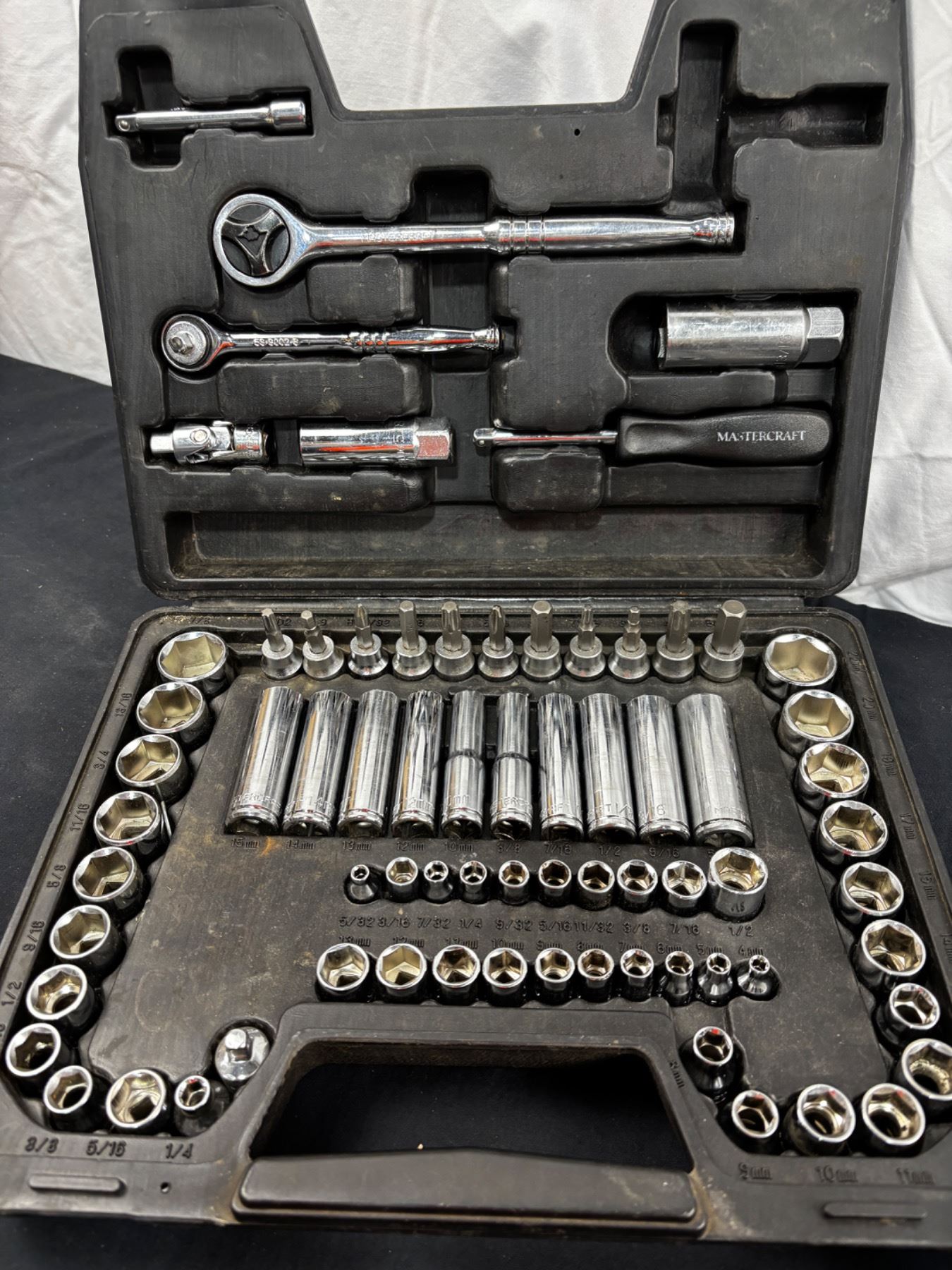 Mastercraft Ratchet set and Finetool 30 piece hand tool set. Mastercraft Kit is missing a piece out of the top right on the lid side.