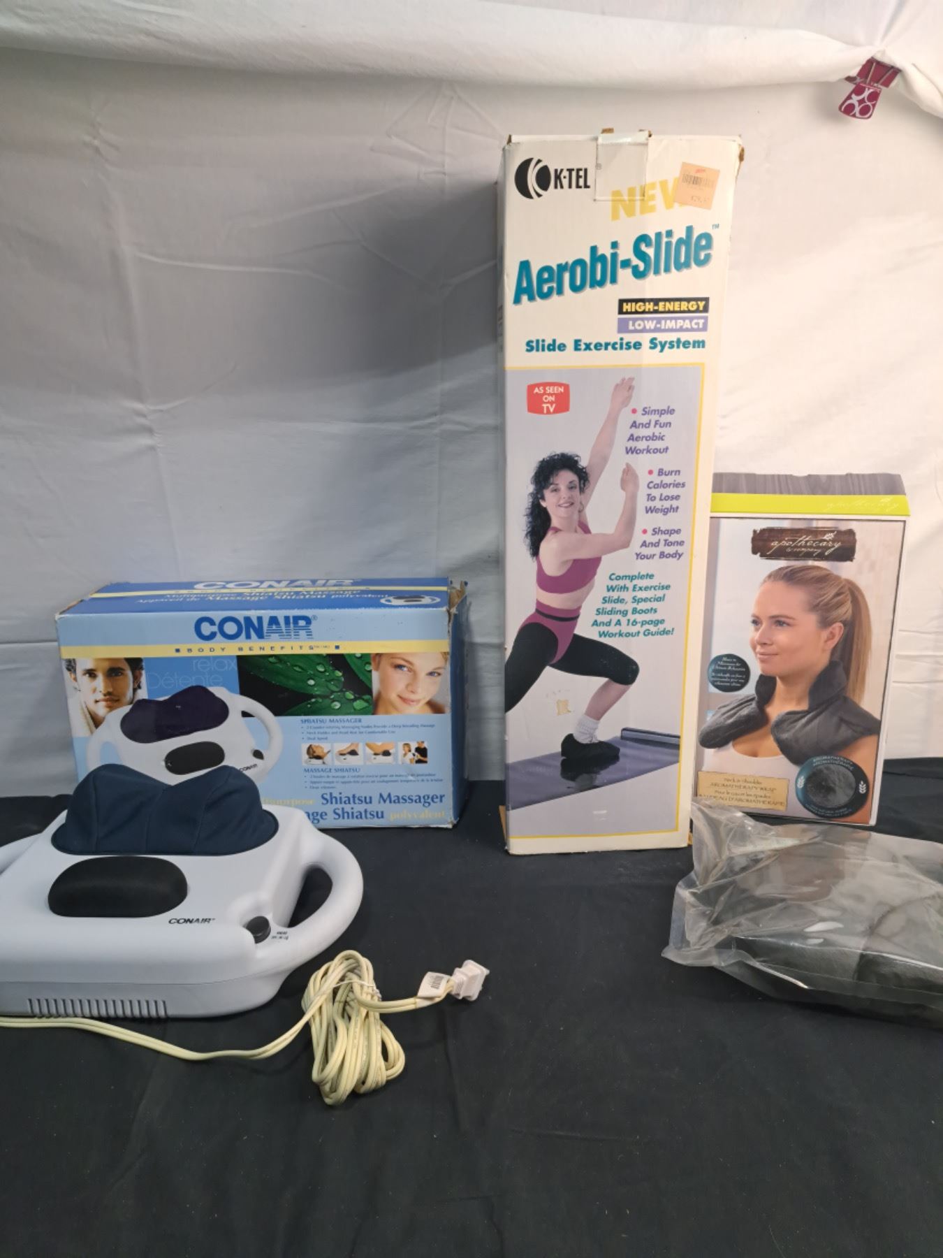 Includes Conair Shiatsu Massager (Tested), Aerobi-Slide Exercise System & Apothecary Neck & Shoulder Wrap