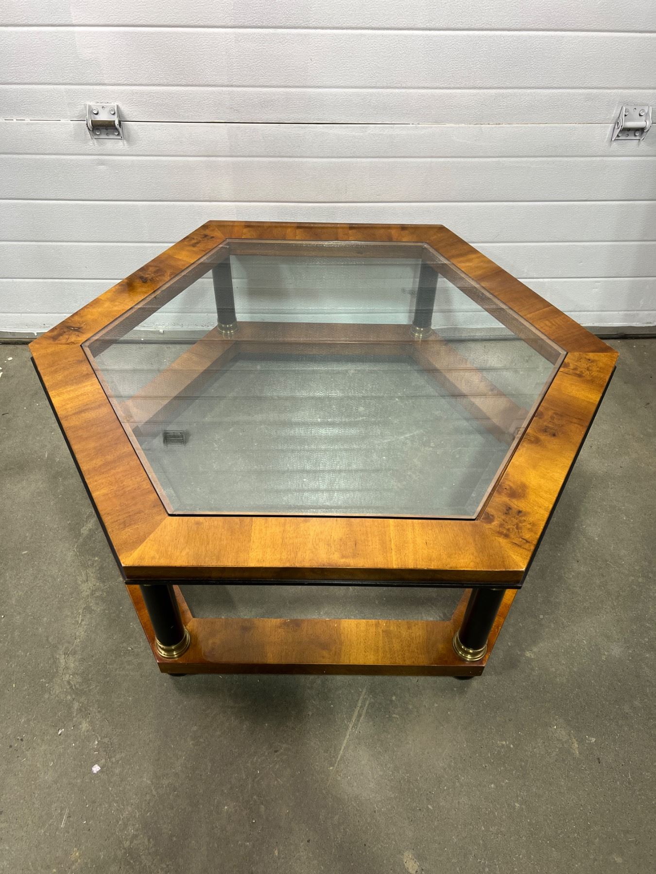Features minor damage to wood on bottom panel and exterior edge. Measures 16"H, table face measures 46" by 40"