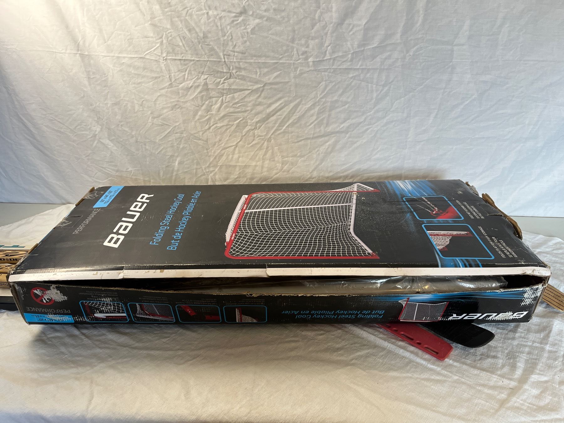 Includes Bauer Foldng Steel Hockey Goal - 60" x 44" x 20" in new condition open box - 5 hockey sticks (2) 47" long - (2) 40" long x (1) 35" long
