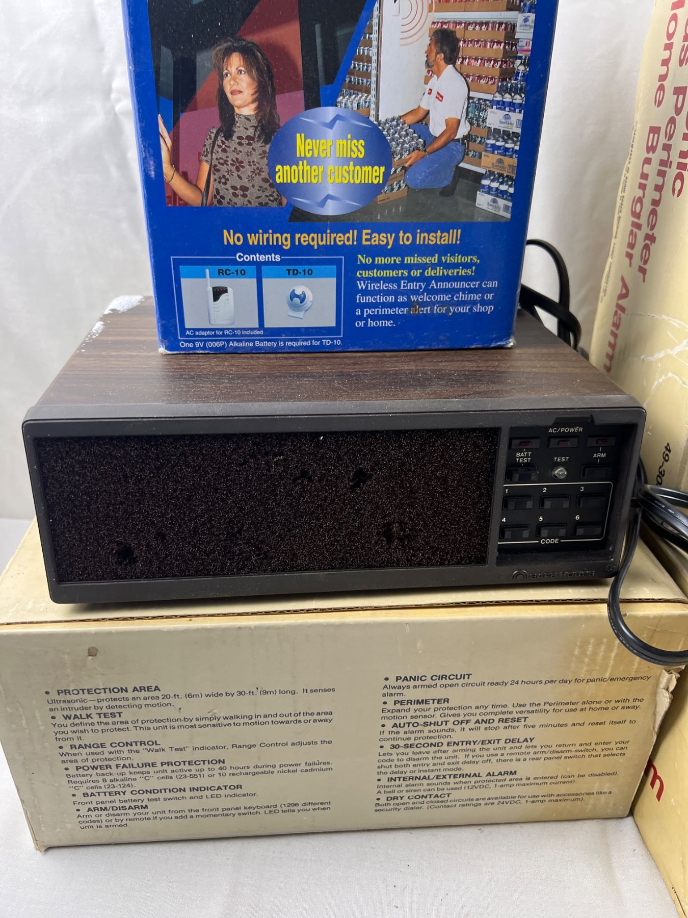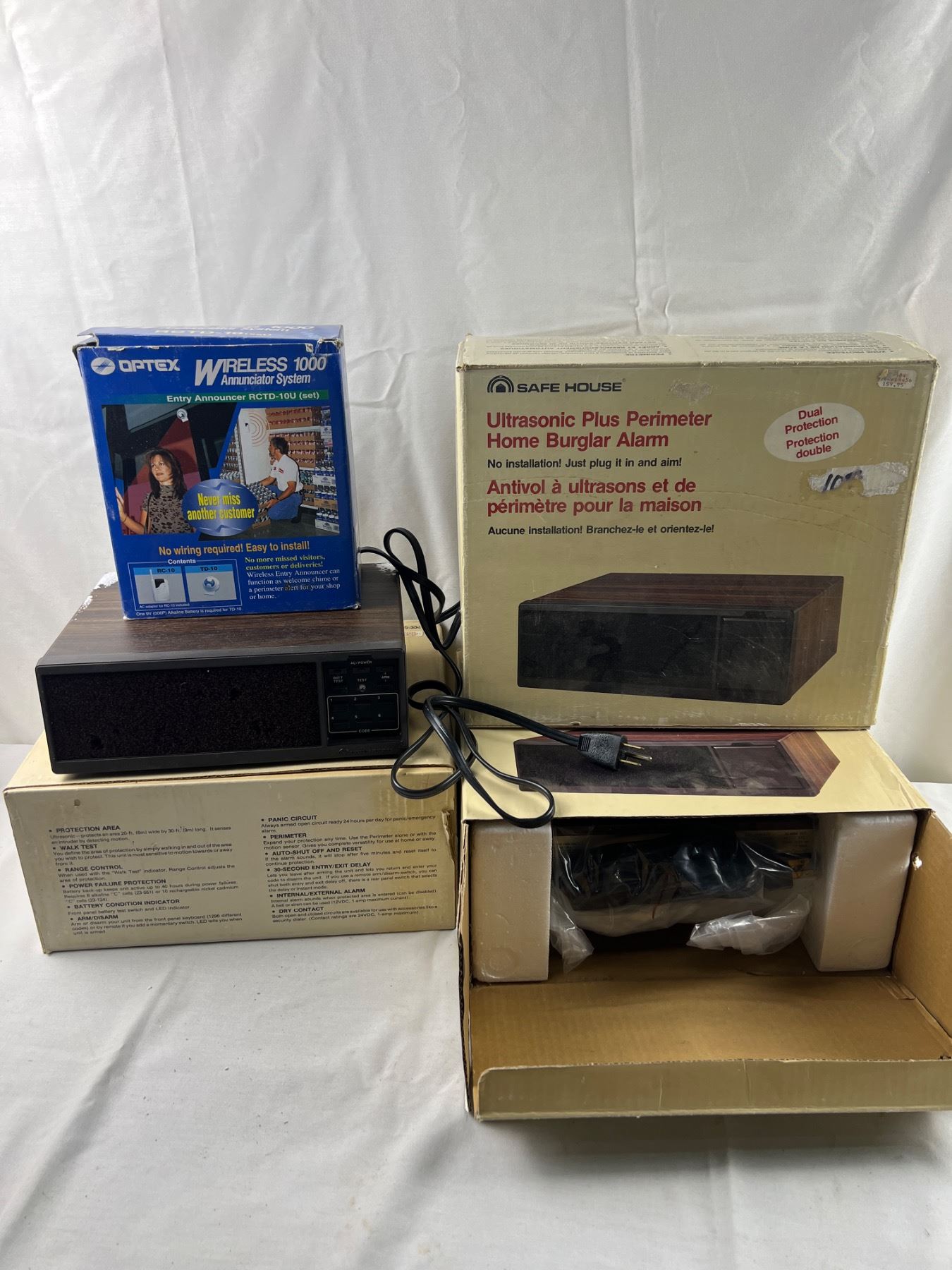 Open boxes, Includes three Safe House Ultrasonic Plus Perimeter Home Burglar Systems, Opted Wireless 1000 Annunciator System, not tested