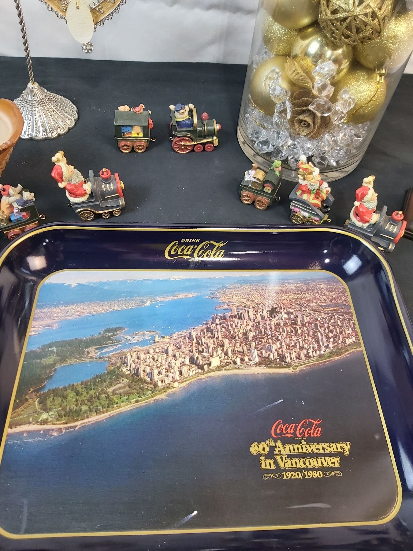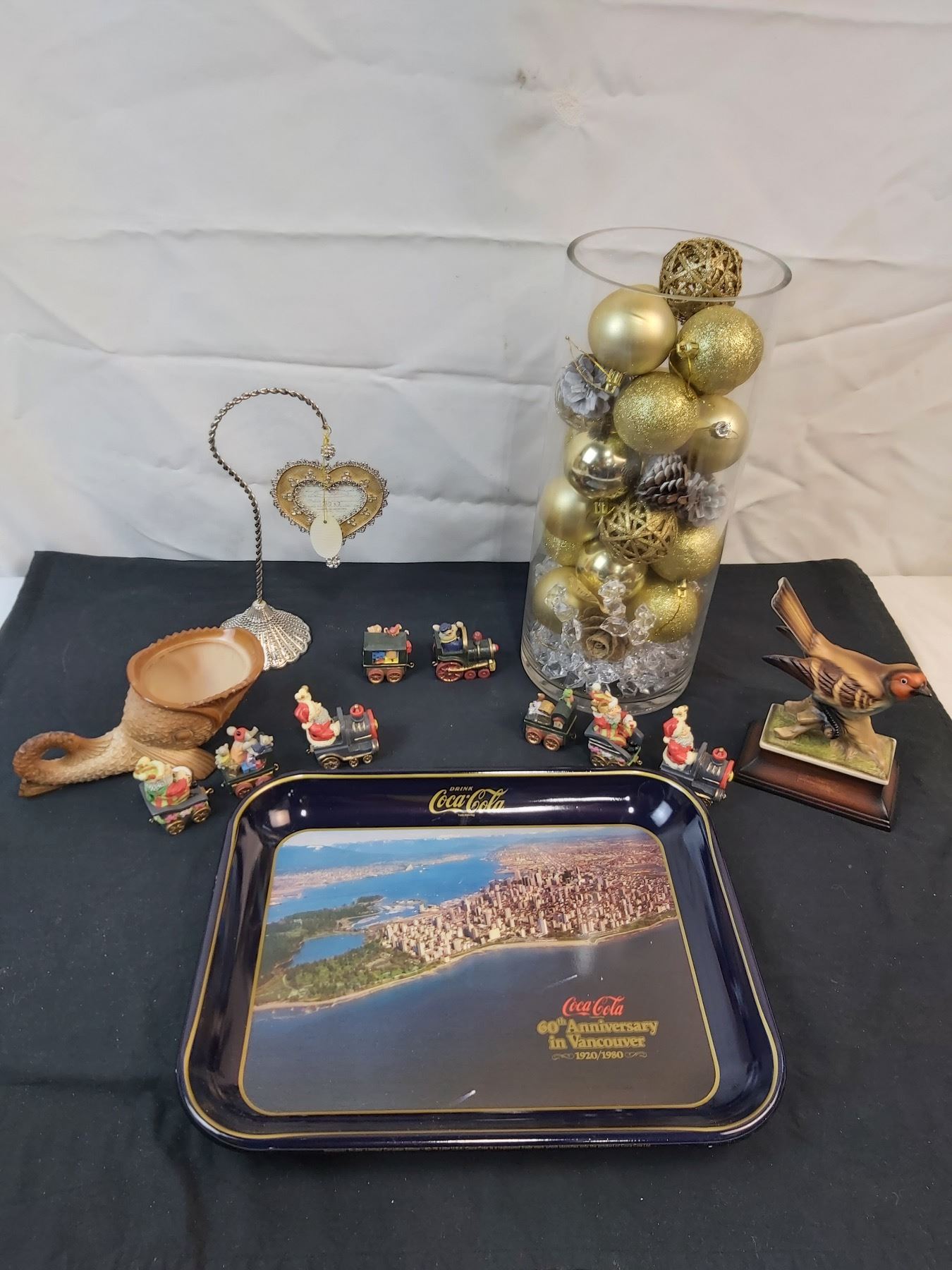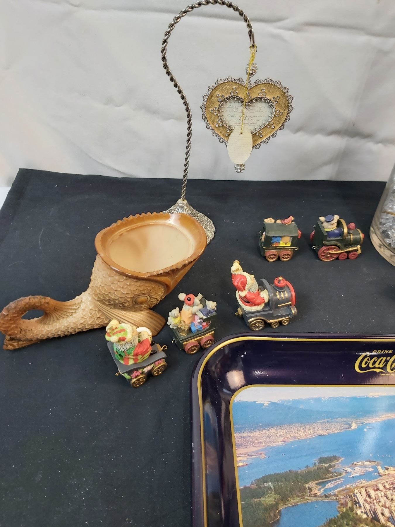 Includes, Coca-Cola Tray (13x10.5"), Hook is missing on one Santa train, Bird decor signed "DK", Feminine Reflections handing photo frame (2.5x2") etc.