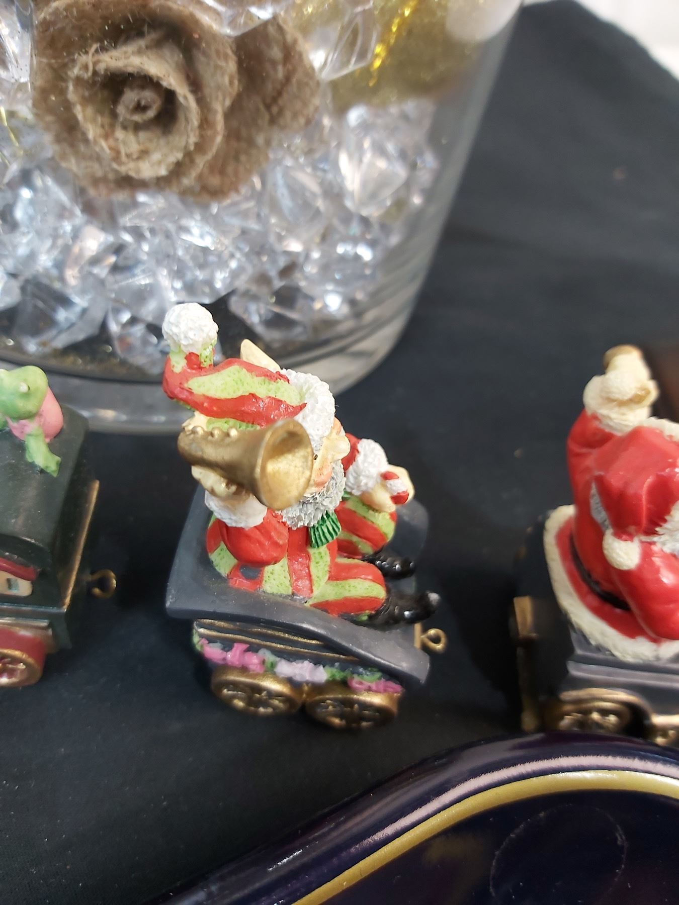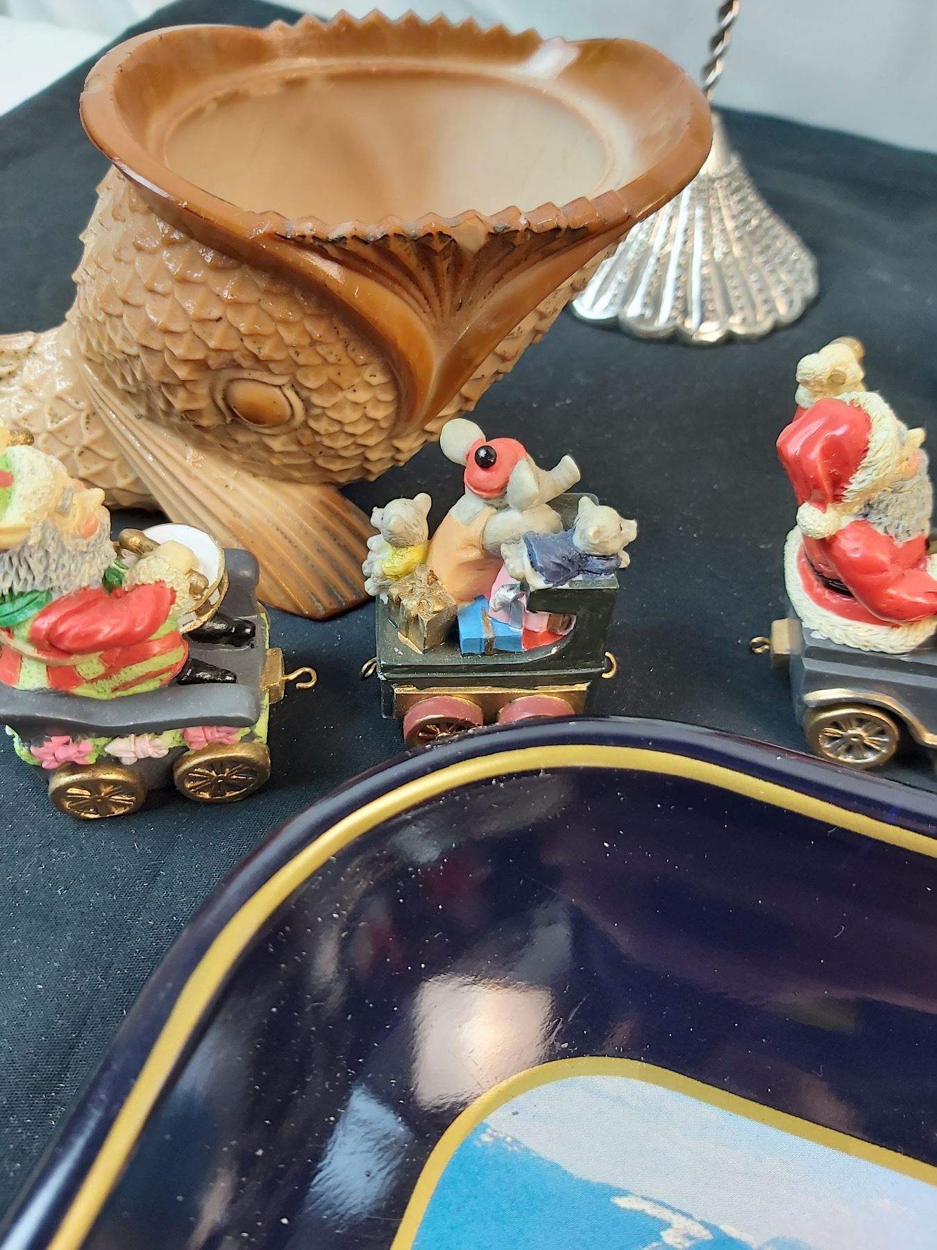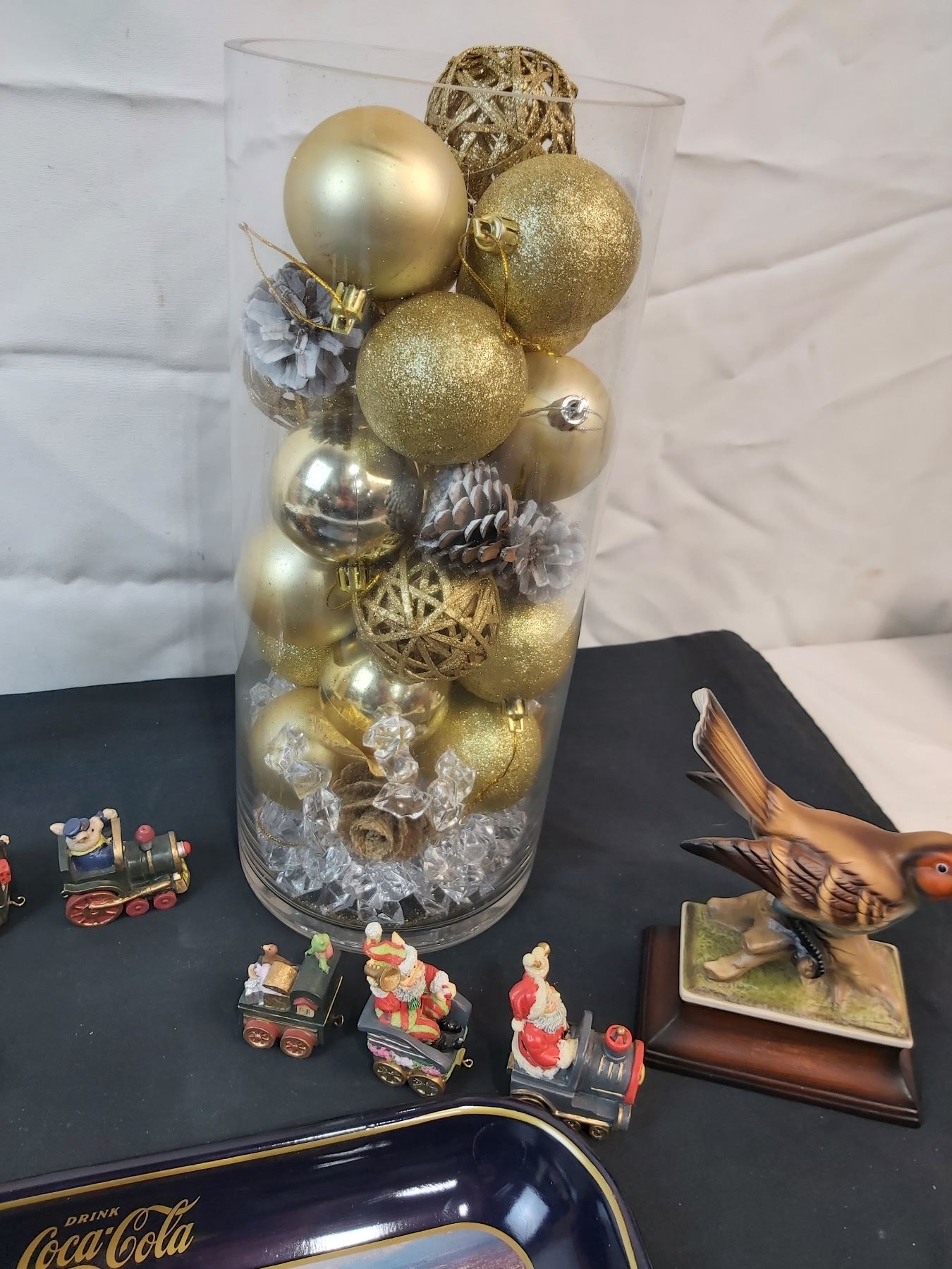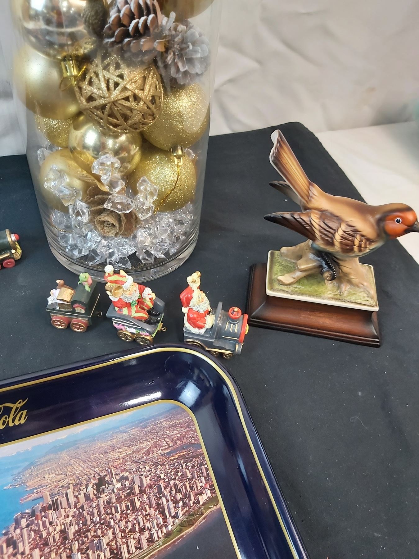 Includes, Coca-Cola Tray (13x10.5"), Hook is missing on one Santa train, Bird decor signed "DK", Feminine Reflections handing photo frame (2.5x2") etc.