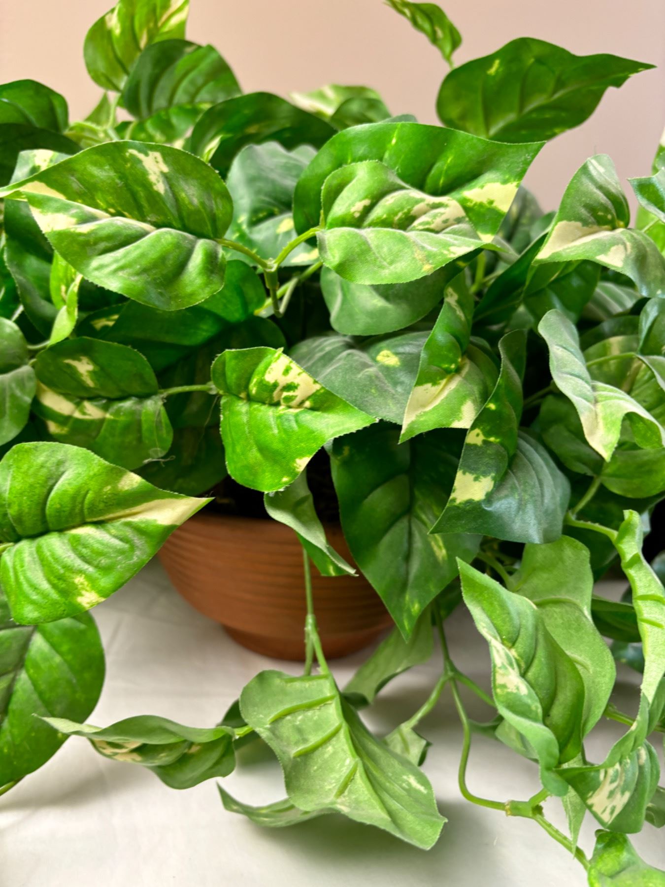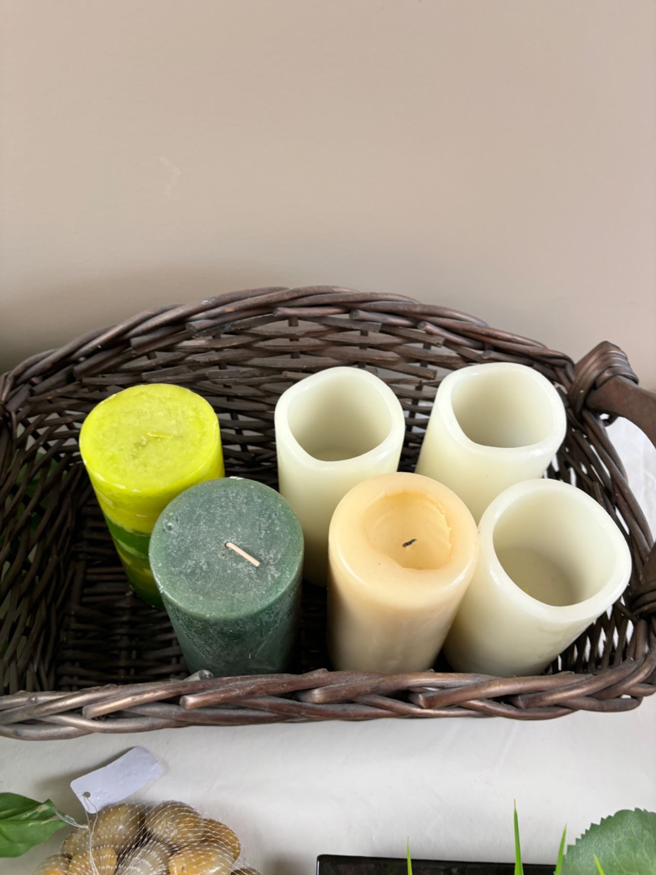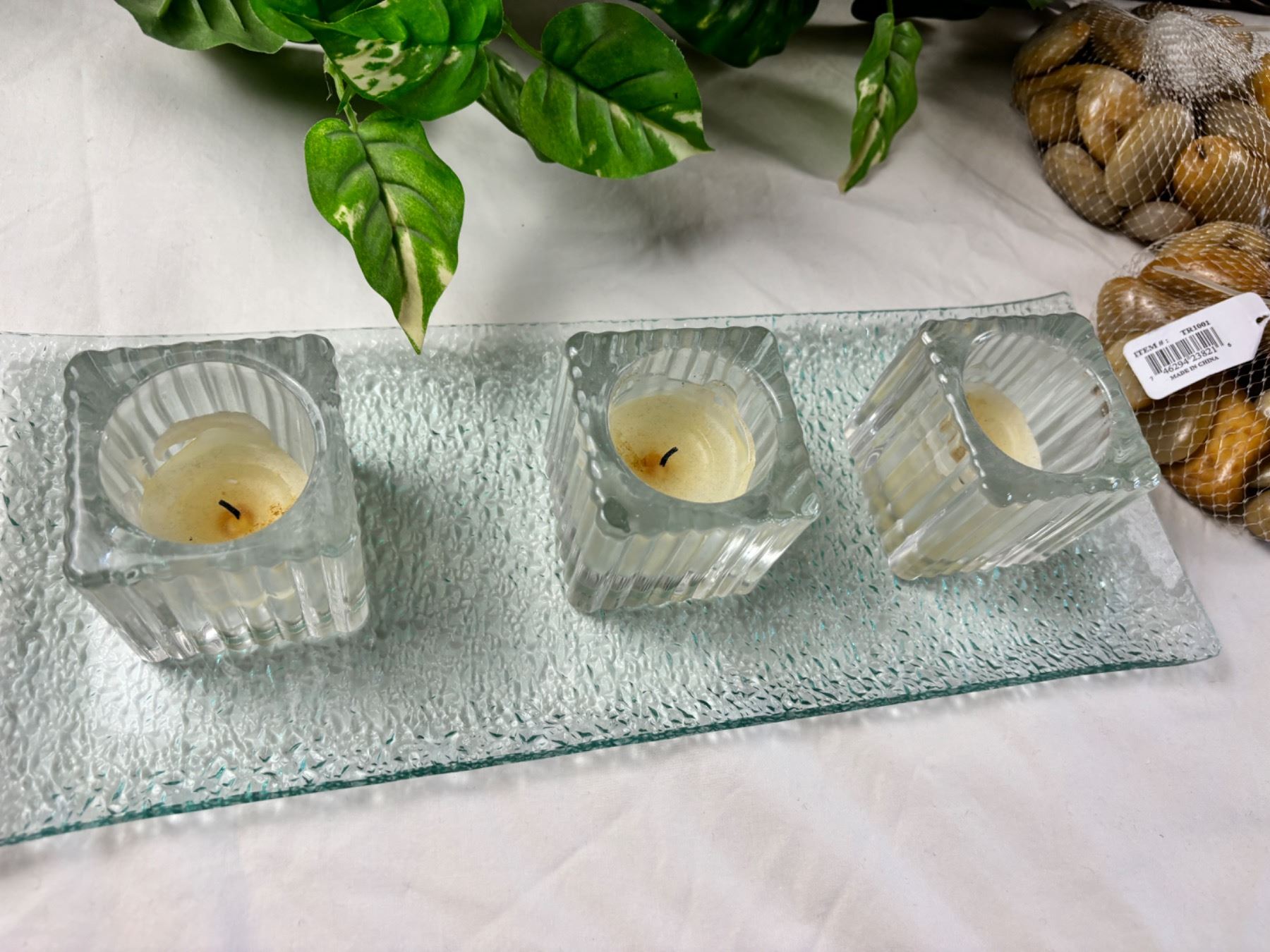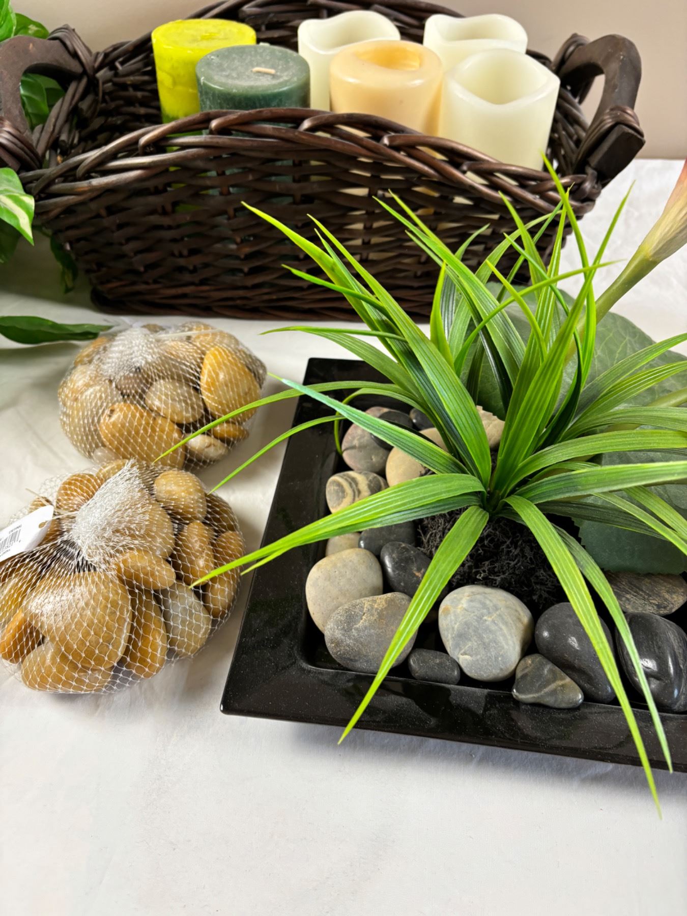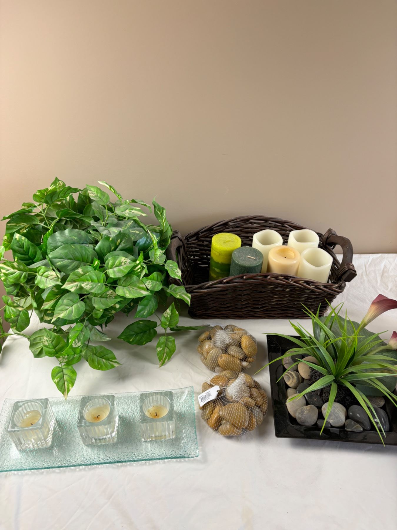 Includes, Candles, decorative pebbles, faux potted vine (12"H)