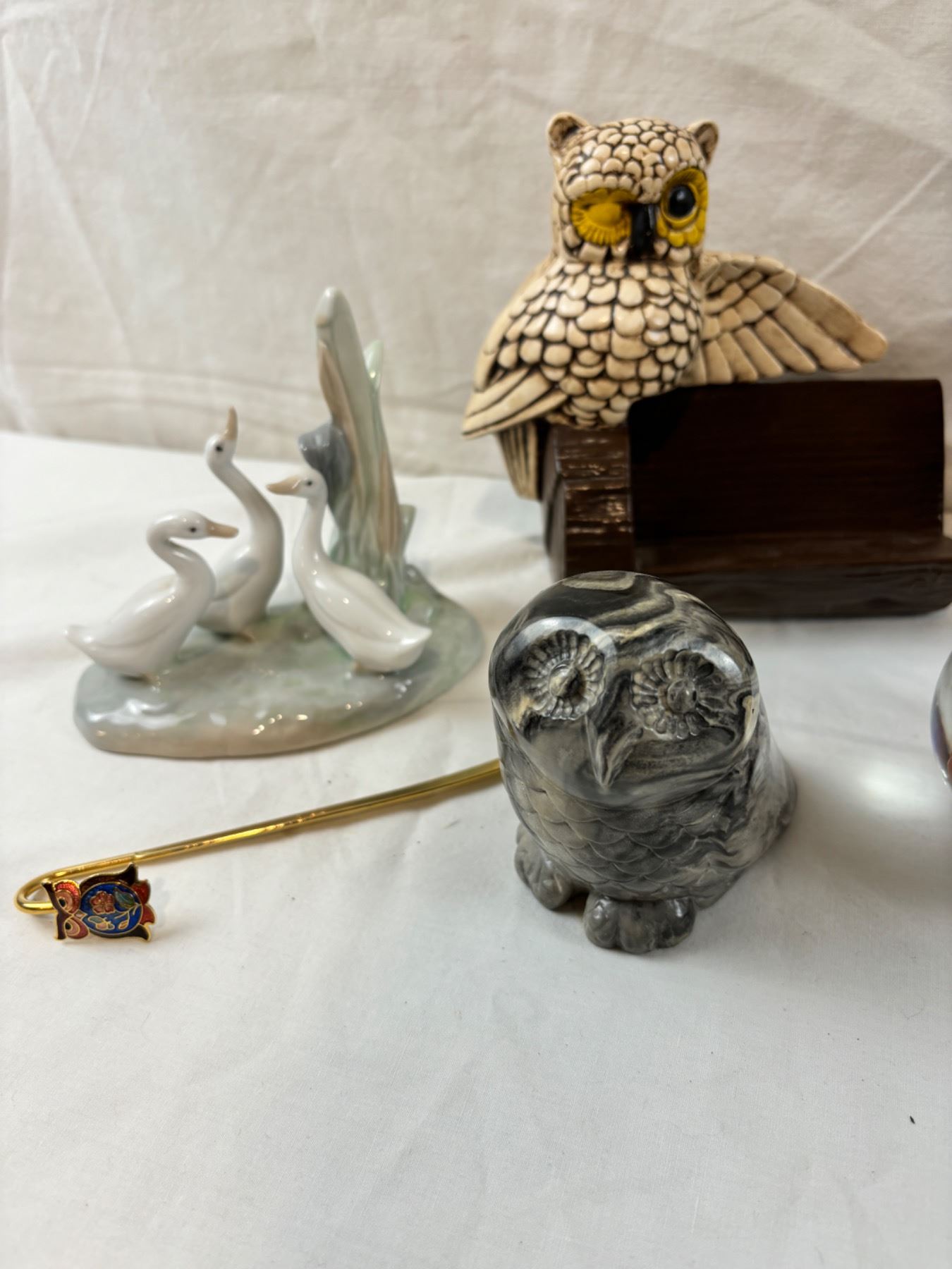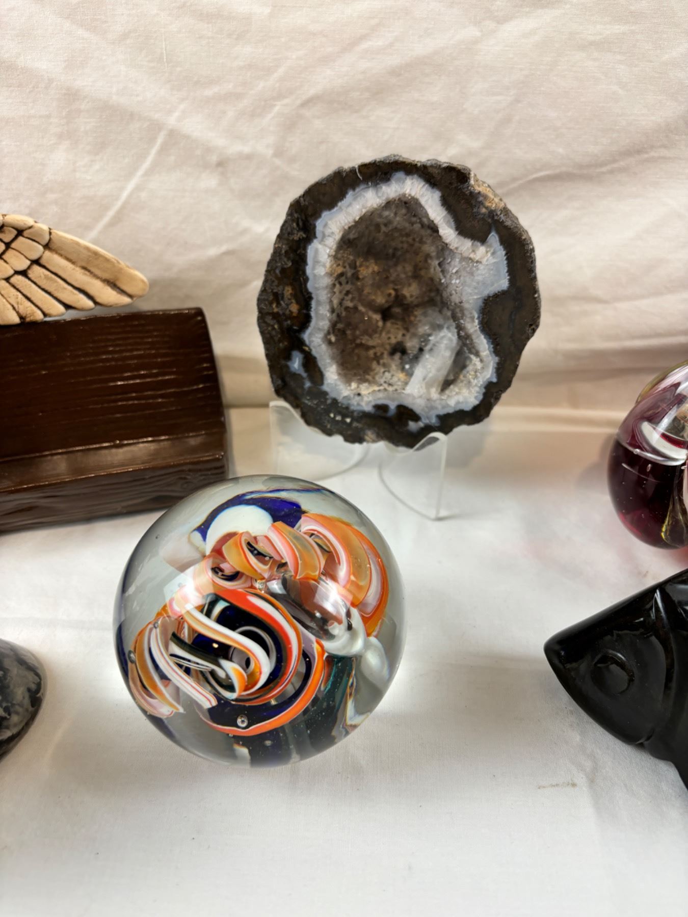 Includes, Geode with stand, art glass bird, stone carved animals, etc.