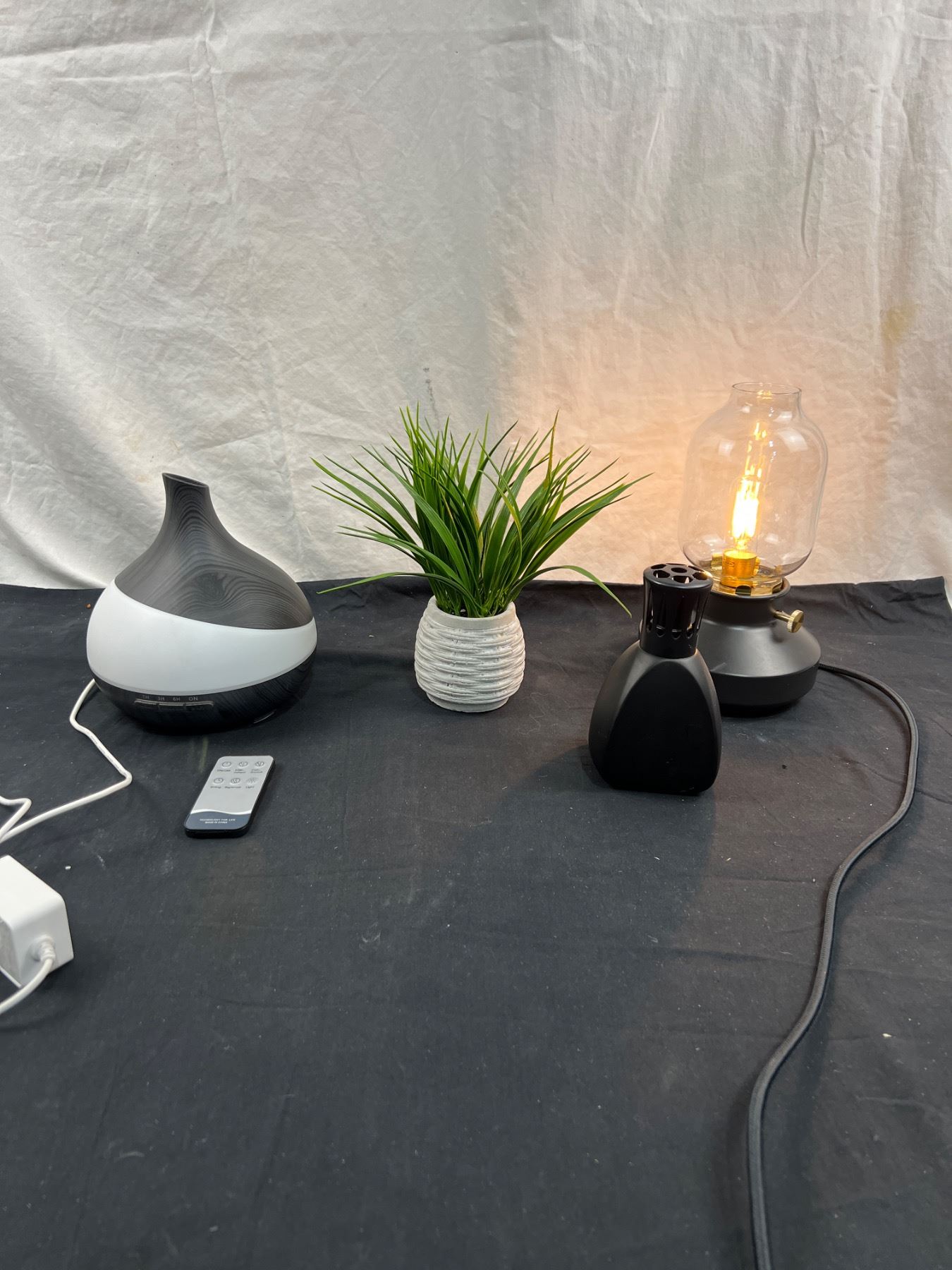 Includes, Essential Oil Diffuser with remote (works), Ikea Tarnaby Dimmable Table lamp (works) 10"H, and more