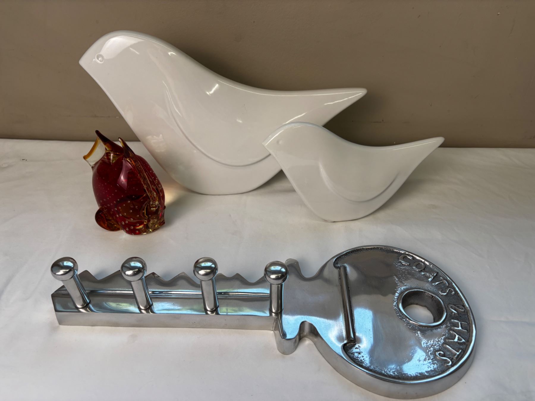 Includes, Wall mounted key hook (16x7"), Arte Murano Icet fish, Ceramic bird figures
