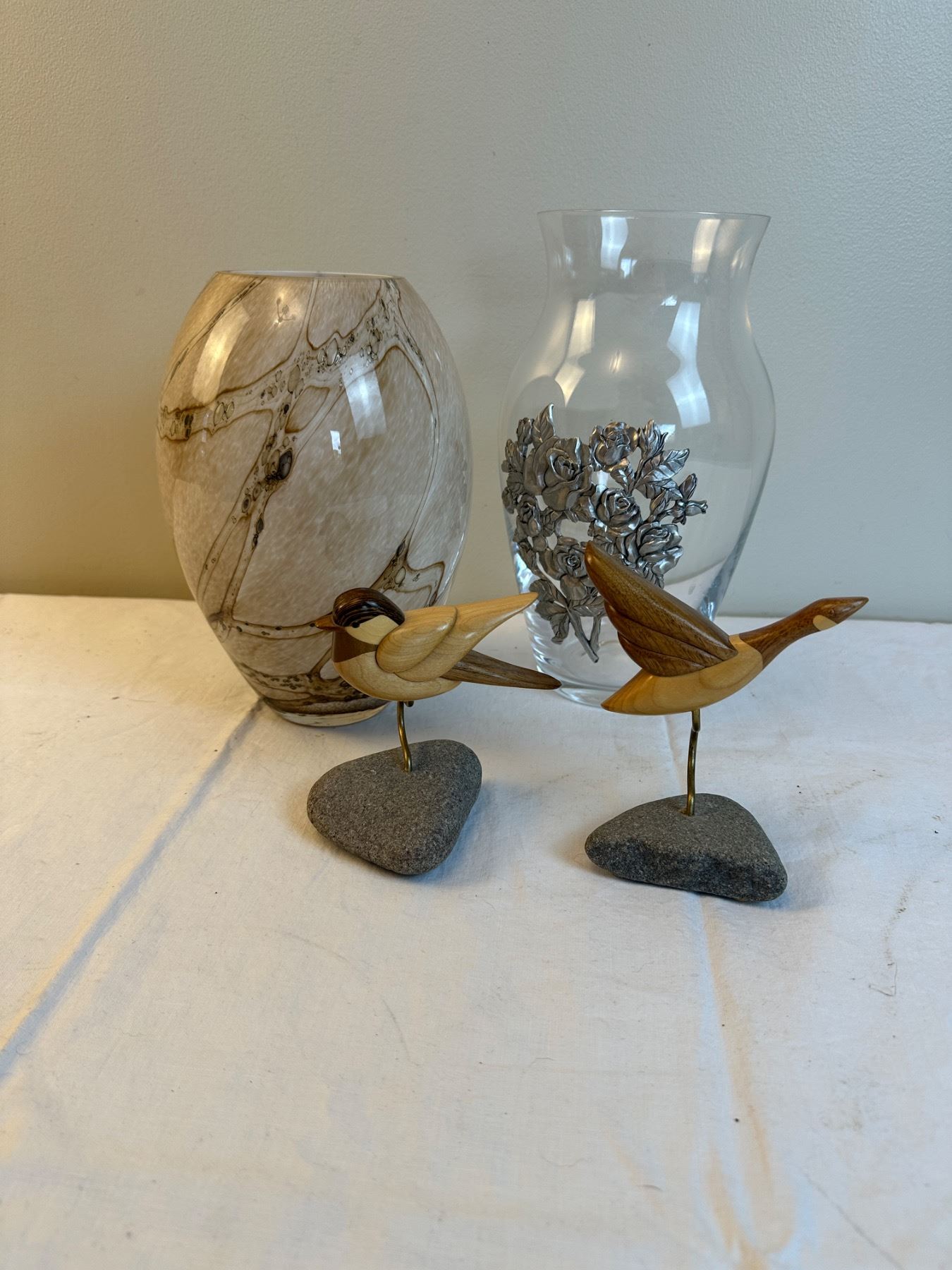 Includes Wood Designs by Arbour wood birds on rocks - bird is 4.5" x 4.5" - goose is 5 1/4" x 5" - Glass vase with metal art is 10" tall - brown swirl vase is 9.5" tall