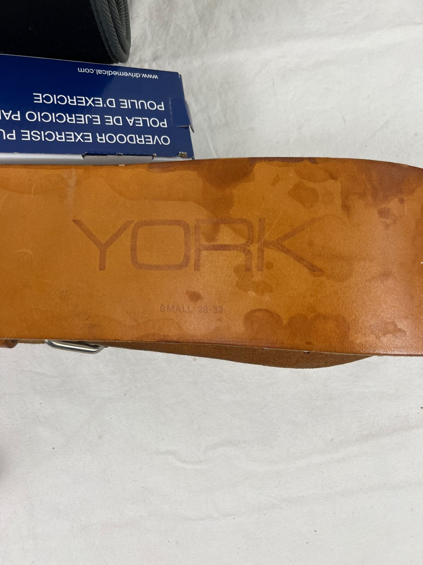 Includes variety of weights, pulley system, small York lifting belt and more!