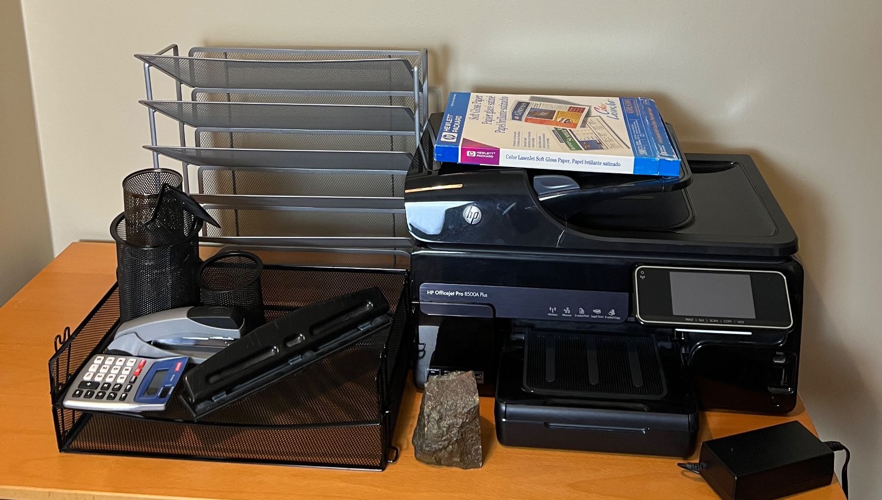 Printer powers on. Large tray shelf stands 16" wide and 17" tall