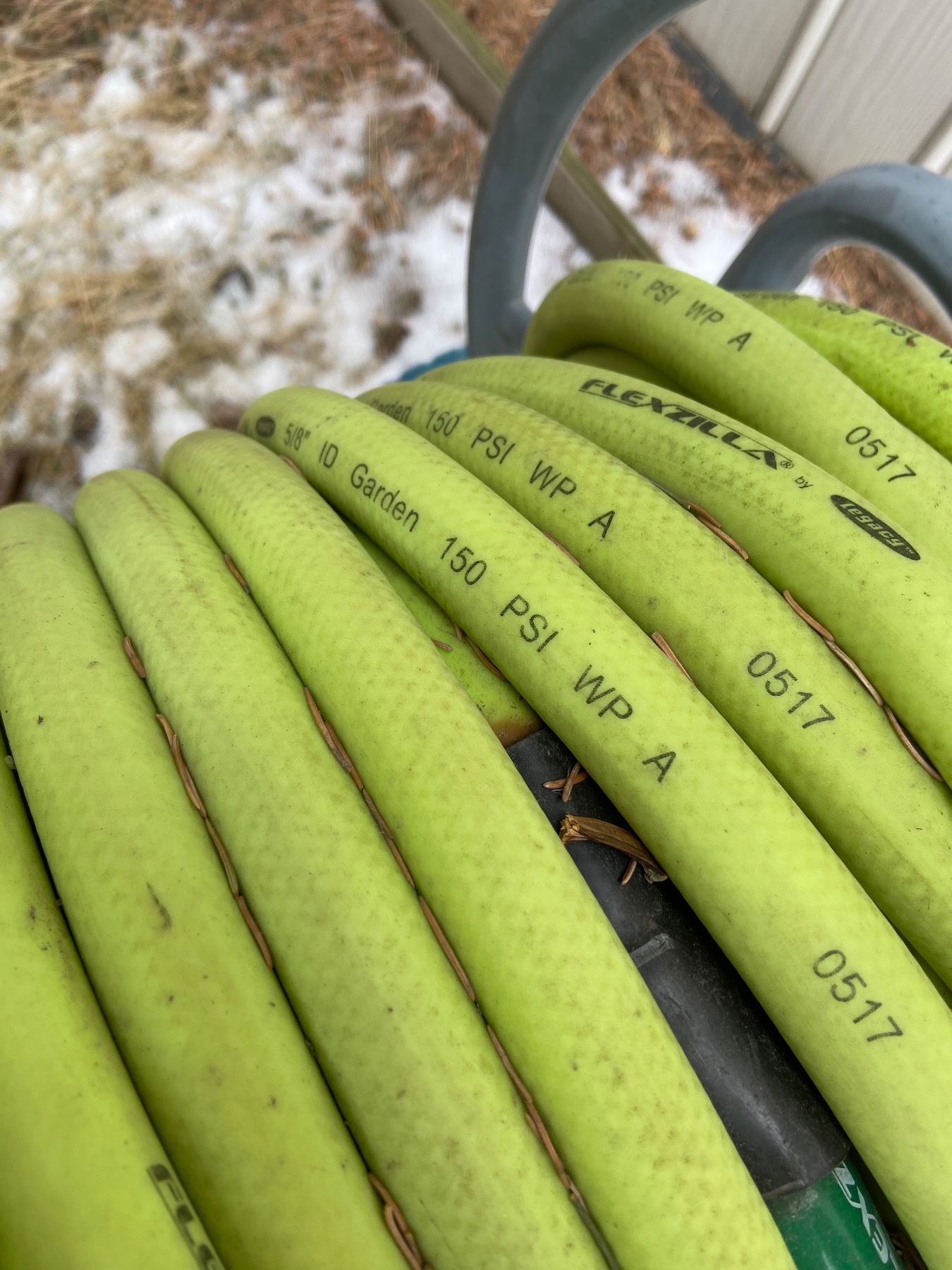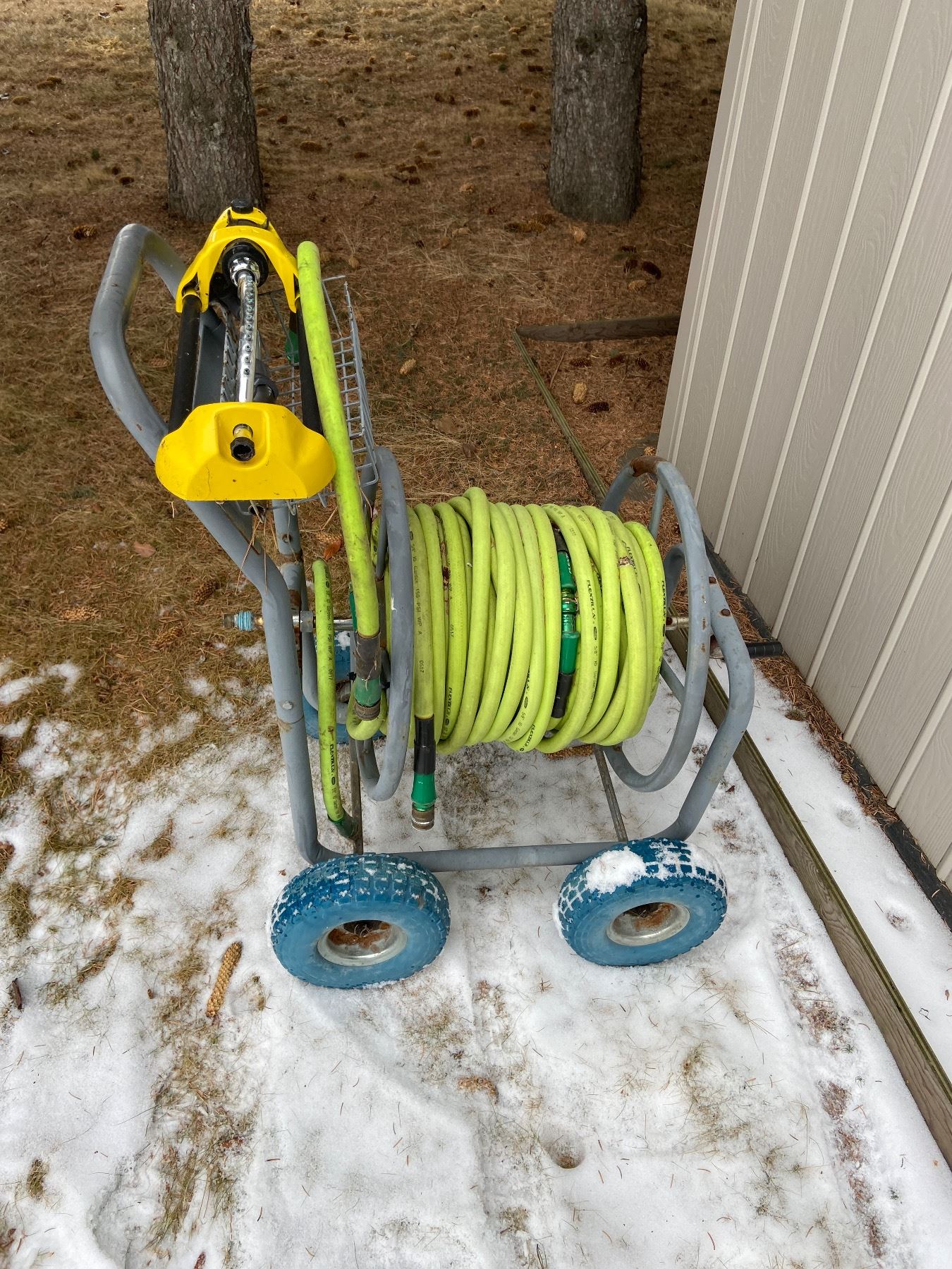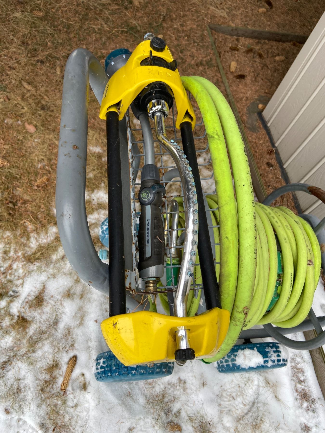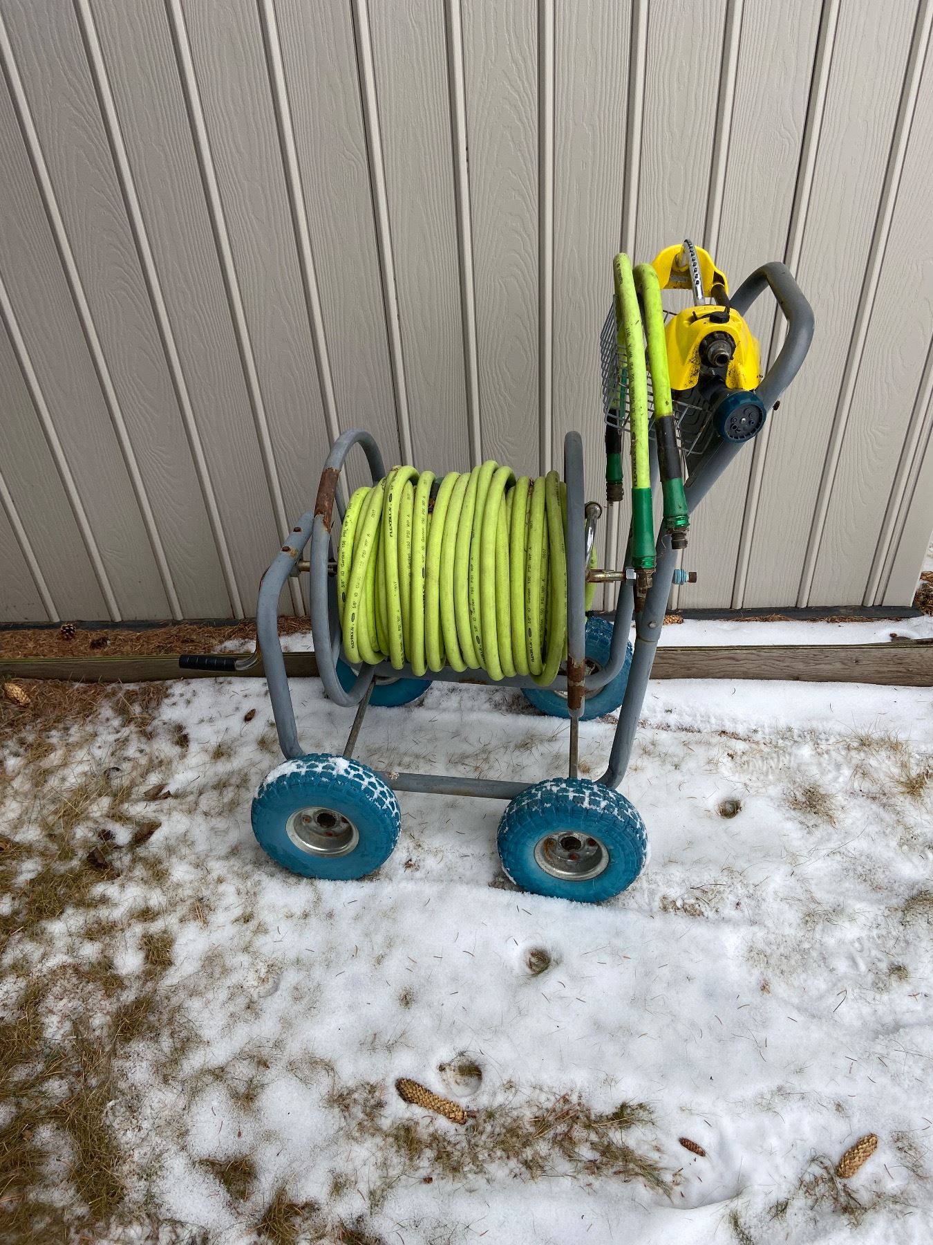 Includes, sprinkler, spray wand, extension hoses, has some rust