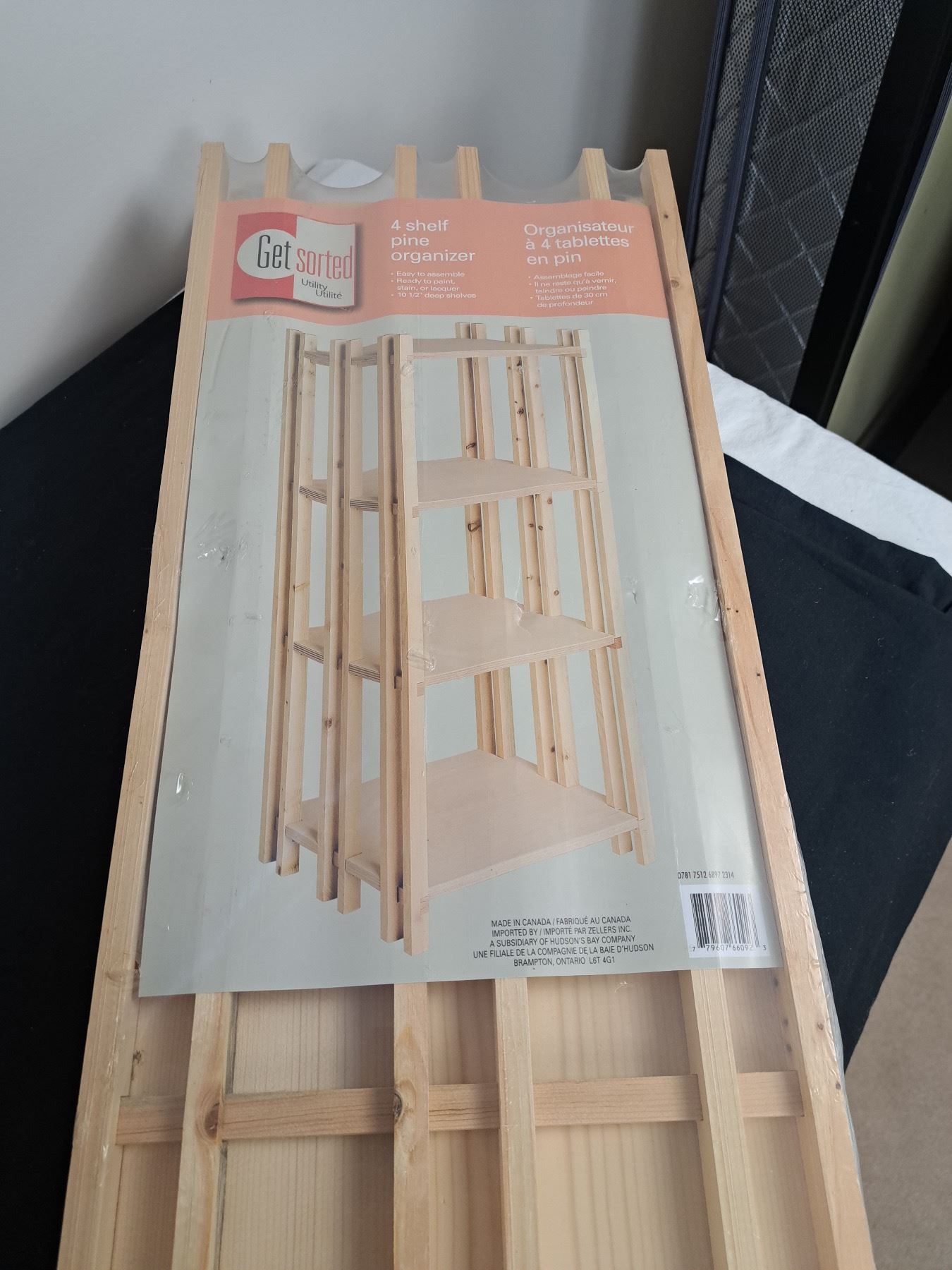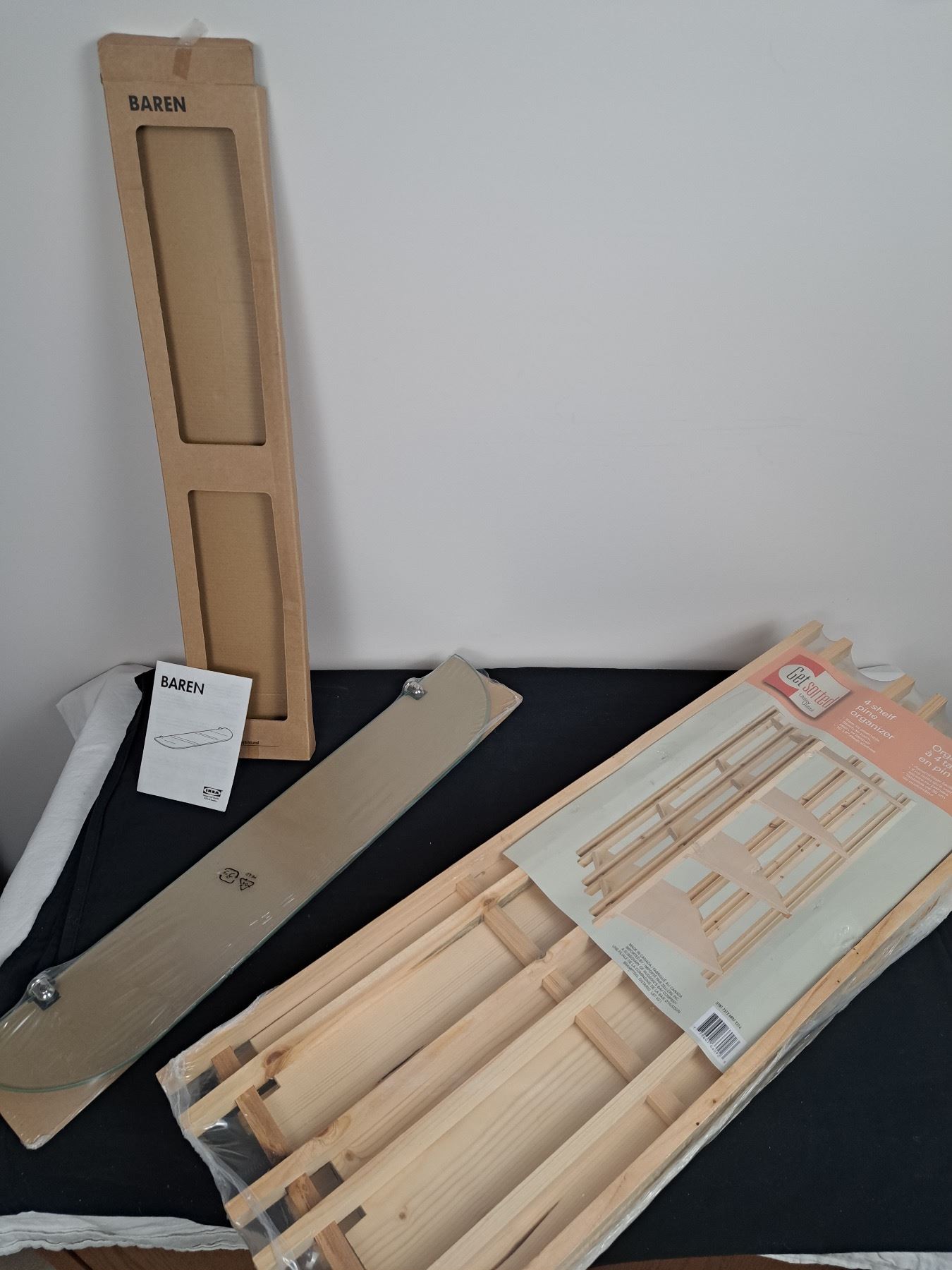 Includes a 4 Shelf Pine Organizer (1.5'D), Ikea Baren glass shelf