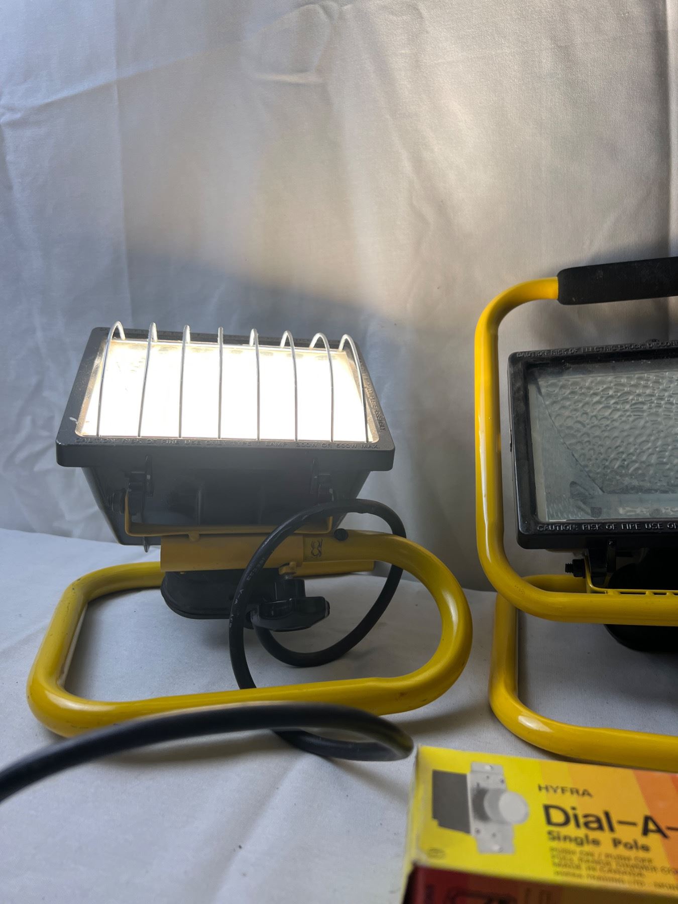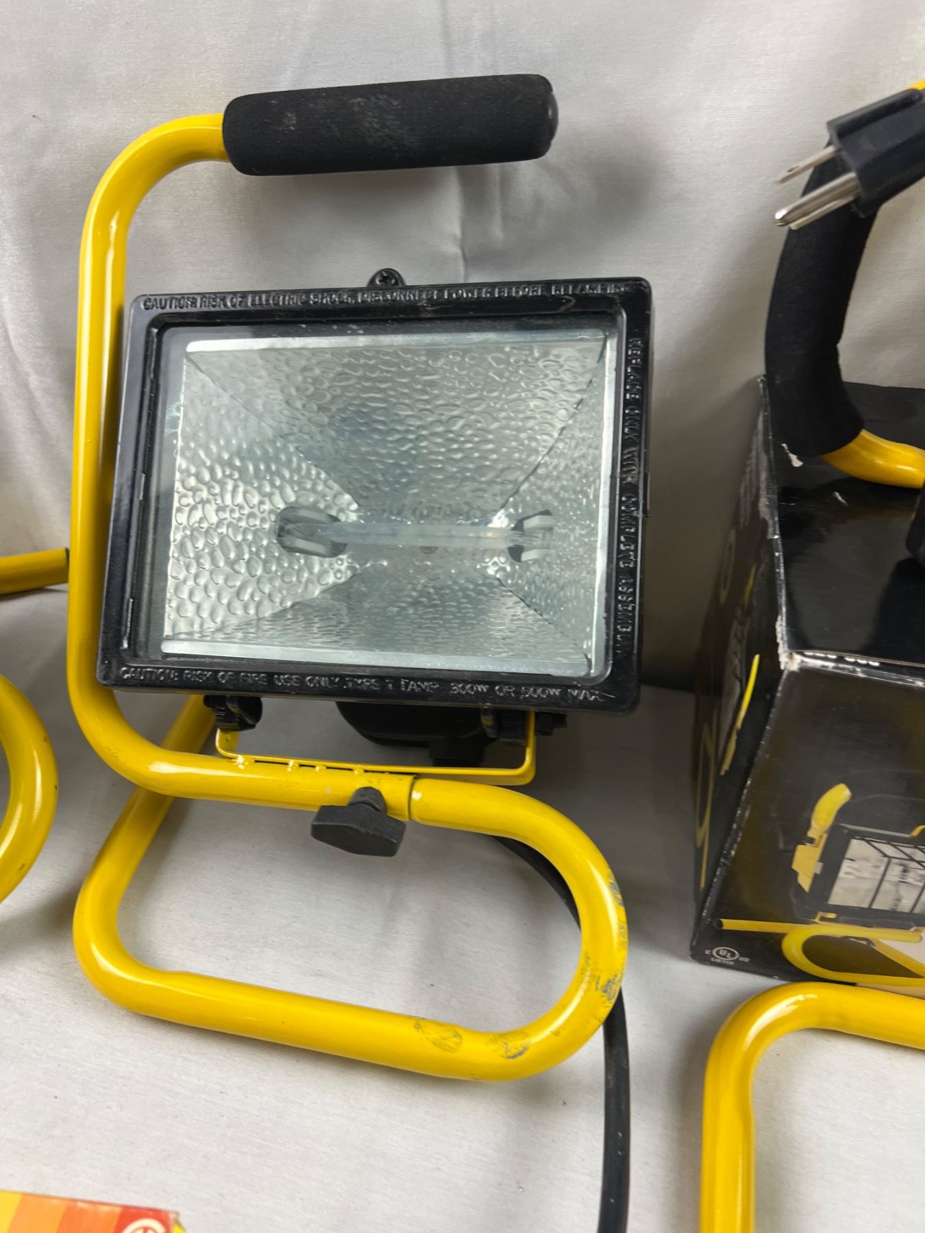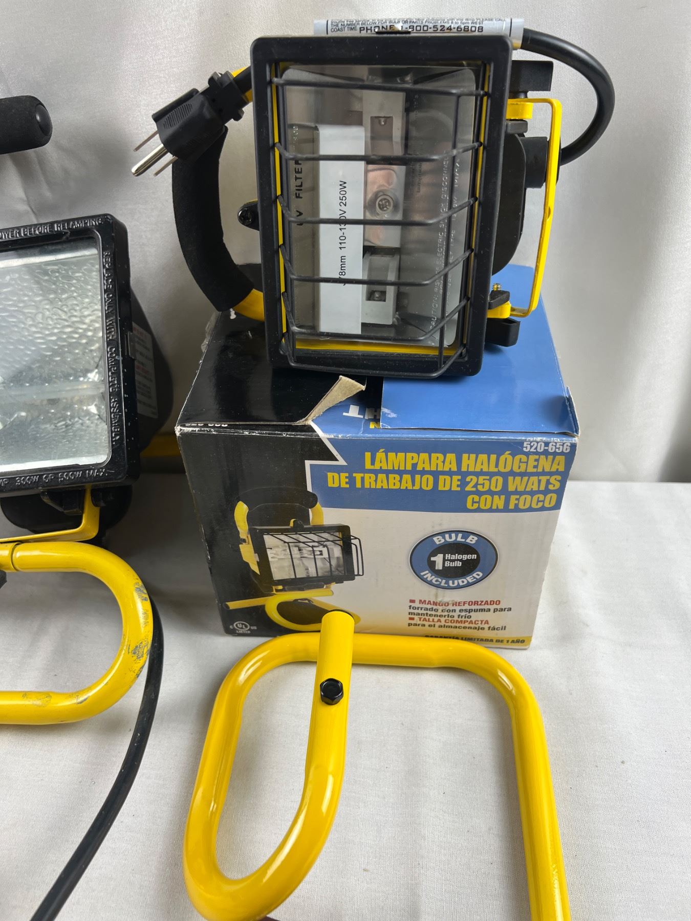 Two of the work lights are in working condition (7.5"H), 250 Watt Halogen Worklight (open box)