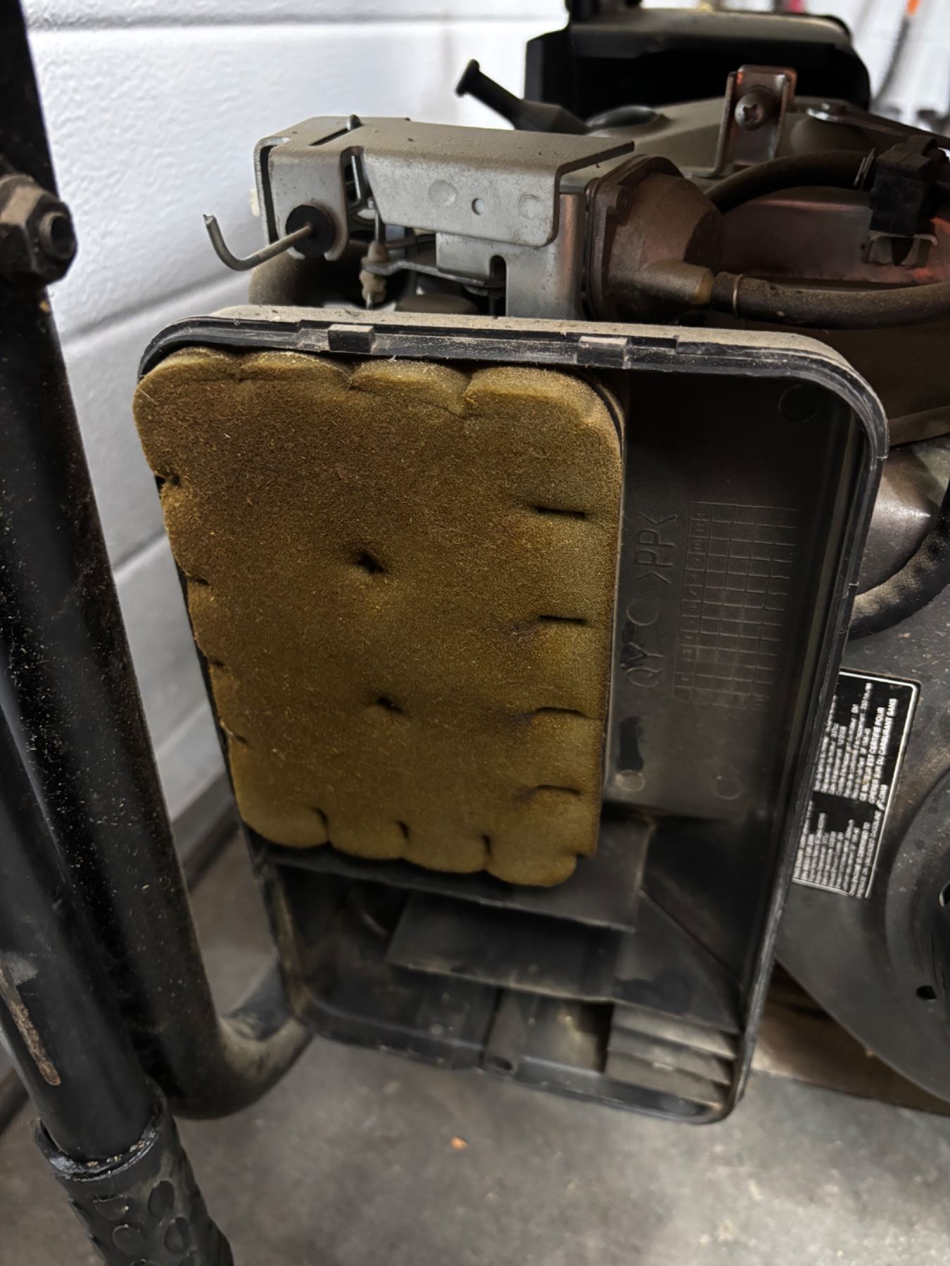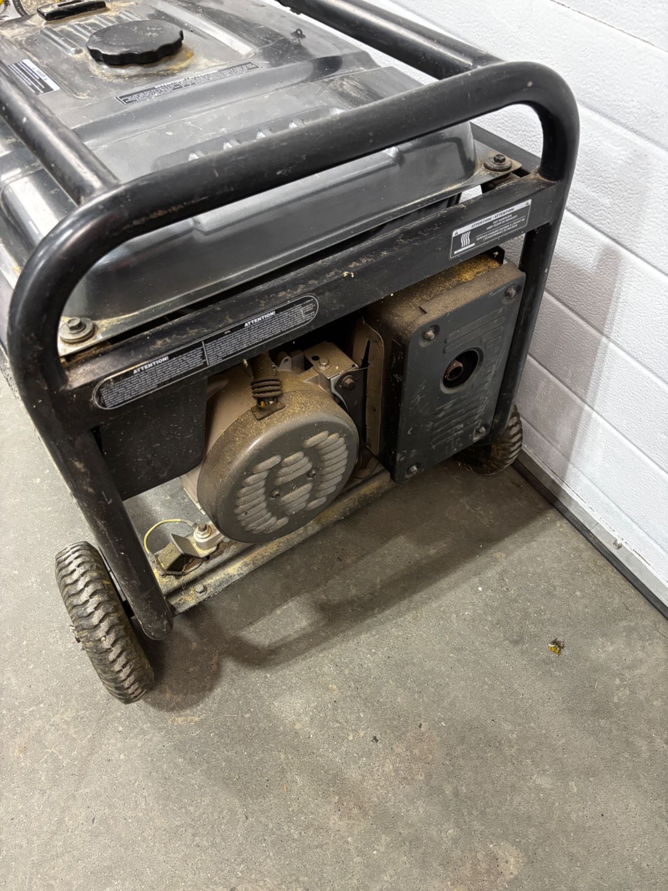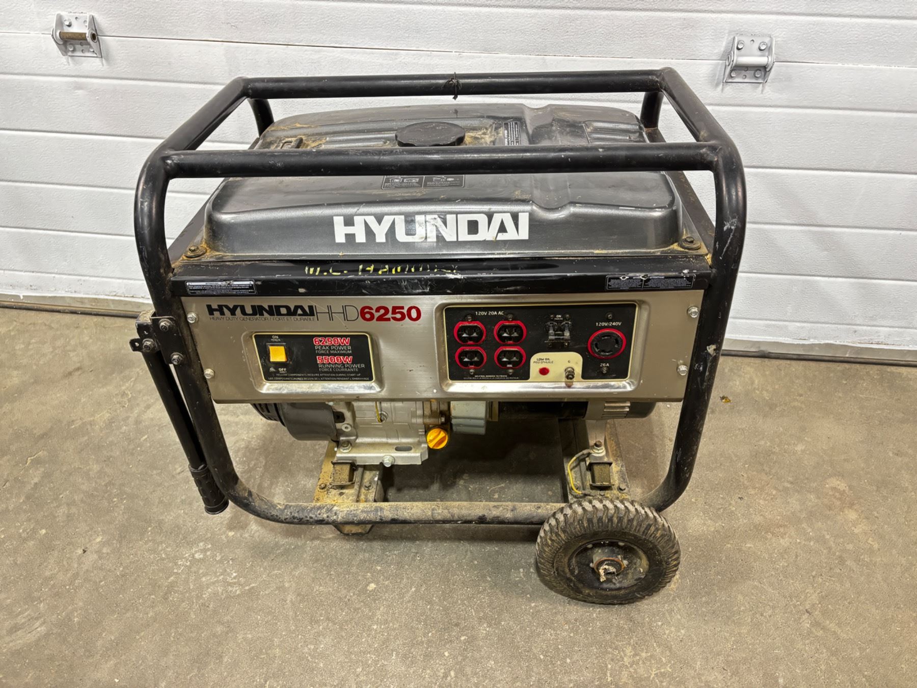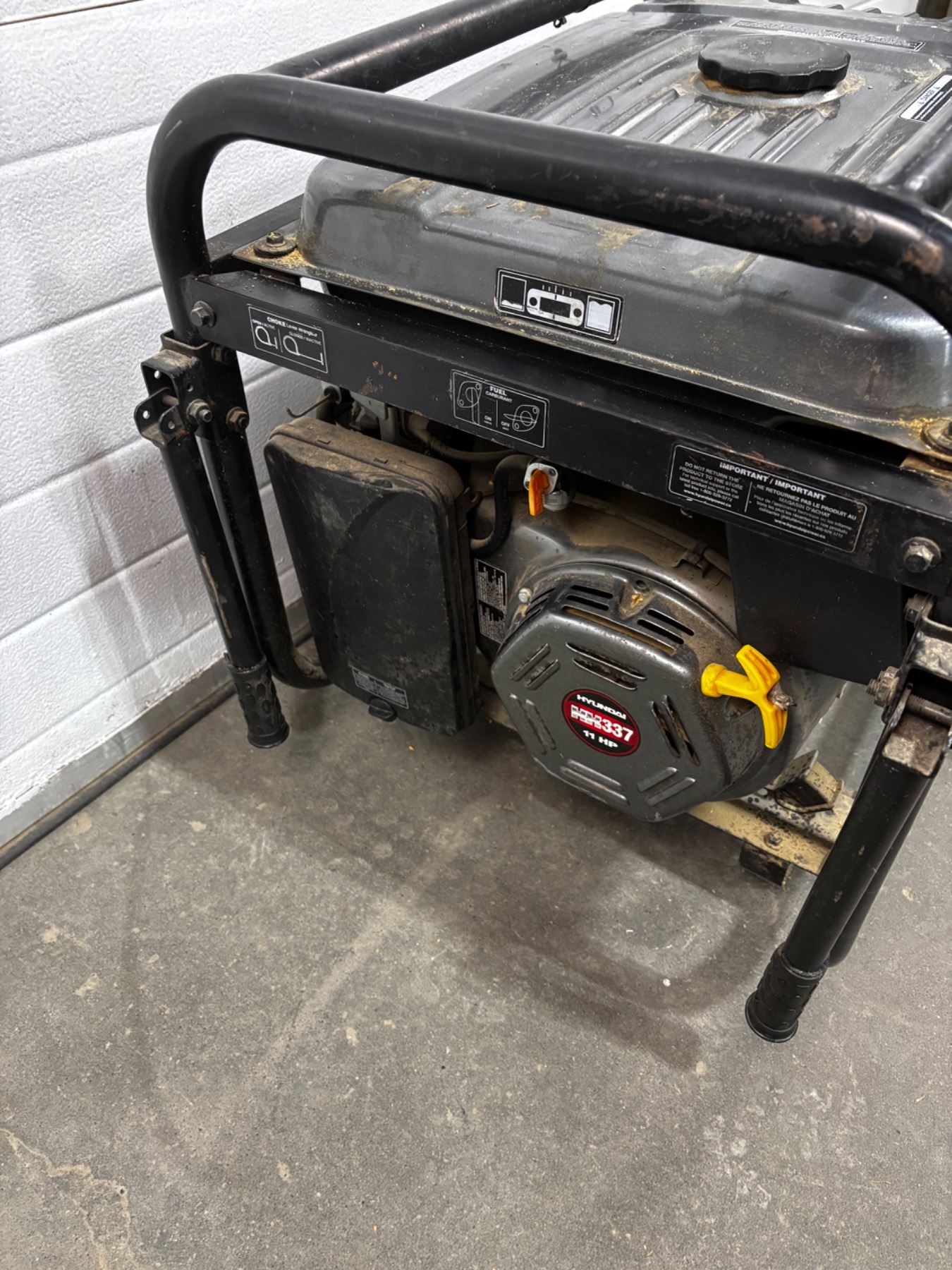 5500W running power, 6250 peak power, 11 HP total. Model #HHD6250 Generator needs some TLC and is trying to start. Air filter and fuel will need attention. Choke handle is broken off.