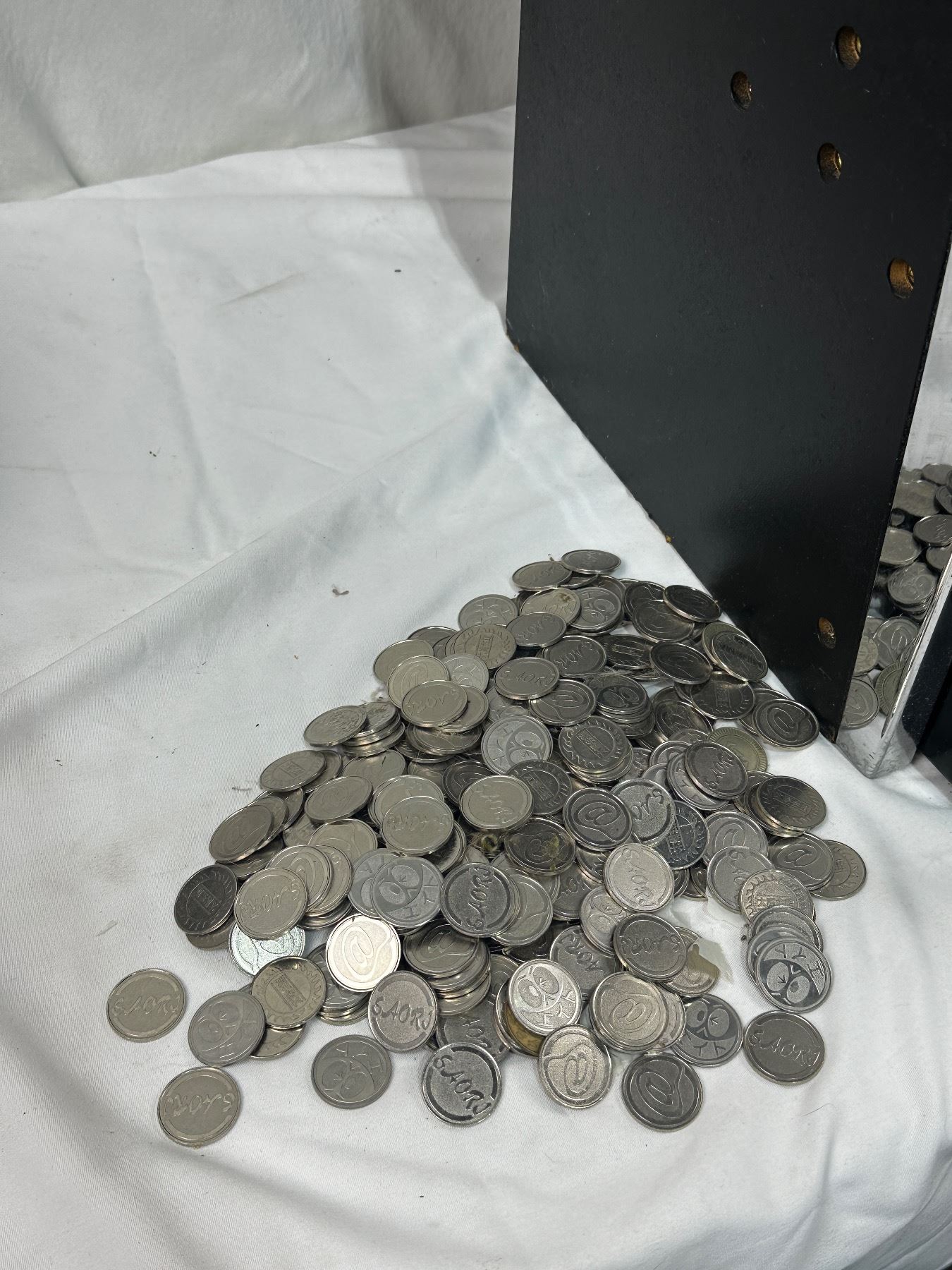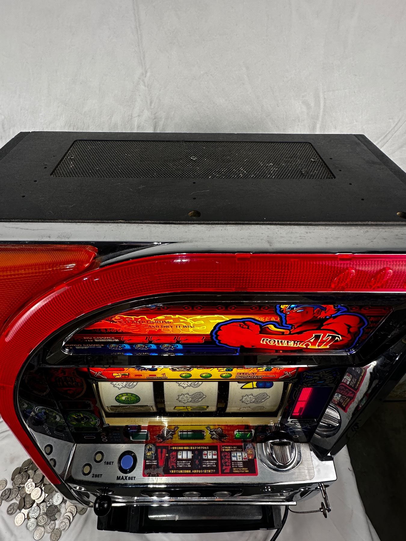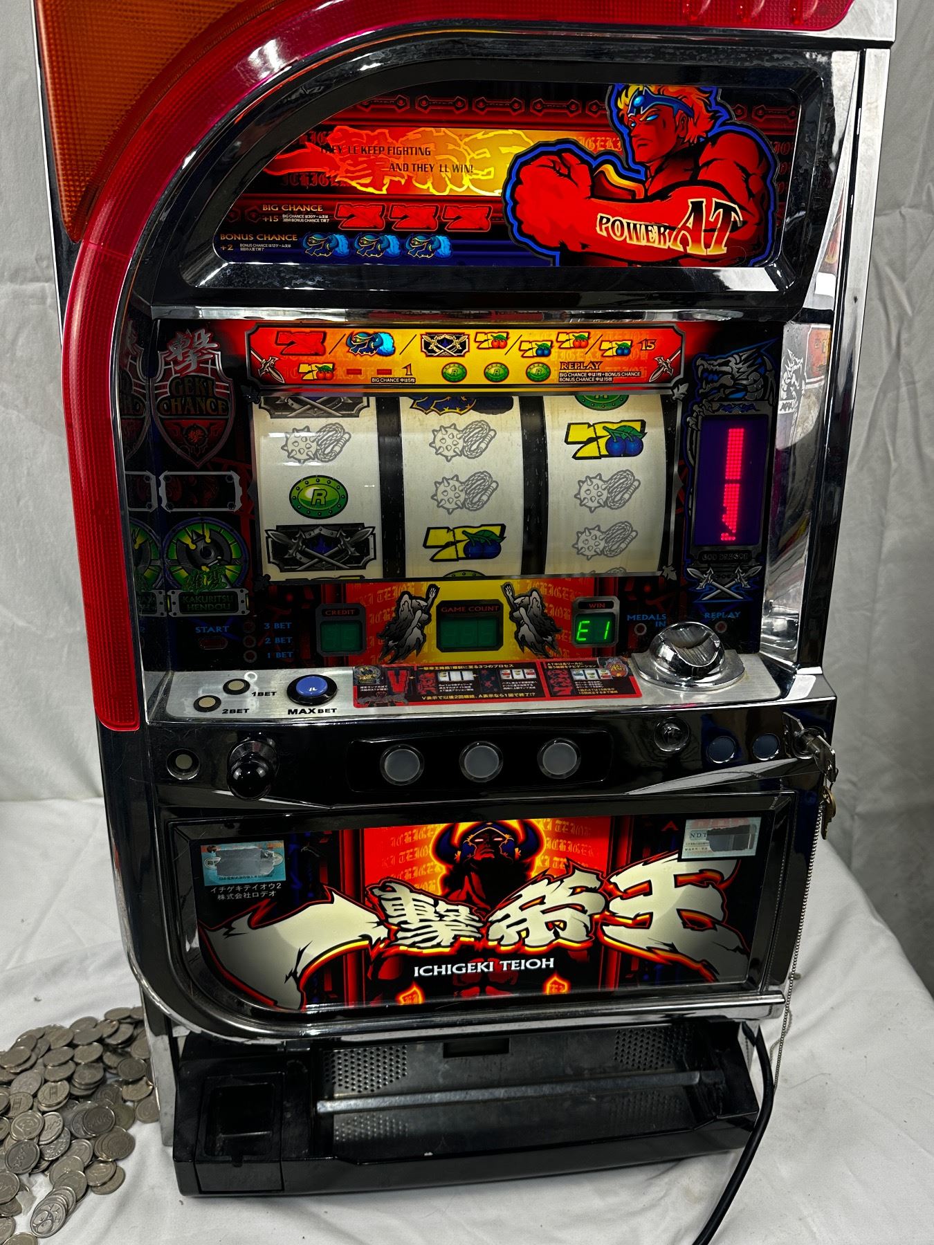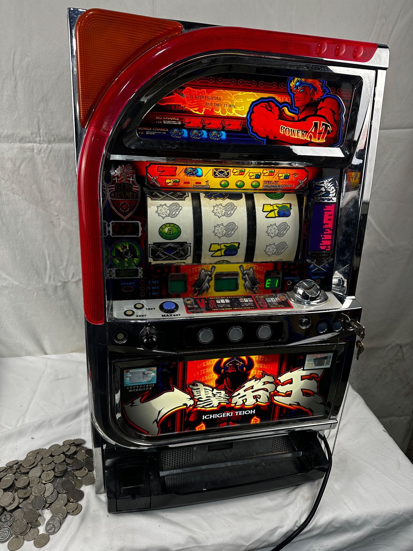 Turns on - unknown working condition - comes with slot coins - 32" tall x 18.5" wide x 15" deep. Comes with key.
