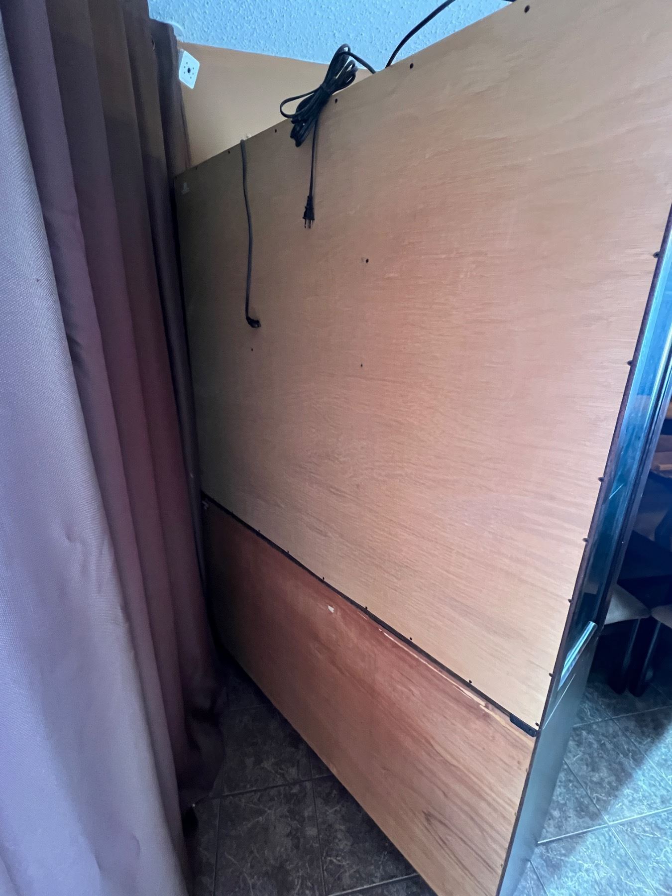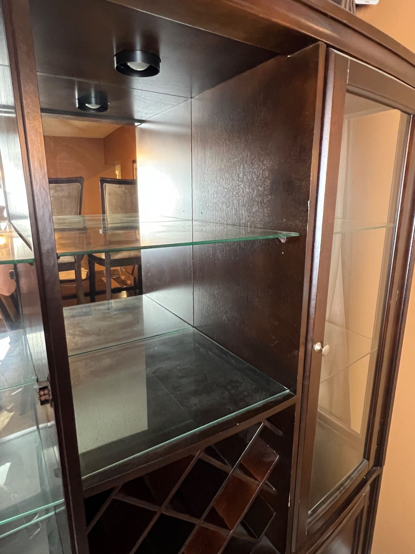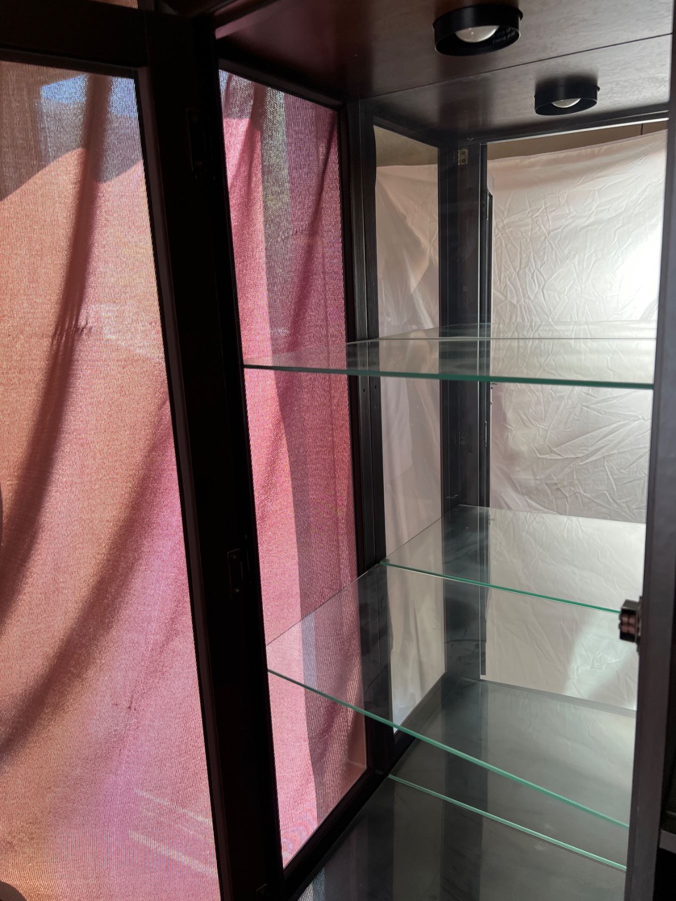 All 3 of the upper sections illuminate. Will require a Philips screwdriver to disassemble and move. Very close to front entrance. Includes two spare glass panels. 54" wide and 15" deep. Upper section is 44" and lower section is 32"