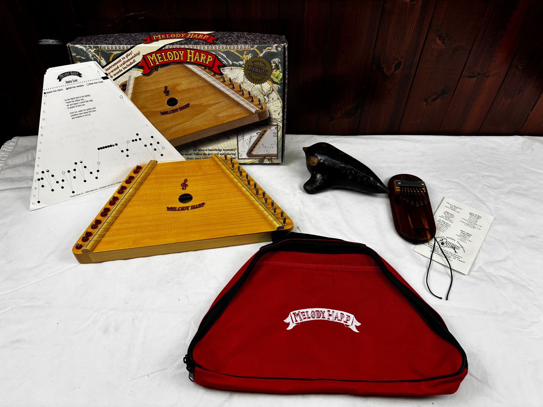 Includes, Melody Harp and case, Mountain Melody Thumbdrums, Vintage Ocarina
