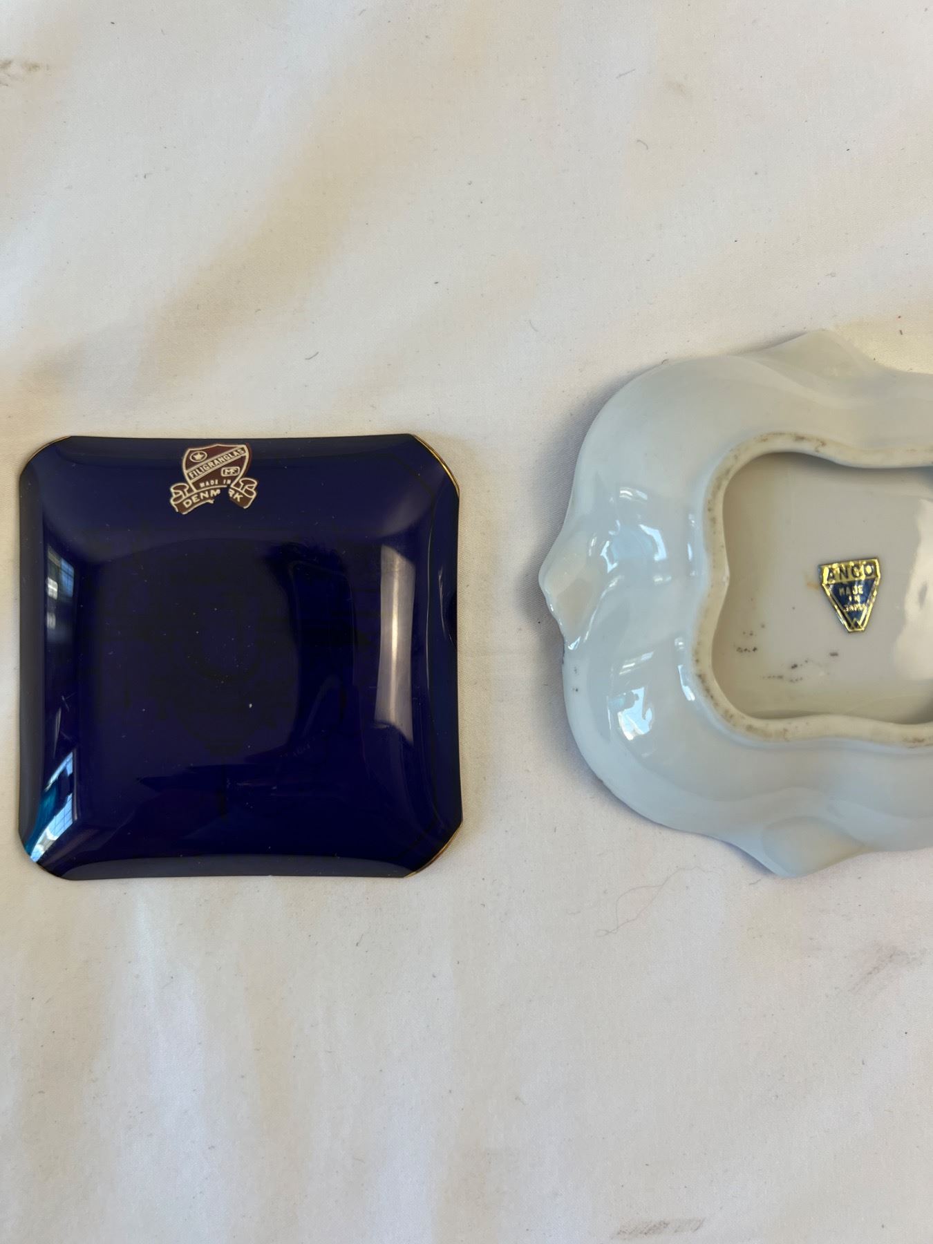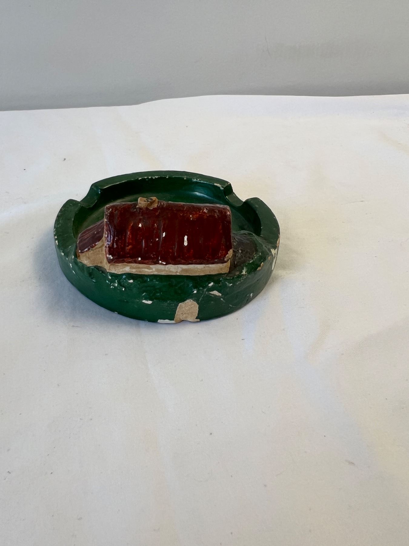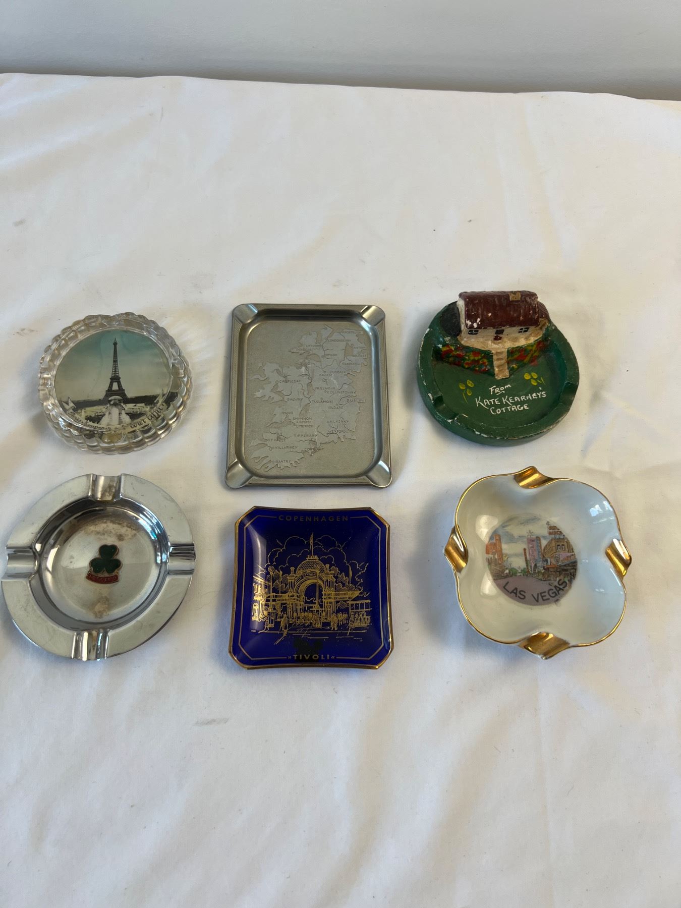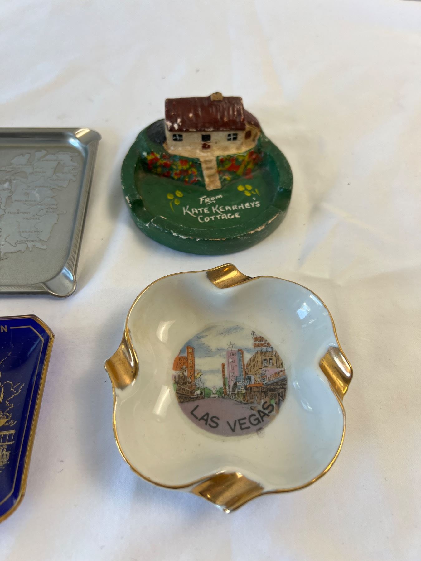 All trays feature a different destination. Largest tray is silver map which measures 4" by 5". Cottage has chip in rear.