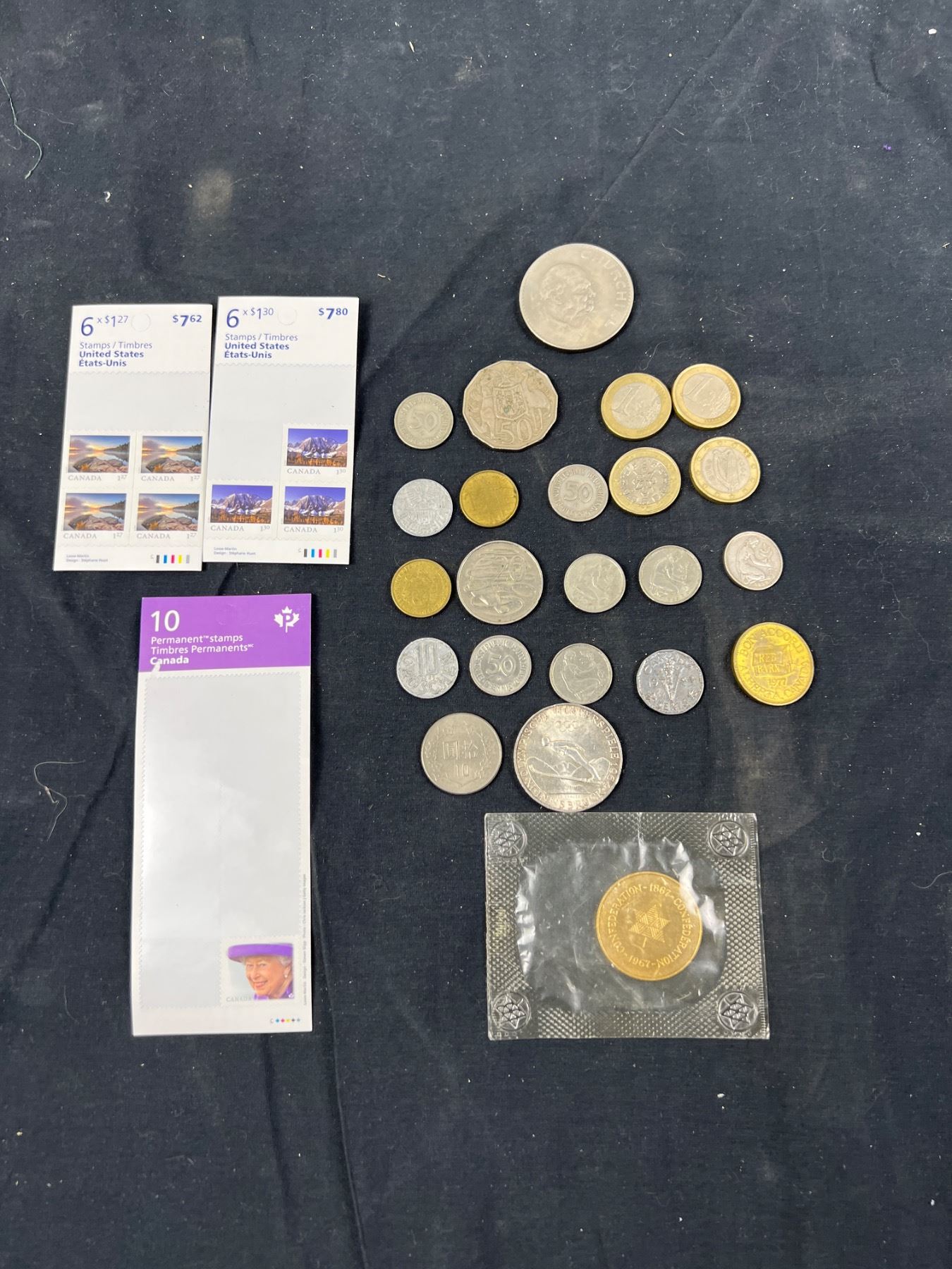 Variety of coins and years. Limited number of stamps