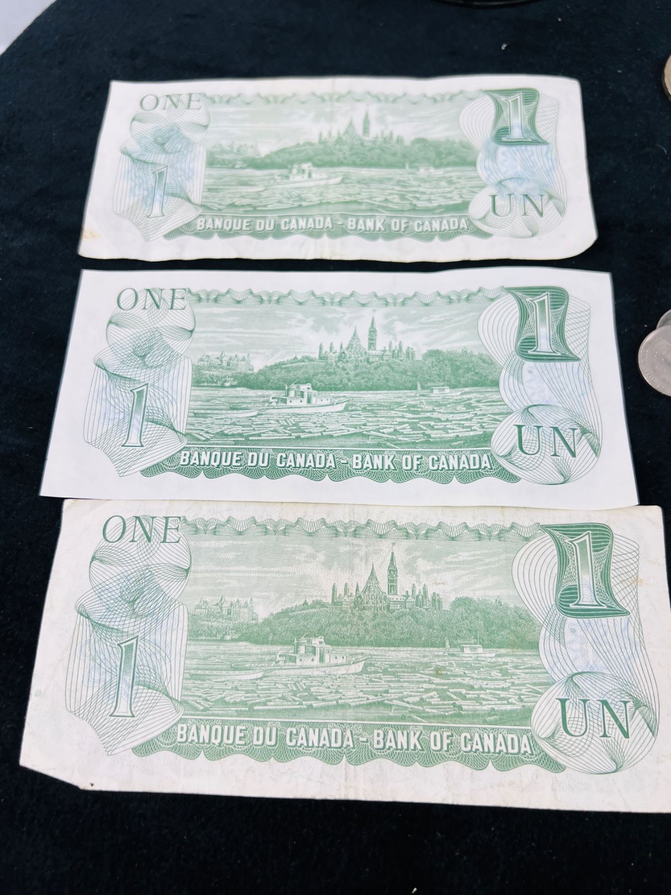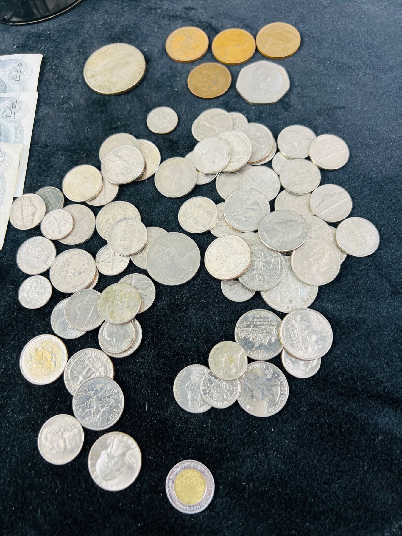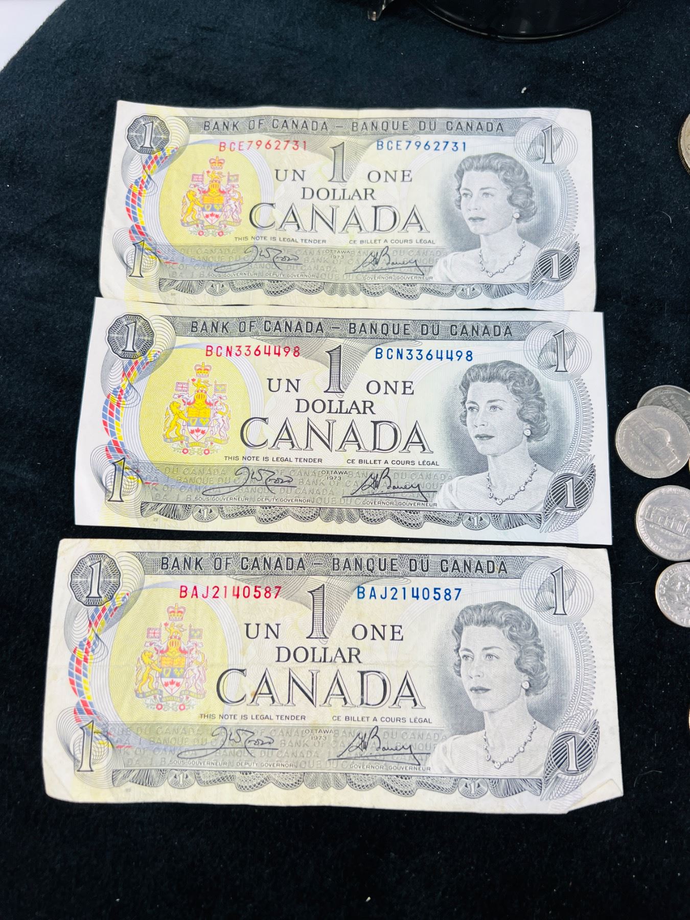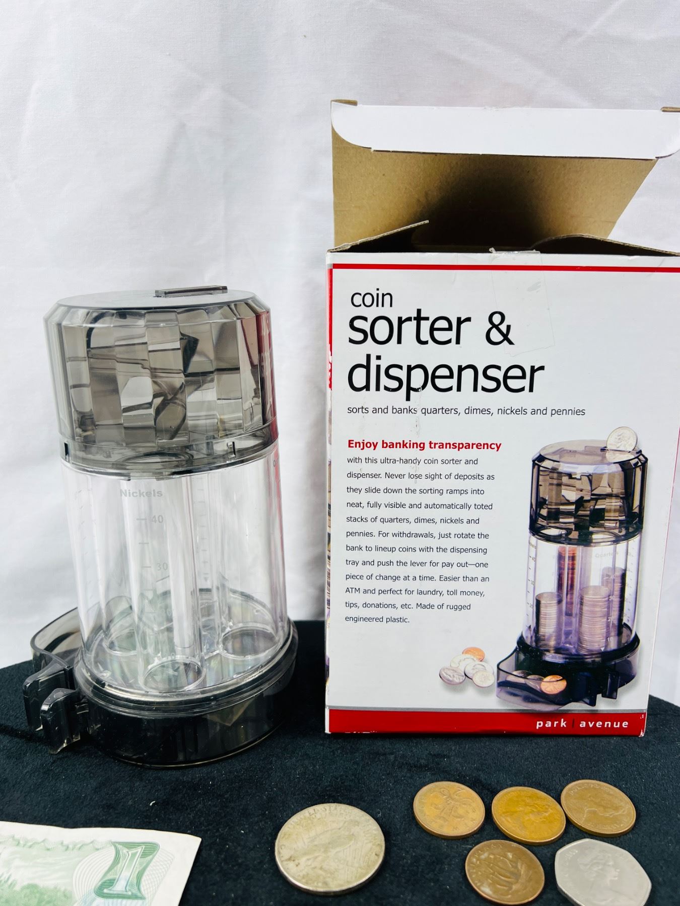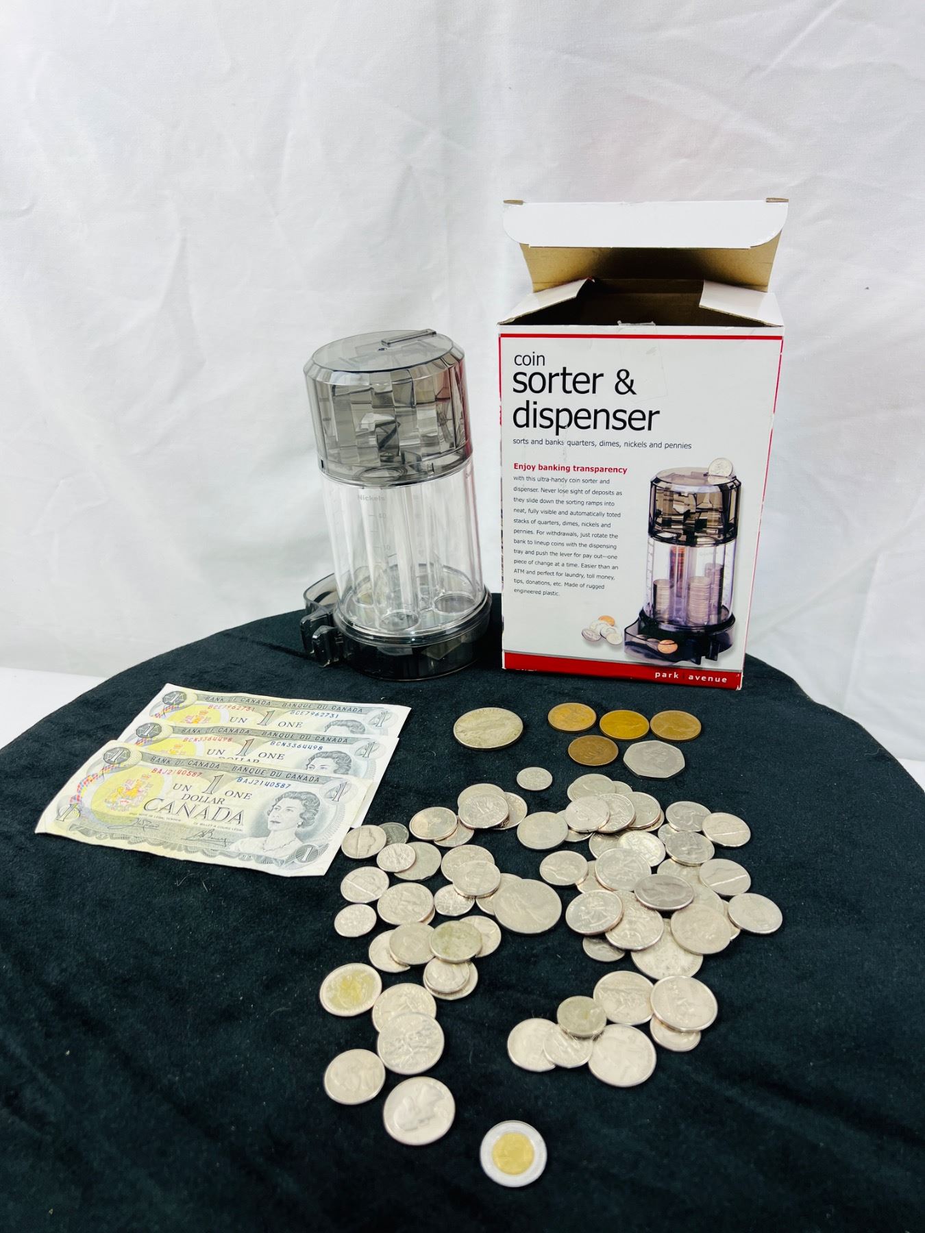Includes a Coin Sorter & Dispenser, Three 1973 Canadian One Dollar Bills, and an assortment of coins