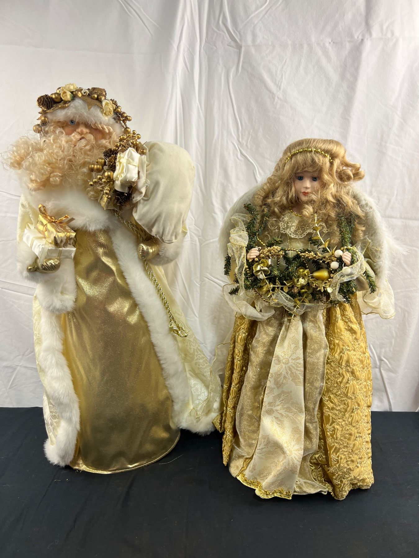 Ivory and Gold Santa standing approximately 28" tall. Ivory and Gold Angel is 25" tall.