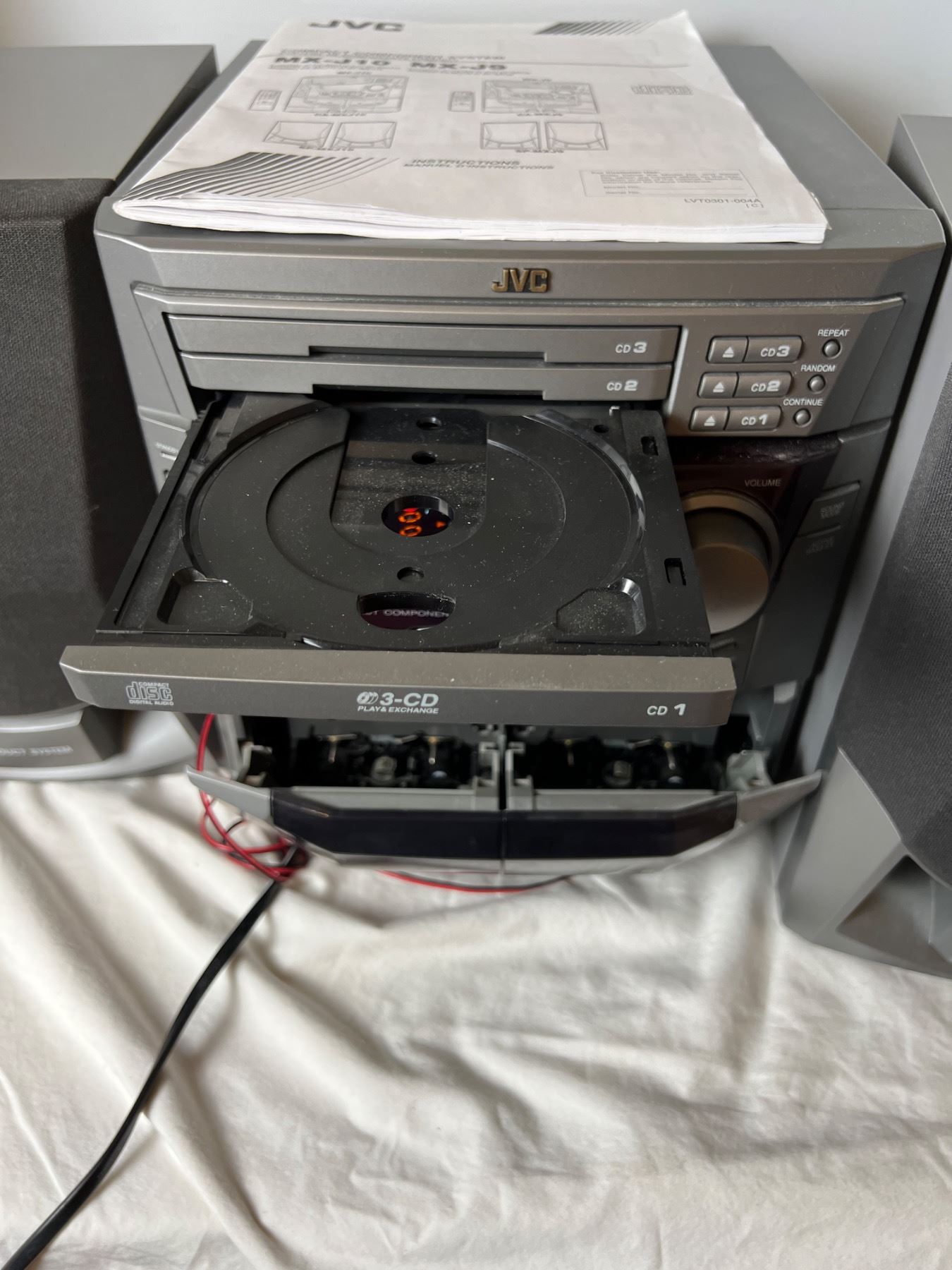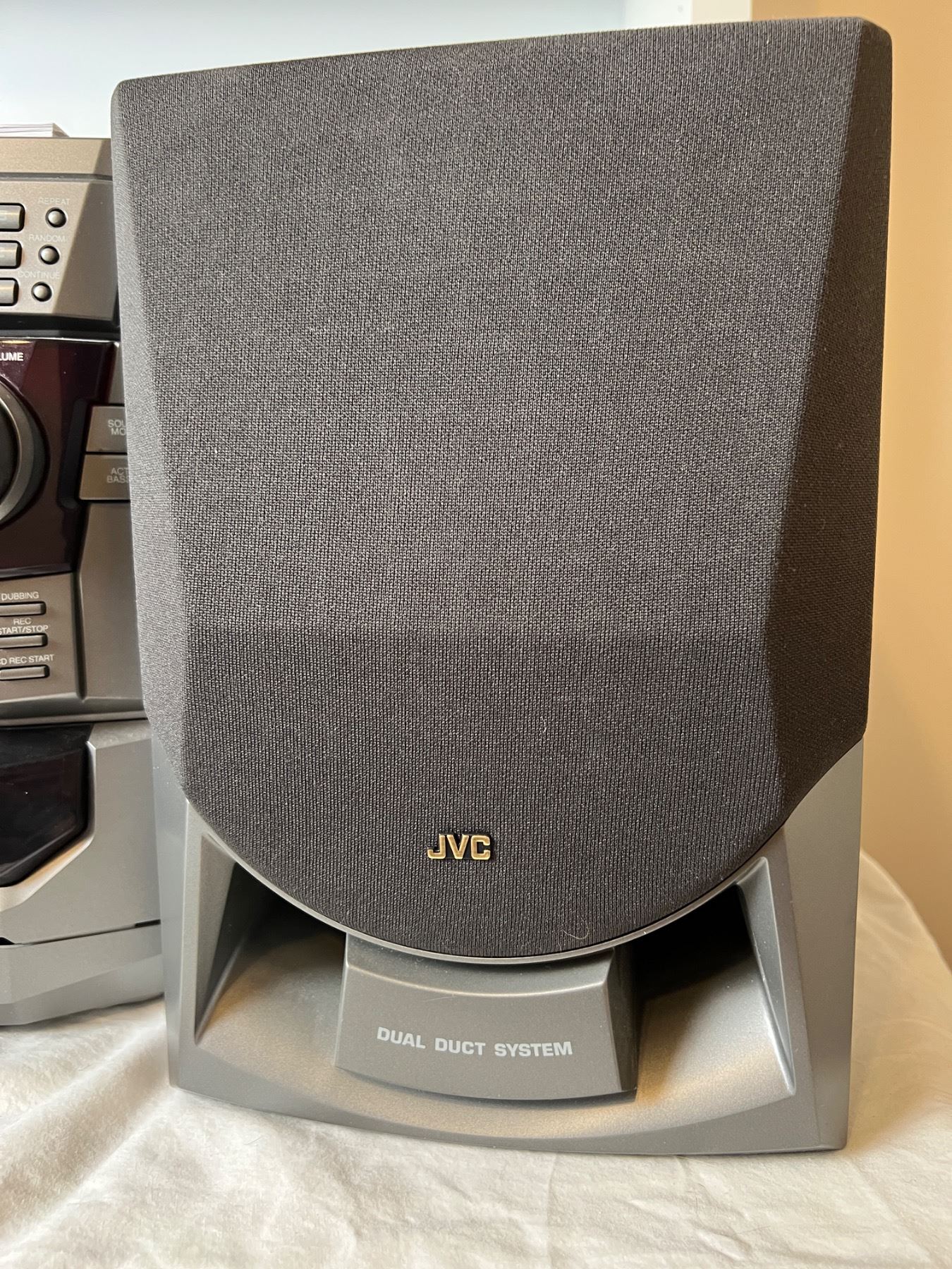 Powers on. Speakers are not connected but have no visible damage and do not have noises of loose parts in their enclosures.