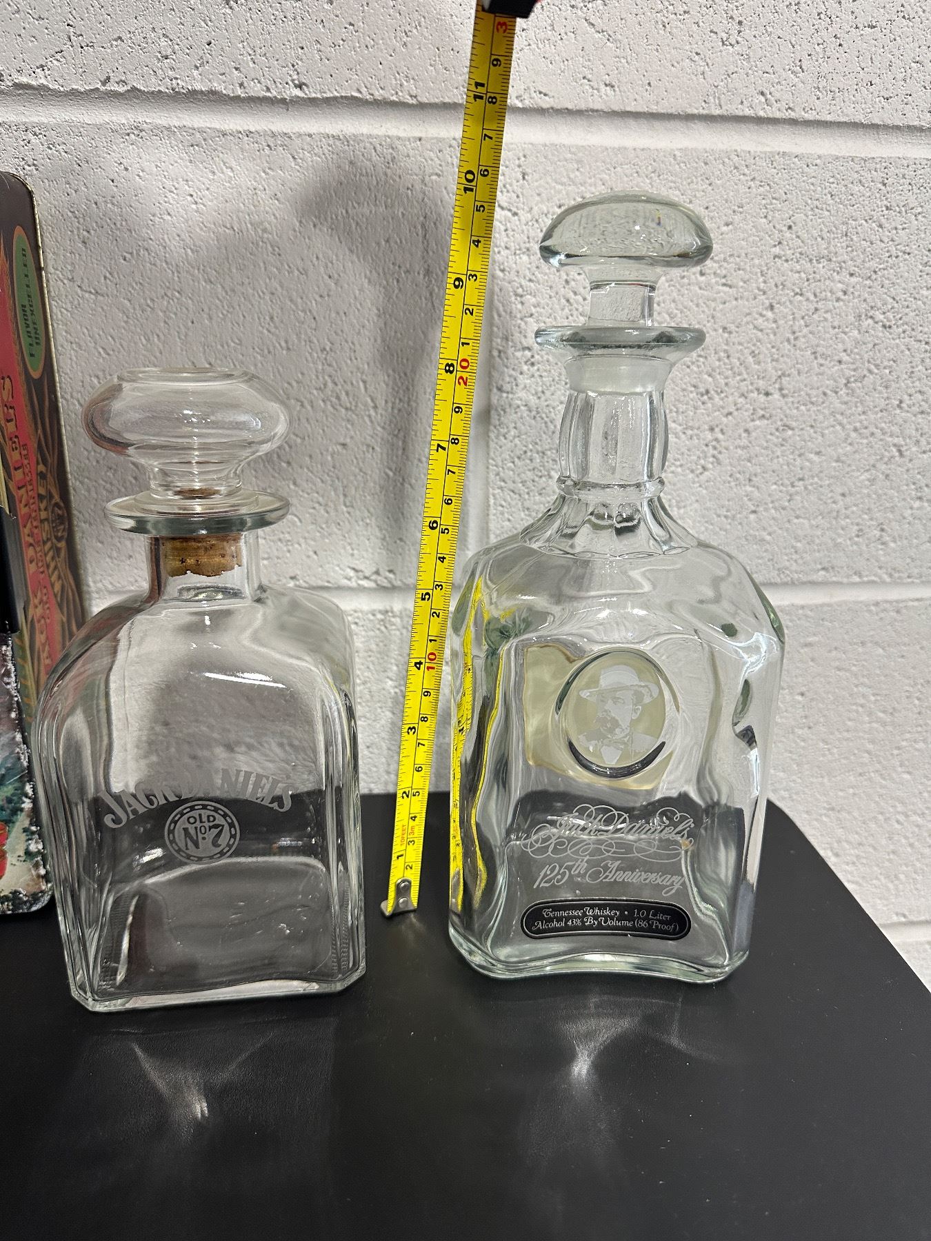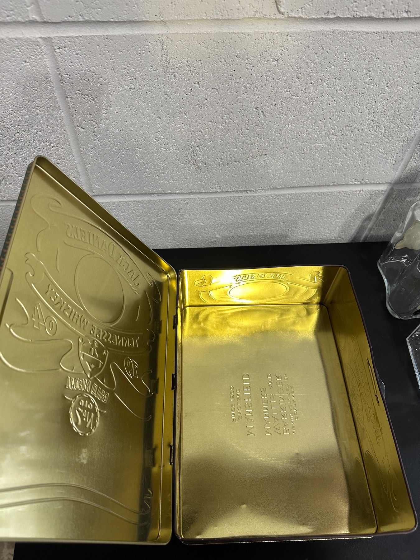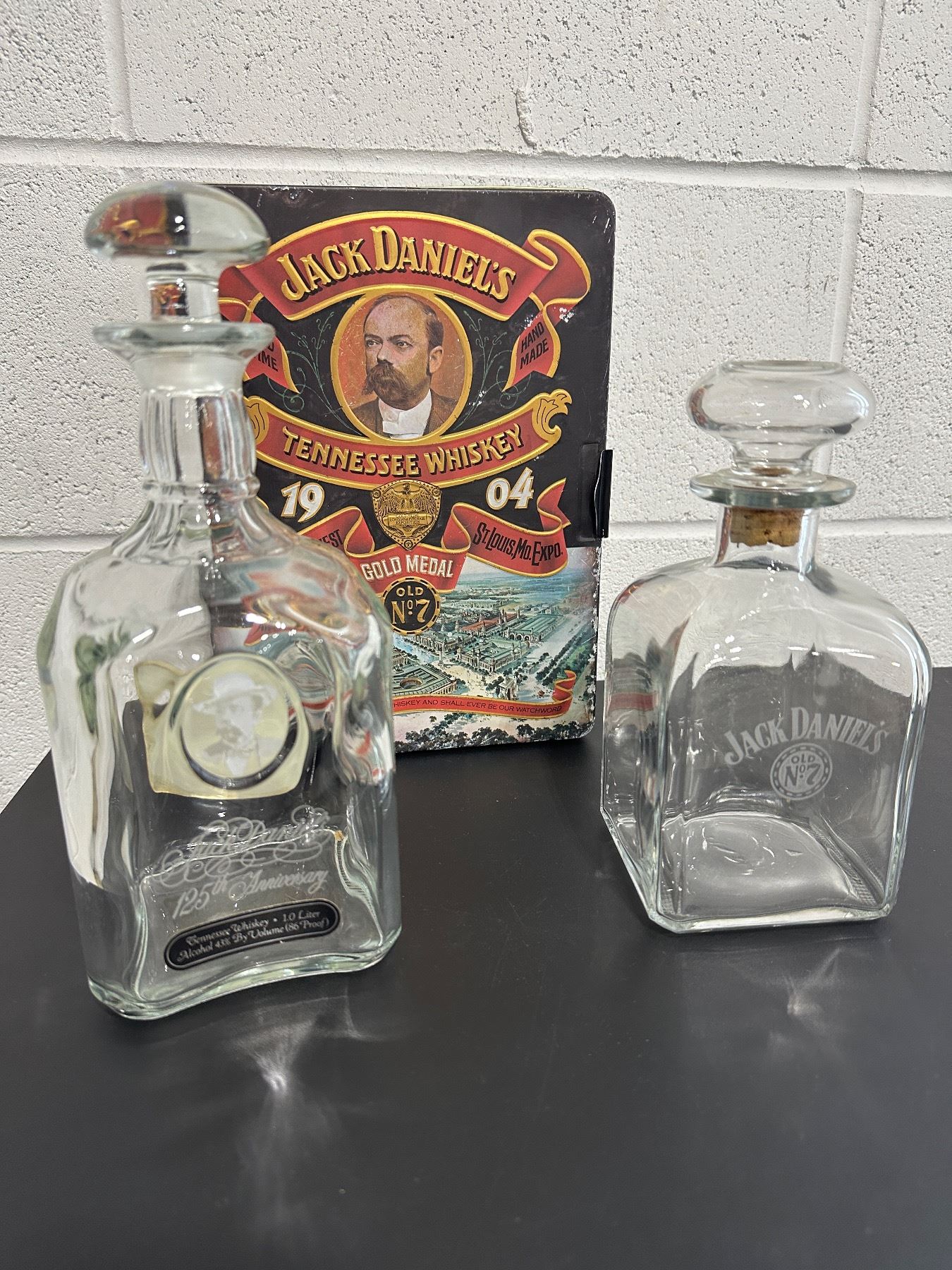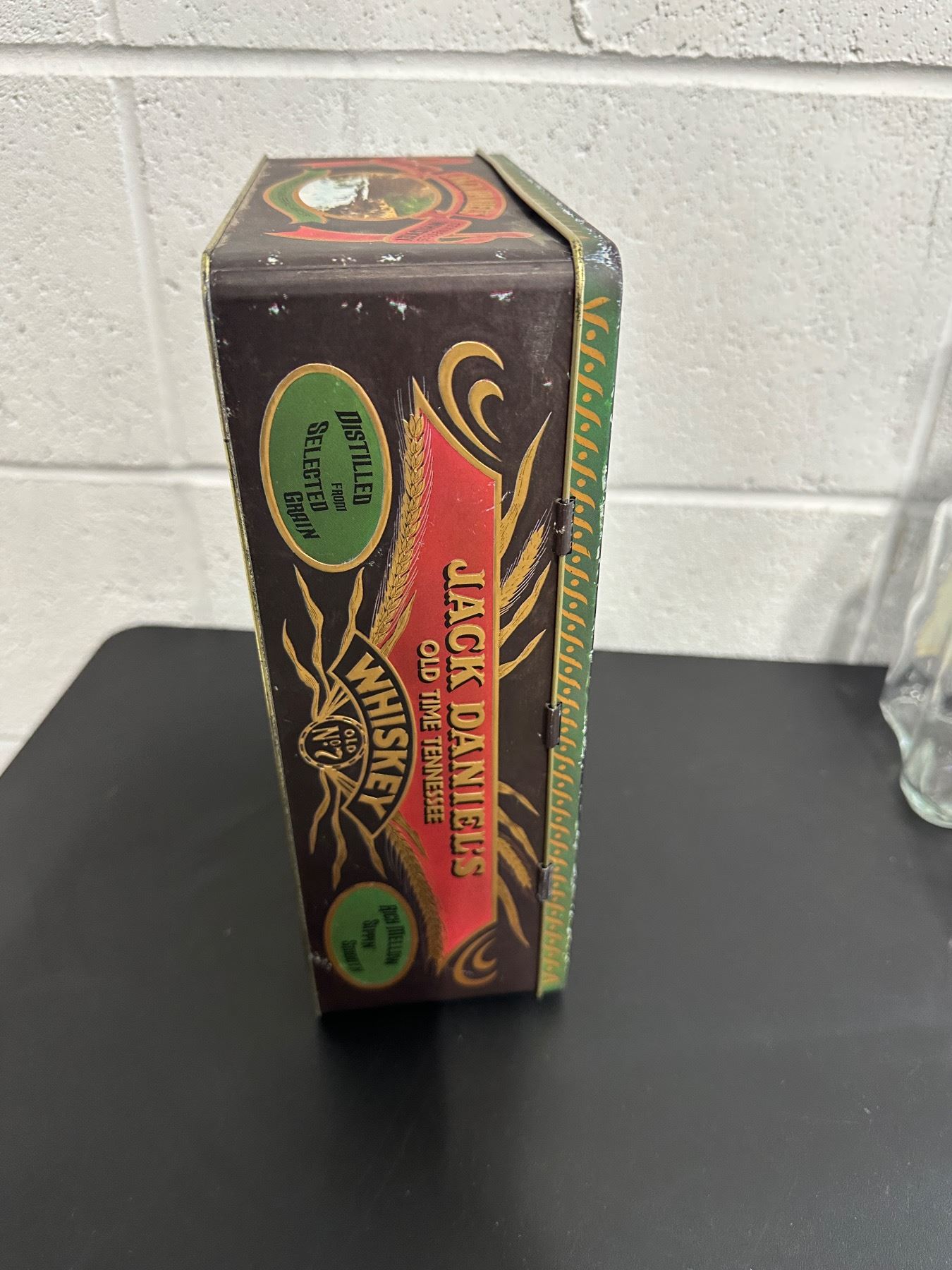 Includes 125th Anniversary Glass Bottle, Old No.7 Glass Bottle and metal tin 10.5" long x 8" wide x 4" tall