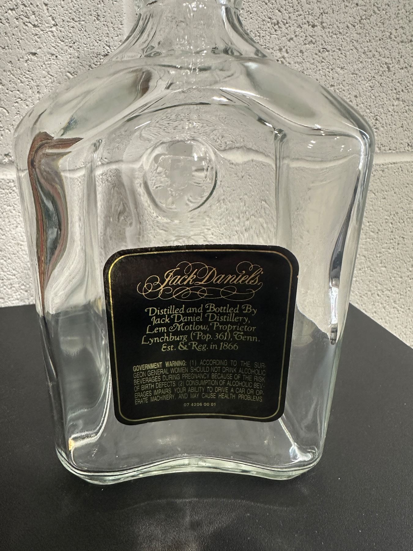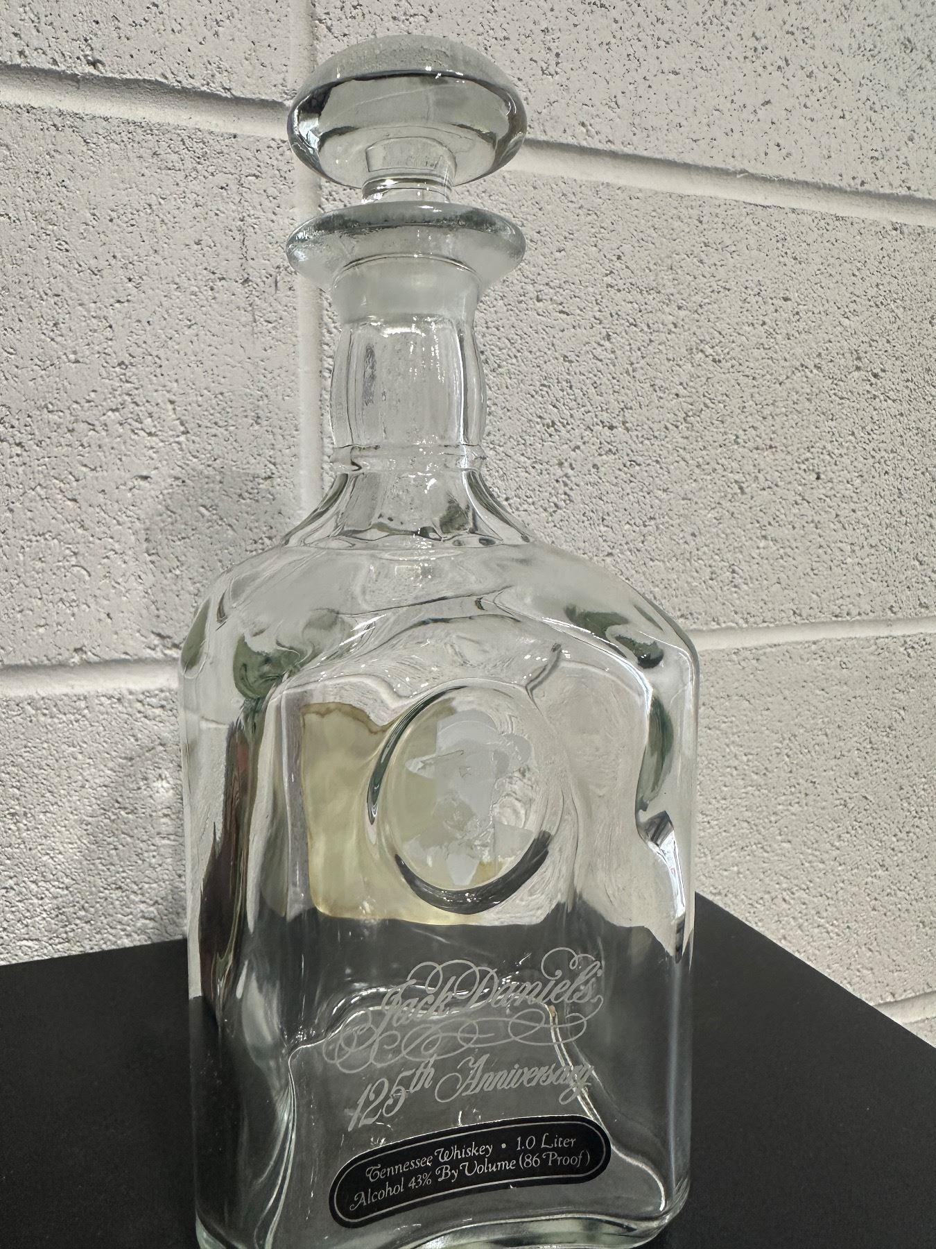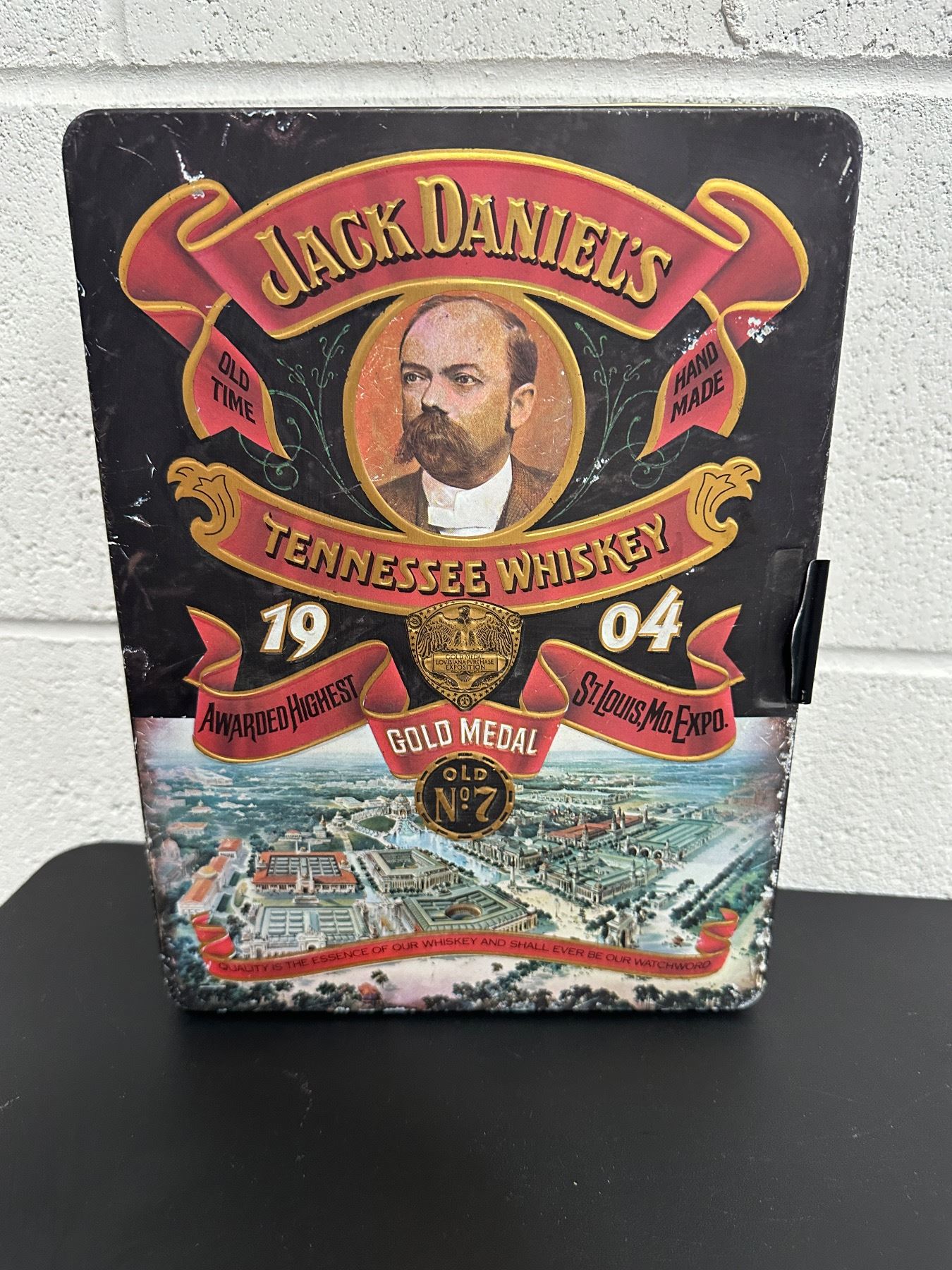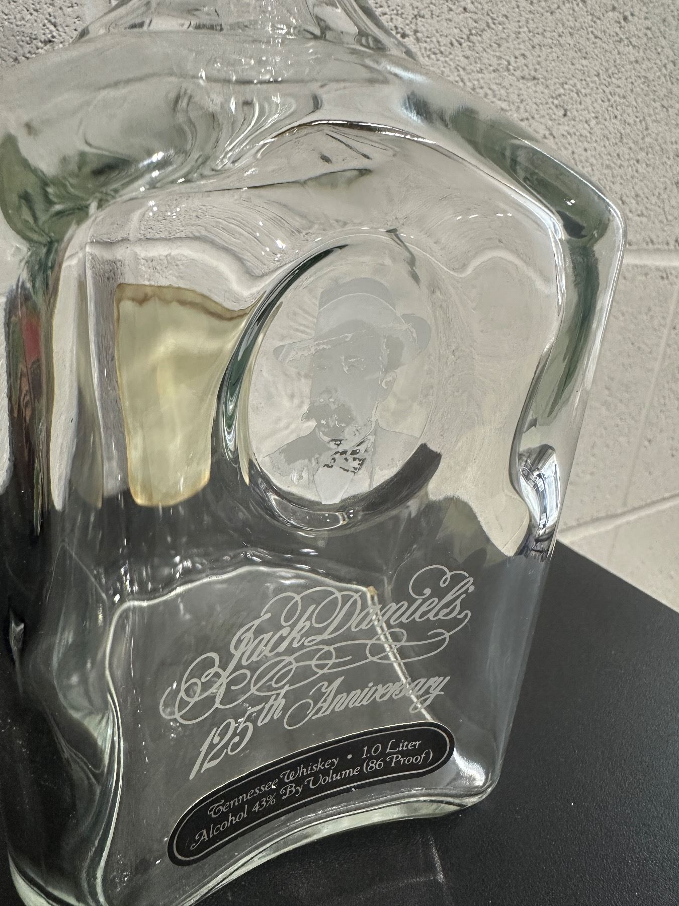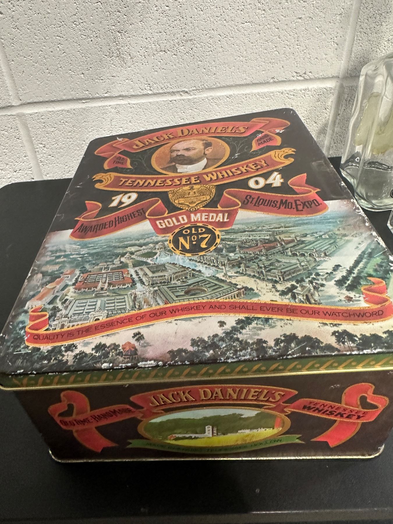 Includes 125th Anniversary Glass Bottle, Old No.7 Glass Bottle and metal tin 10.5" long x 8" wide x 4" tall