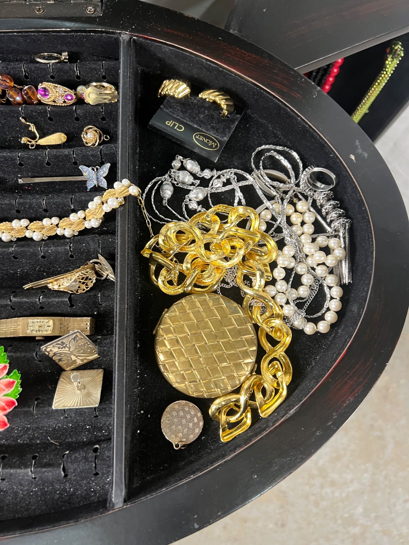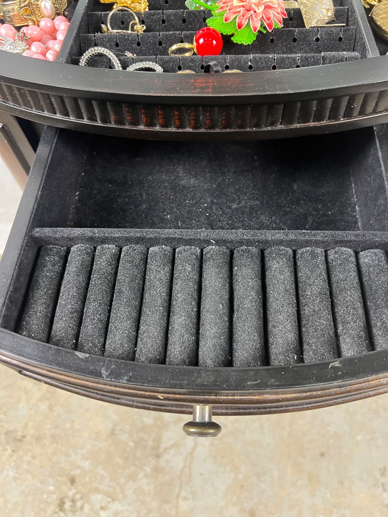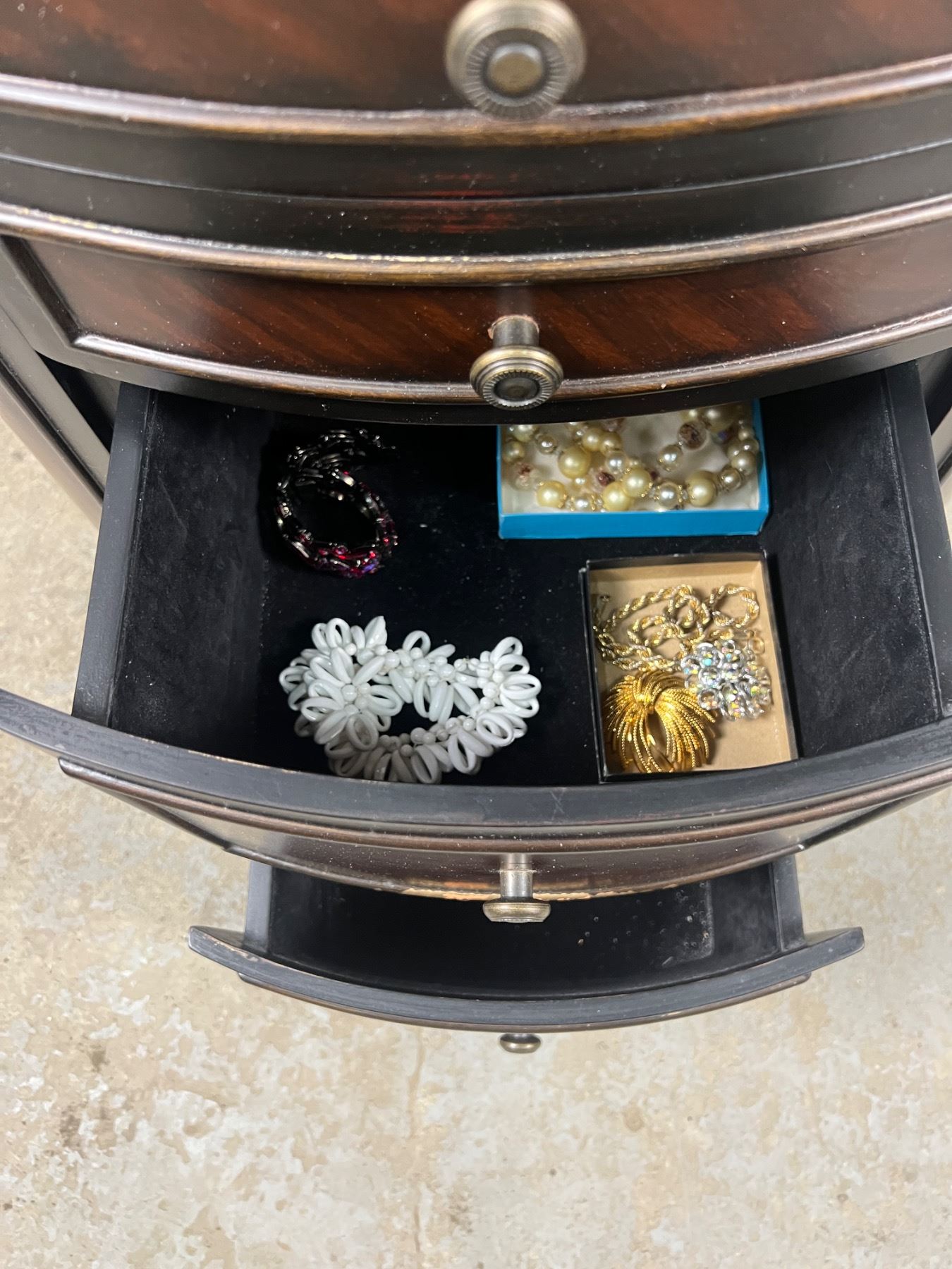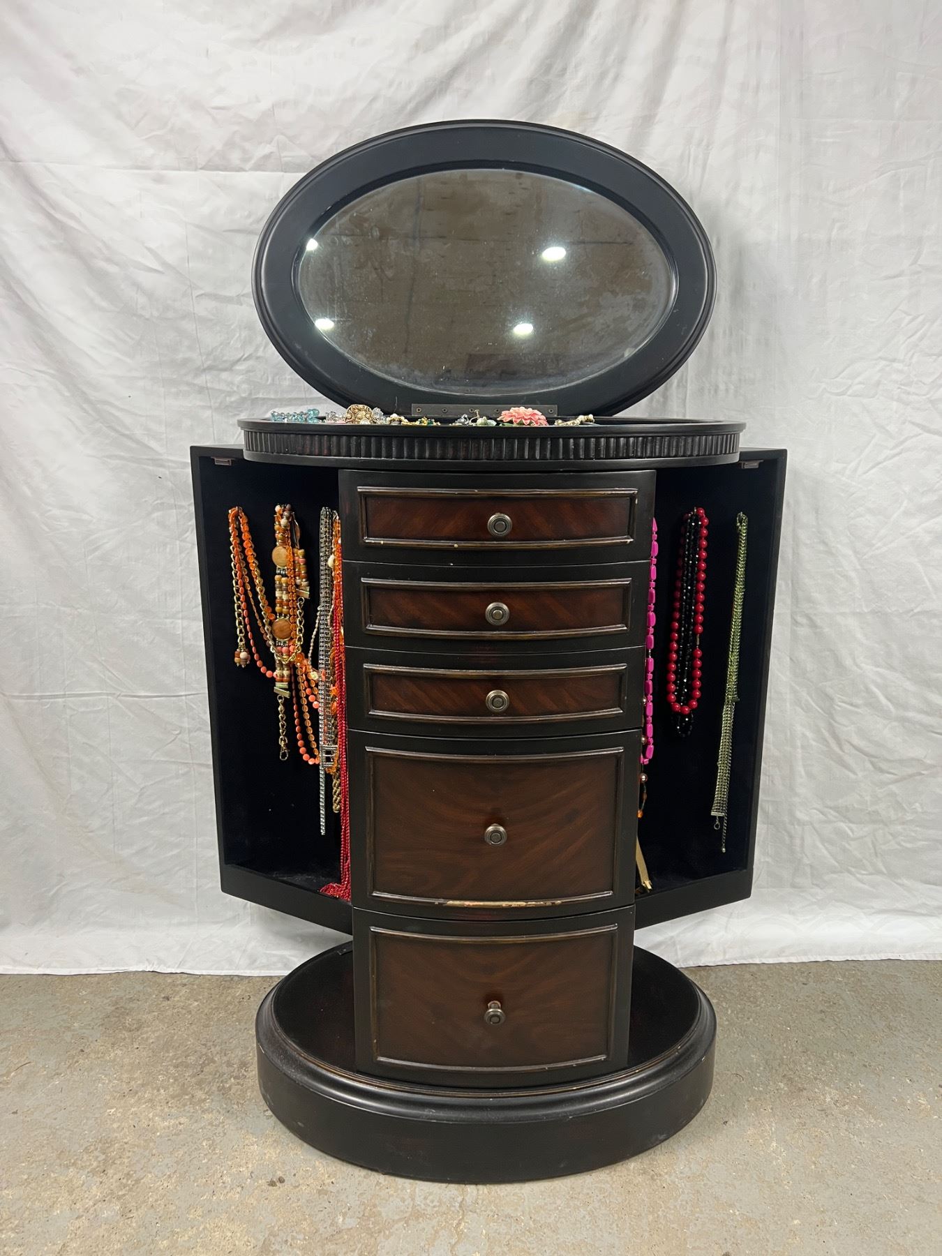 The cabinet measures 34.5"H x 24"L x 16"D , has some scuffs along the edges, includes a variety of costume jewelry such as necklaces, earrings, and brooches