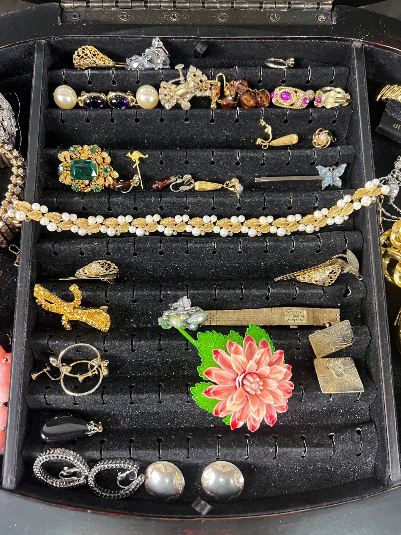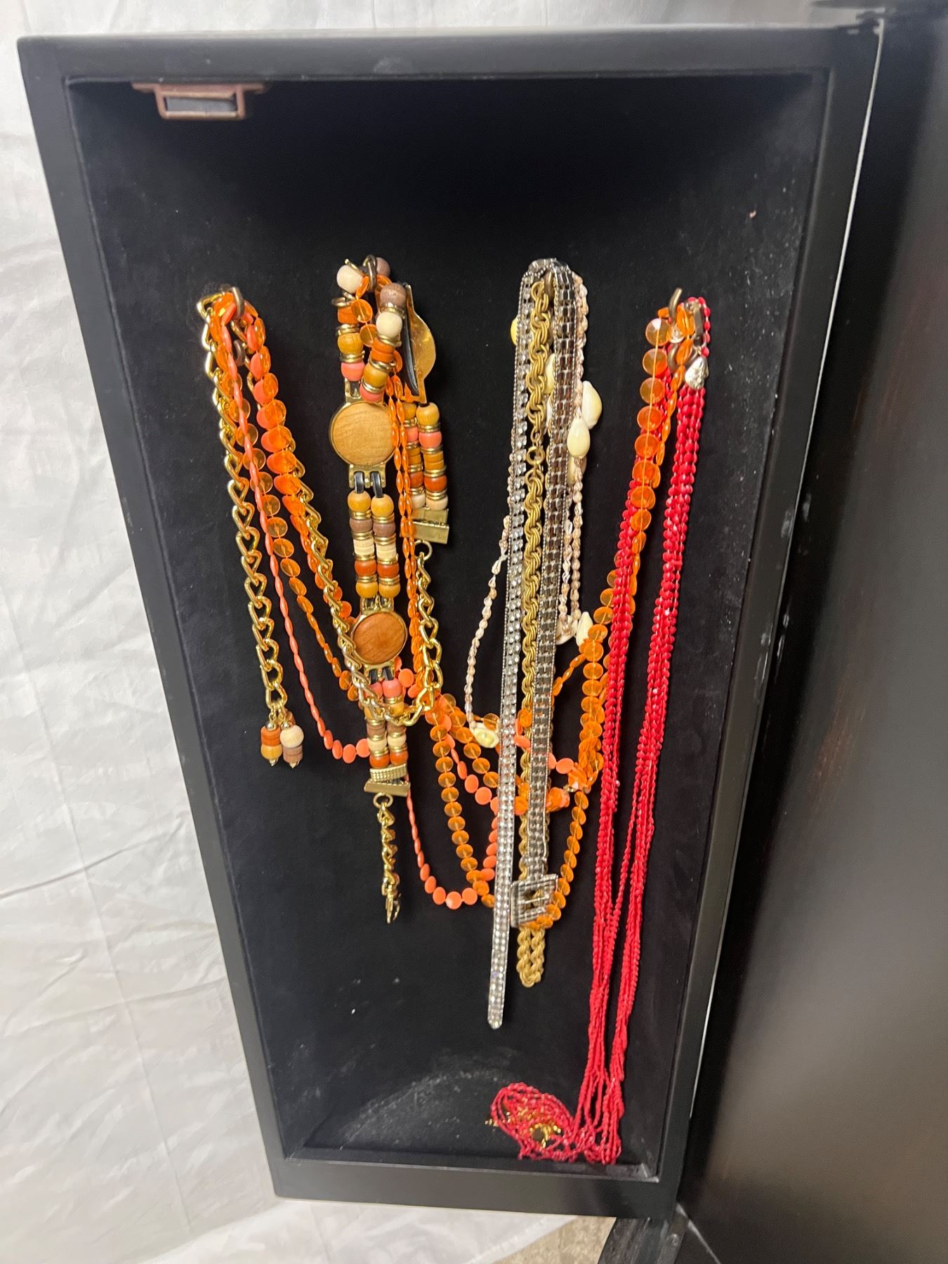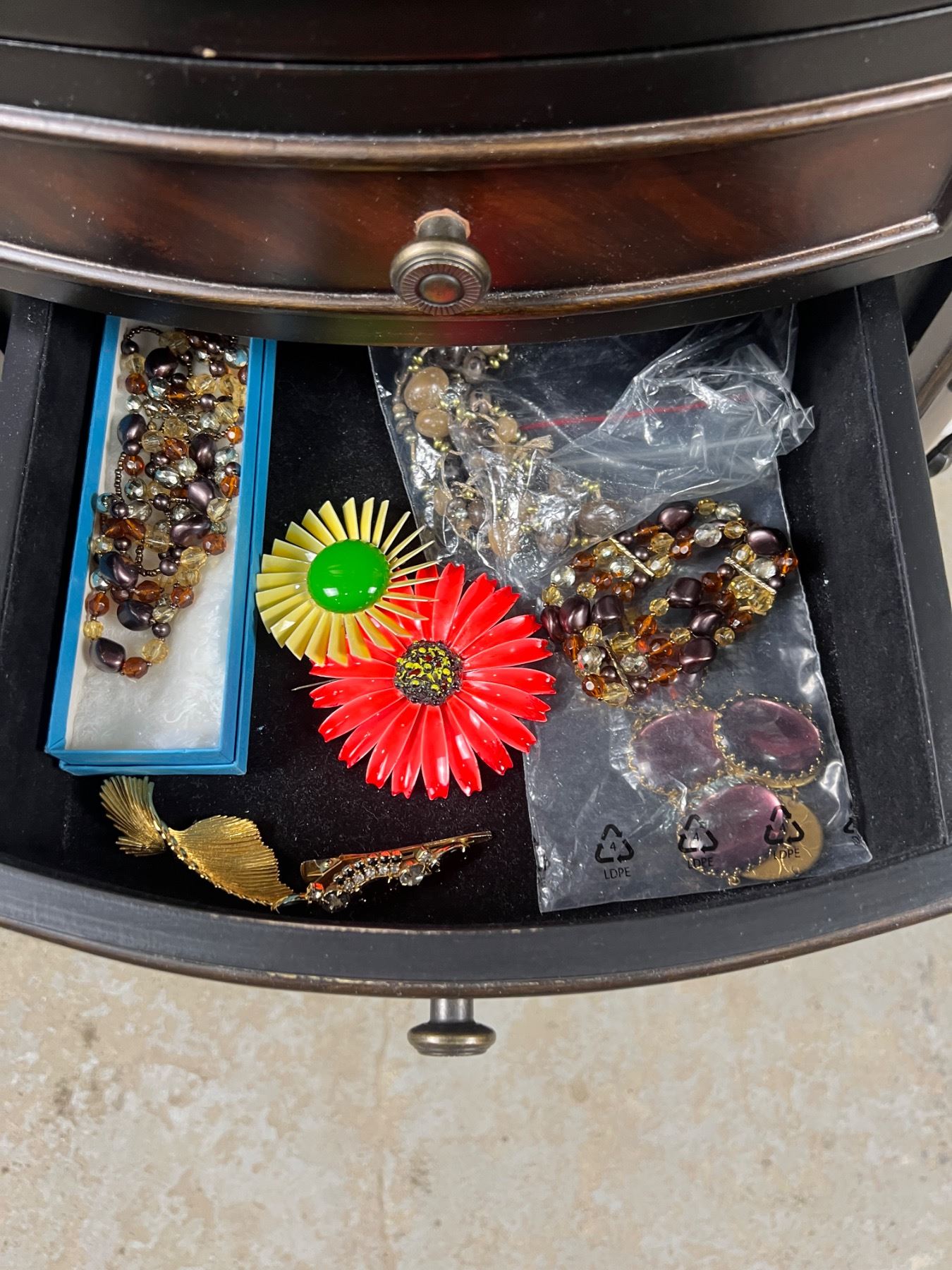 The cabinet measures 34.5"H x 24"L x 16"D , has some scuffs along the edges, includes a variety of costume jewelry such as necklaces, earrings, and brooches
