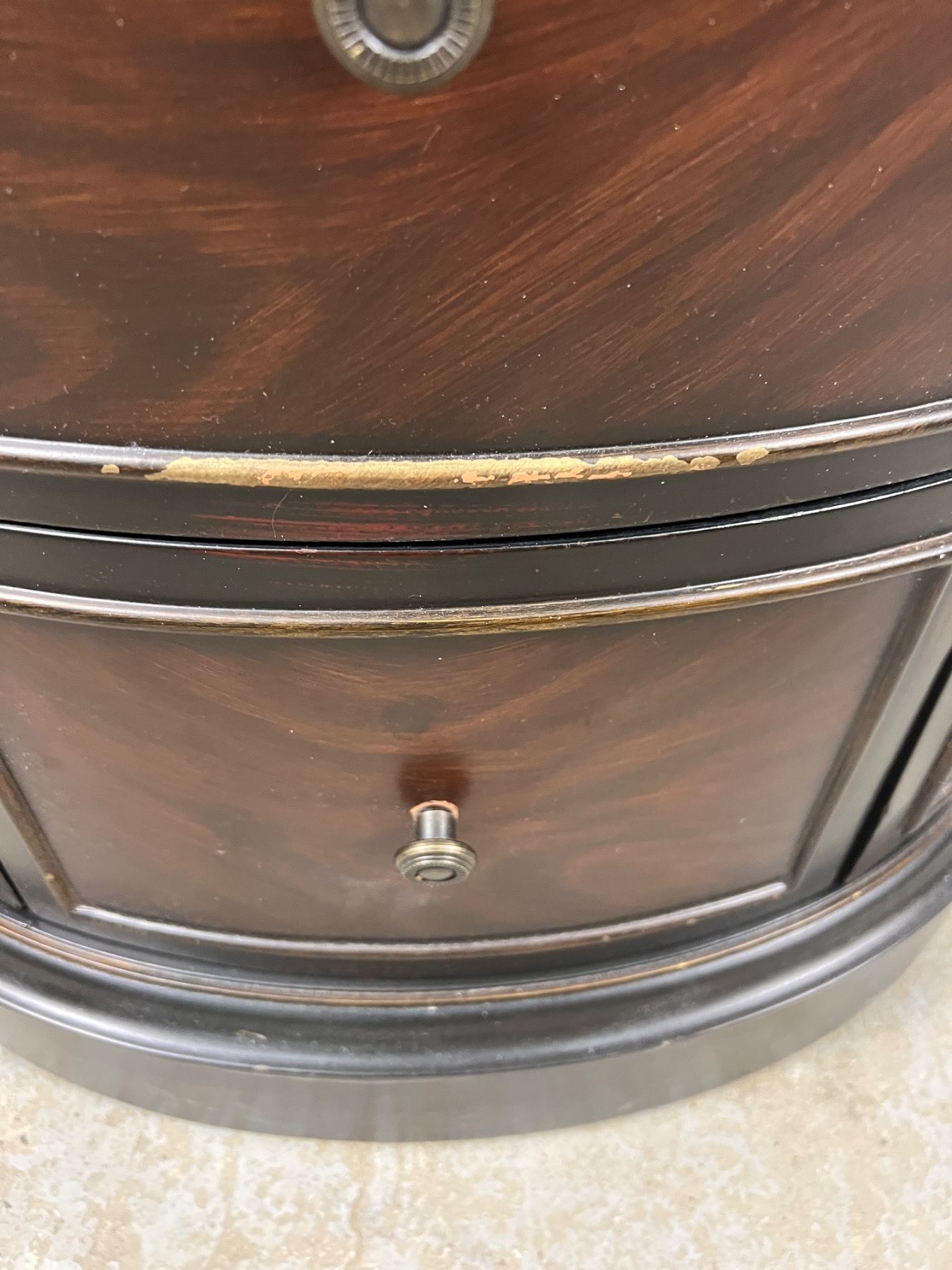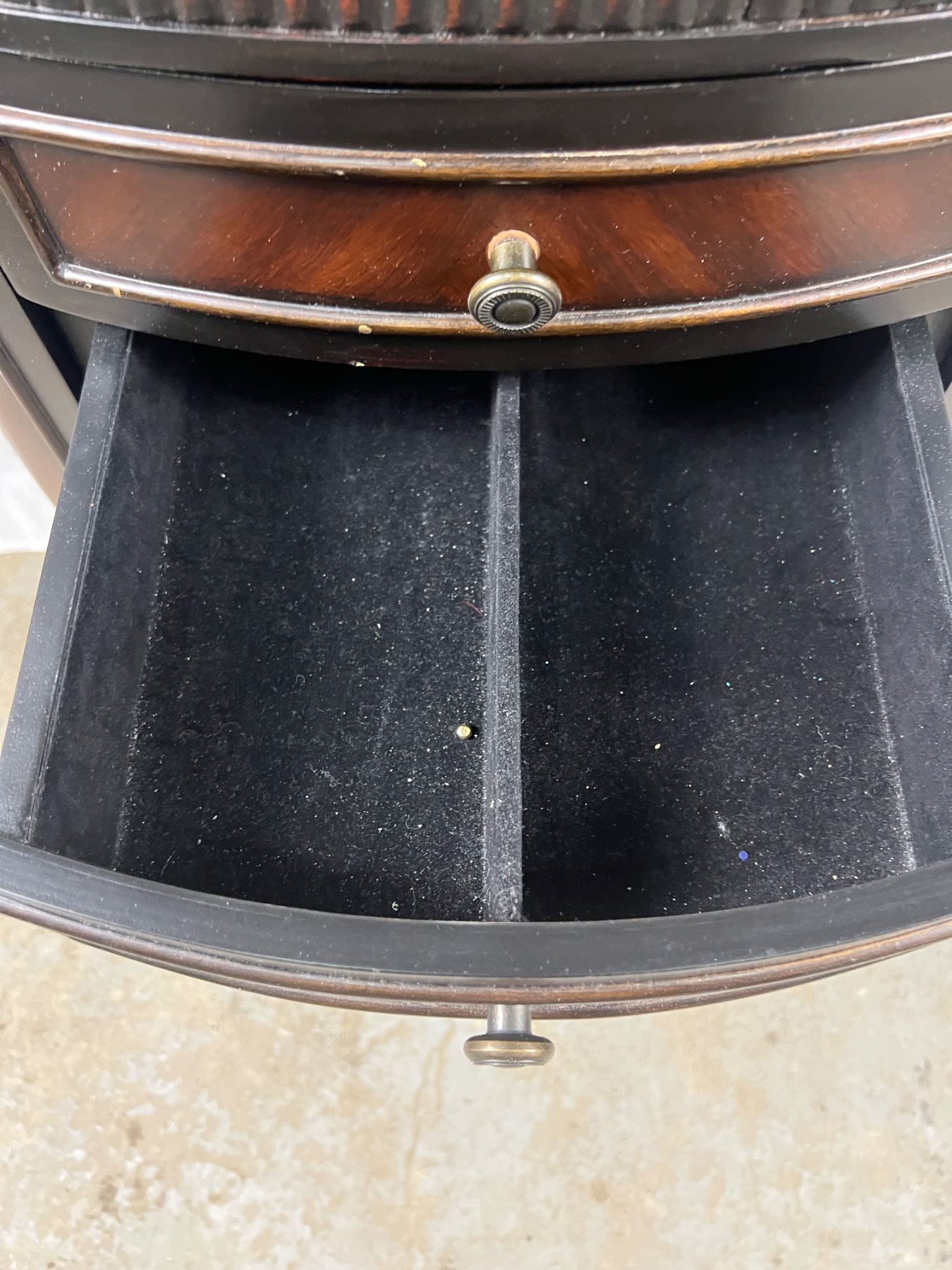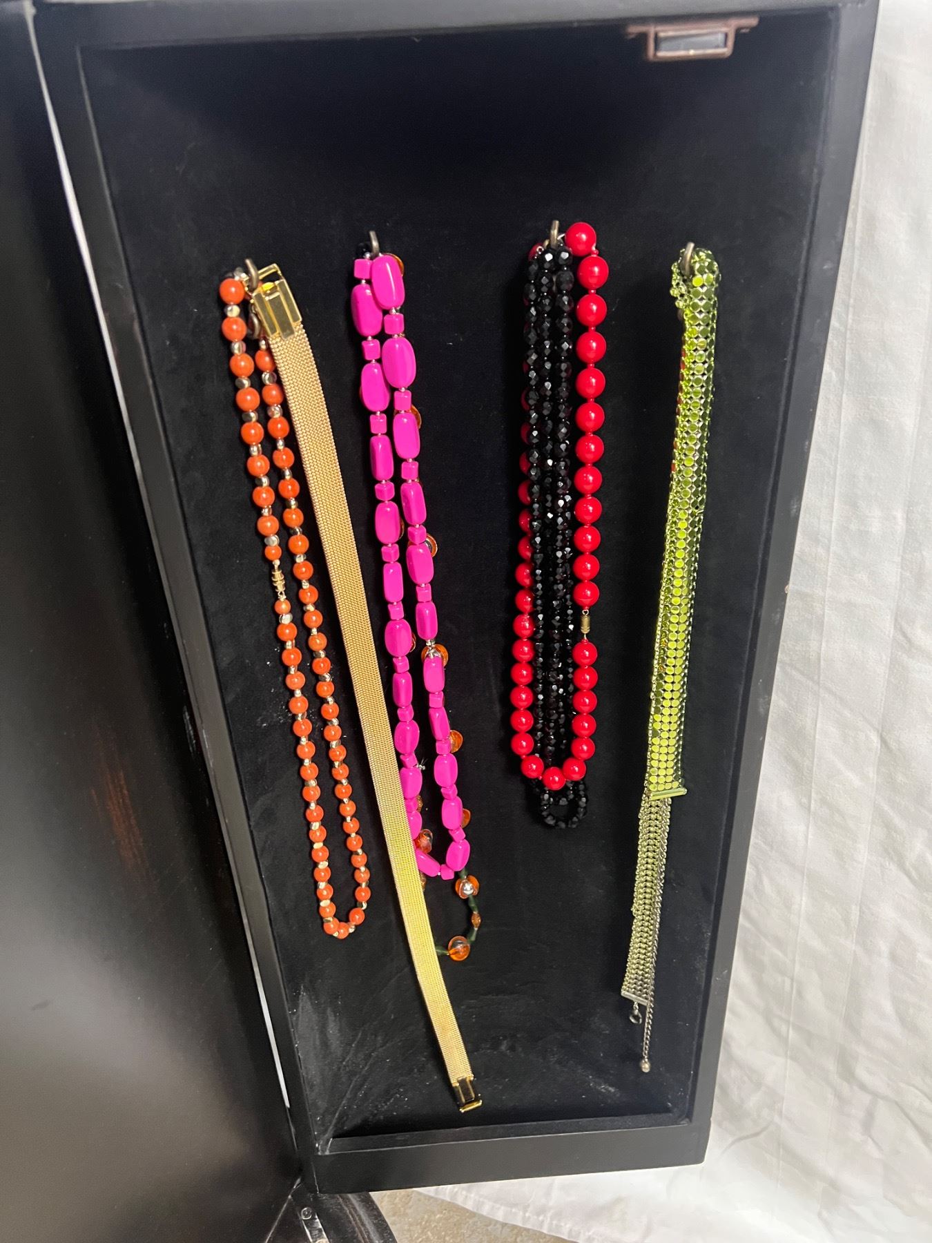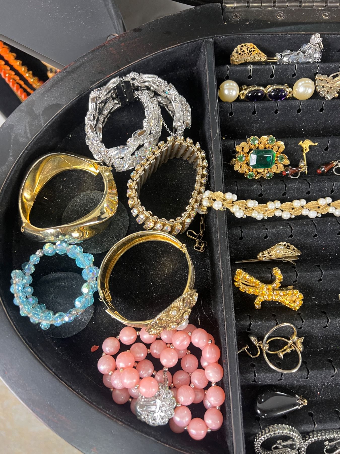 The cabinet measures 34.5"H x 24"L x 16"D , has some scuffs along the edges, includes a variety of costume jewelry such as necklaces, earrings, and brooches