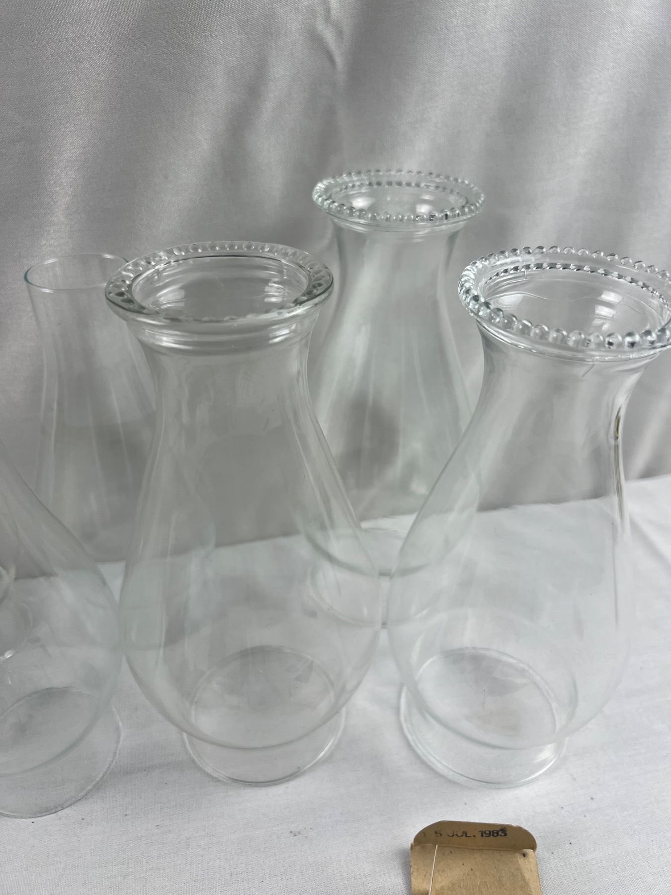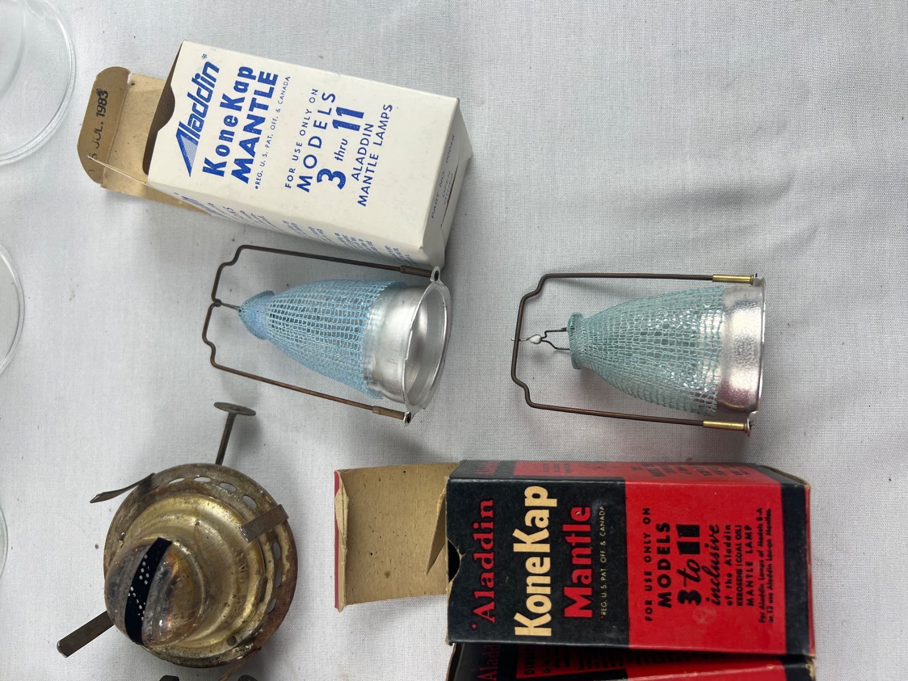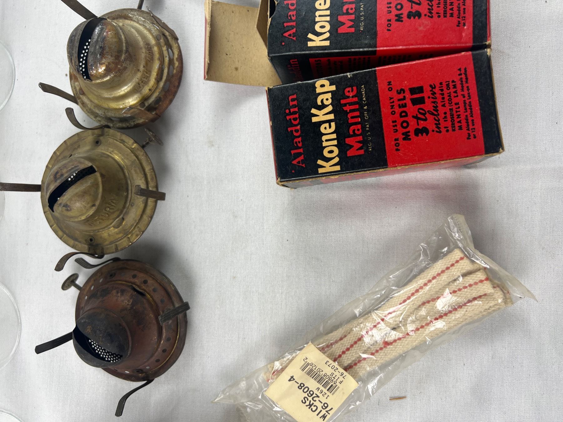 Includes four Aladdin KoneKap Mantle pieces, Wicks, The larger glass shades are 8.5"H x 3"diameter, the smaller shades are 6.5"H x 2"diameter
