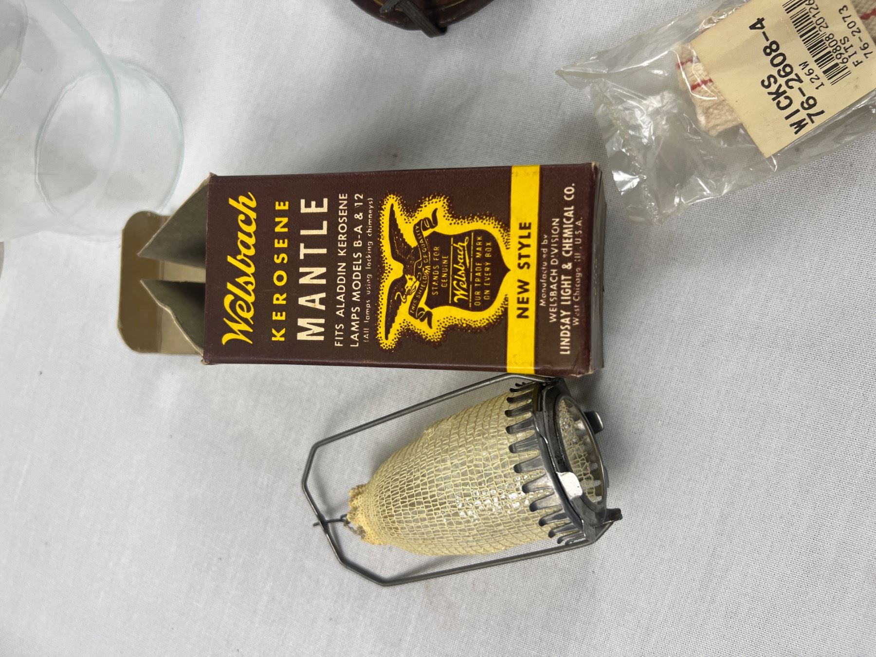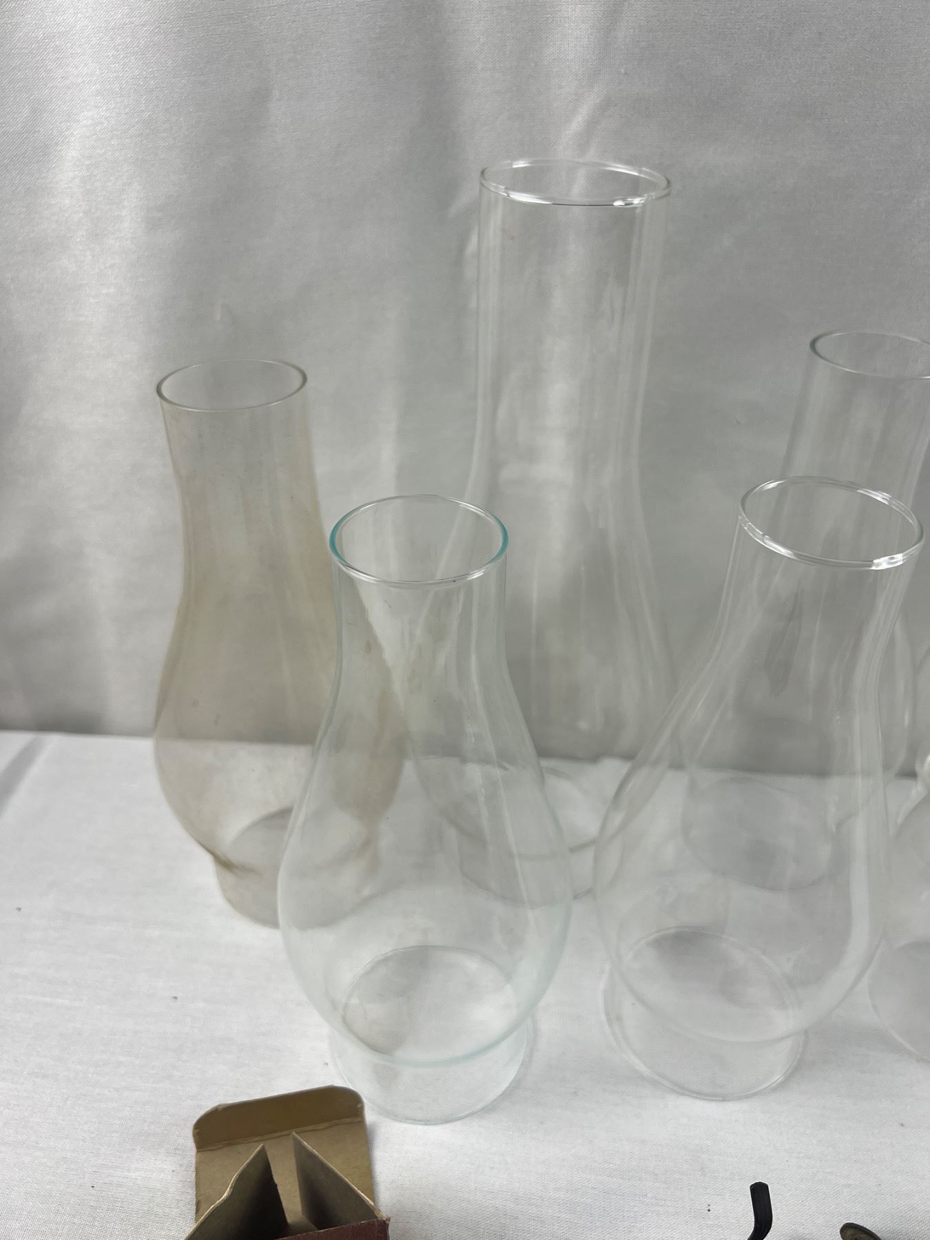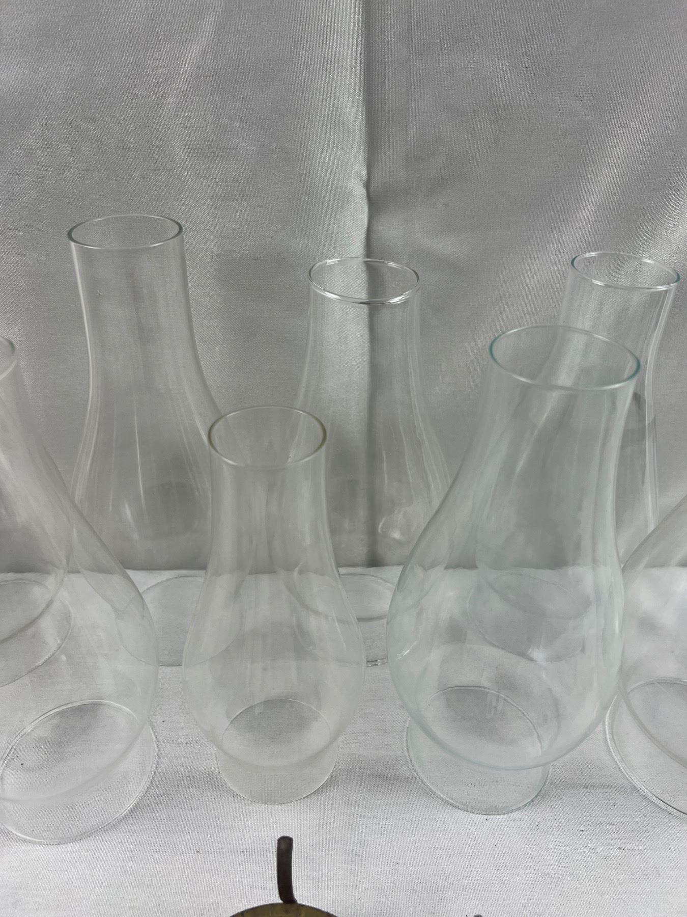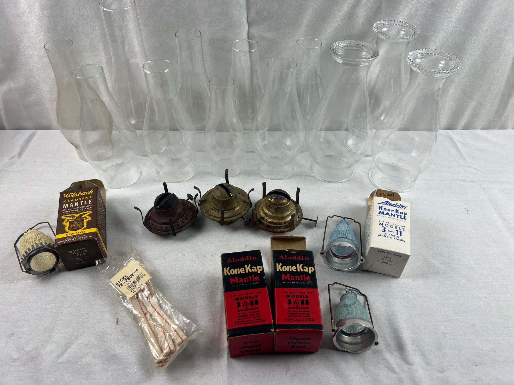 Includes four Aladdin KoneKap Mantle pieces, Wicks, The larger glass shades are 8.5"H x 3"diameter, the smaller shades are 6.5"H x 2"diameter