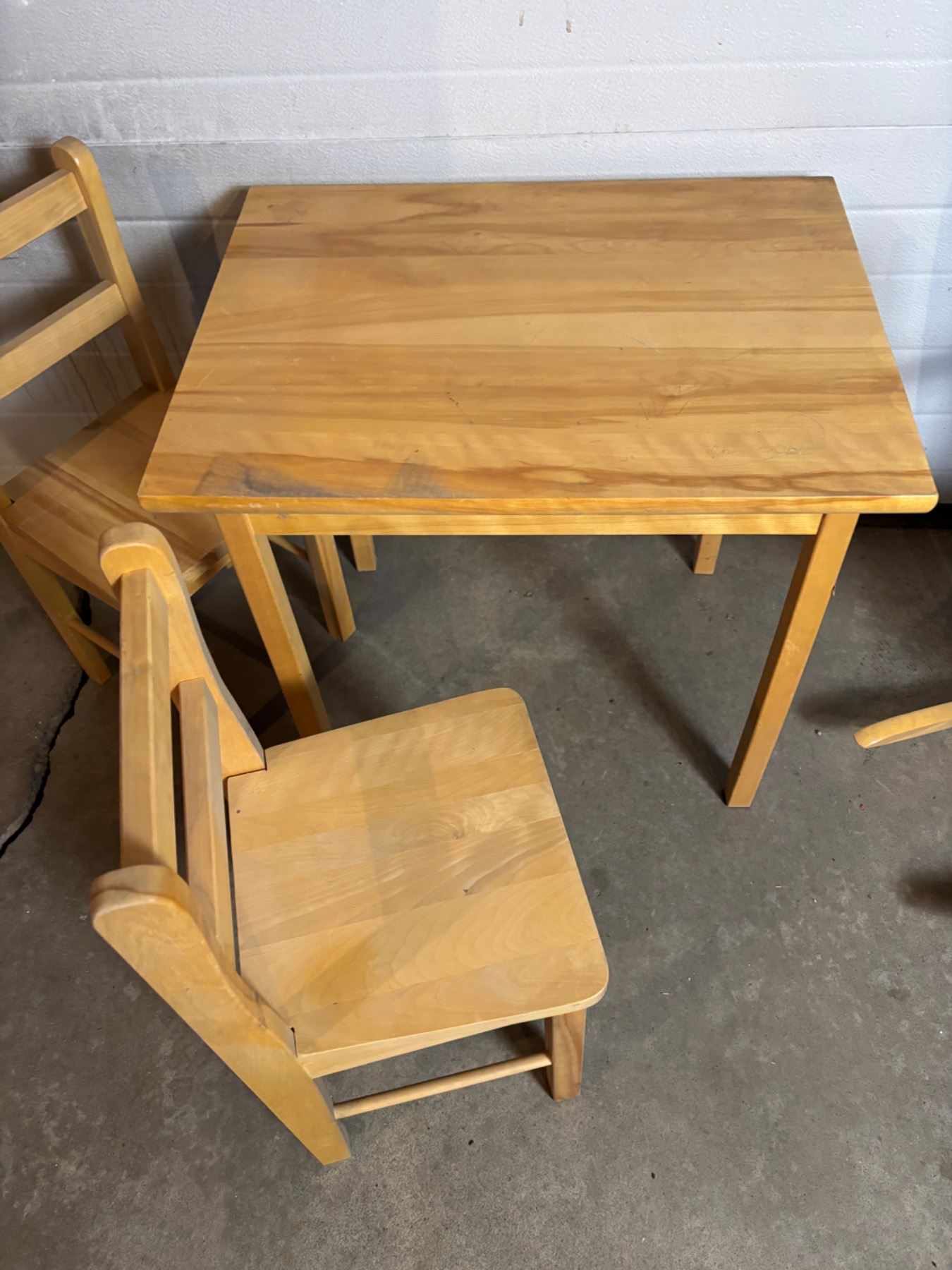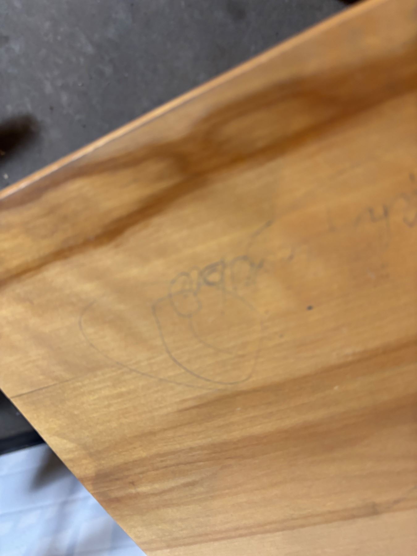 Some stains and wear, ink writing on the tabletop, Table measures 23.5"L x 18"W x 21"H
