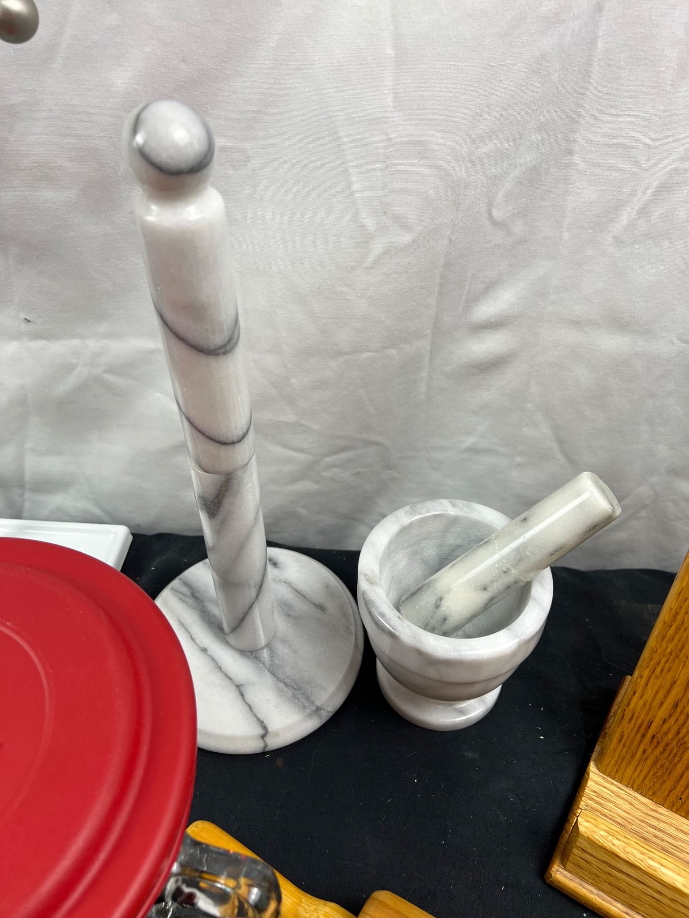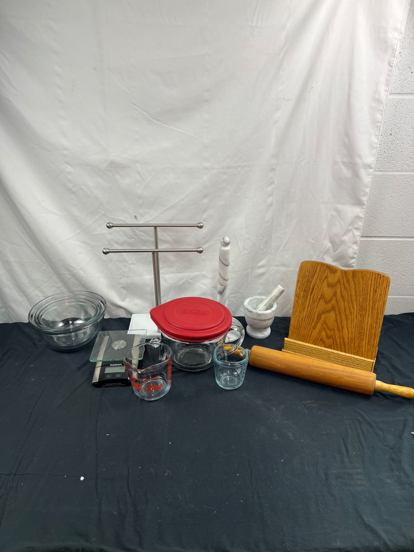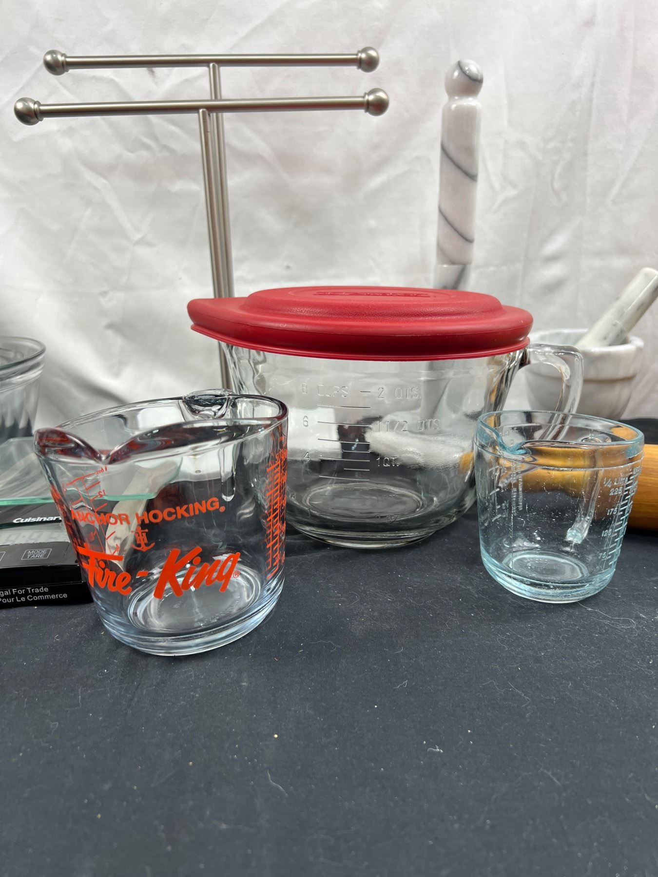 Includes three Anchor Hocking Bowls (largest is 2.5L), Anchor measuring cup with lid, Marble mortar & pestle, and more