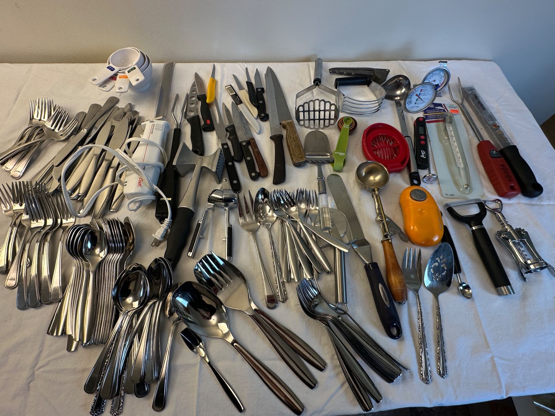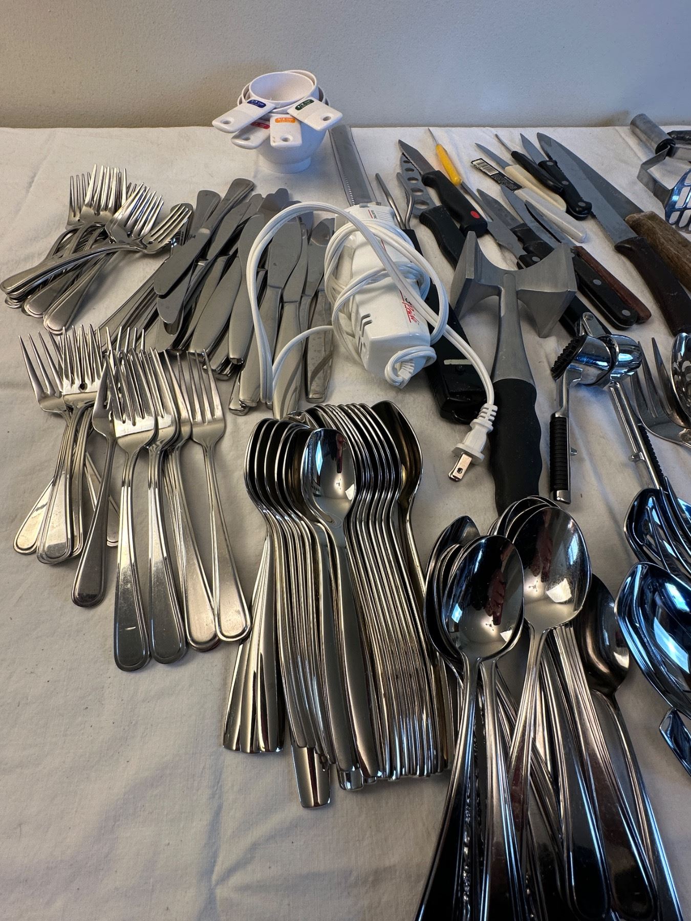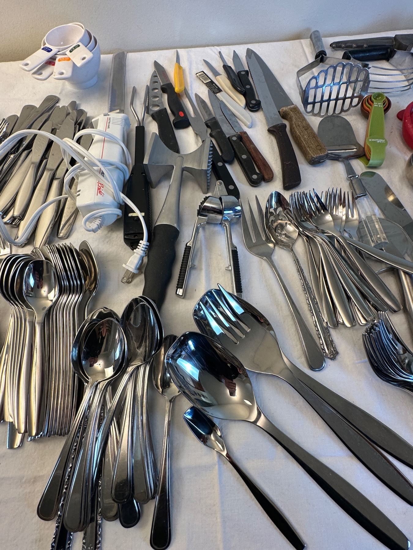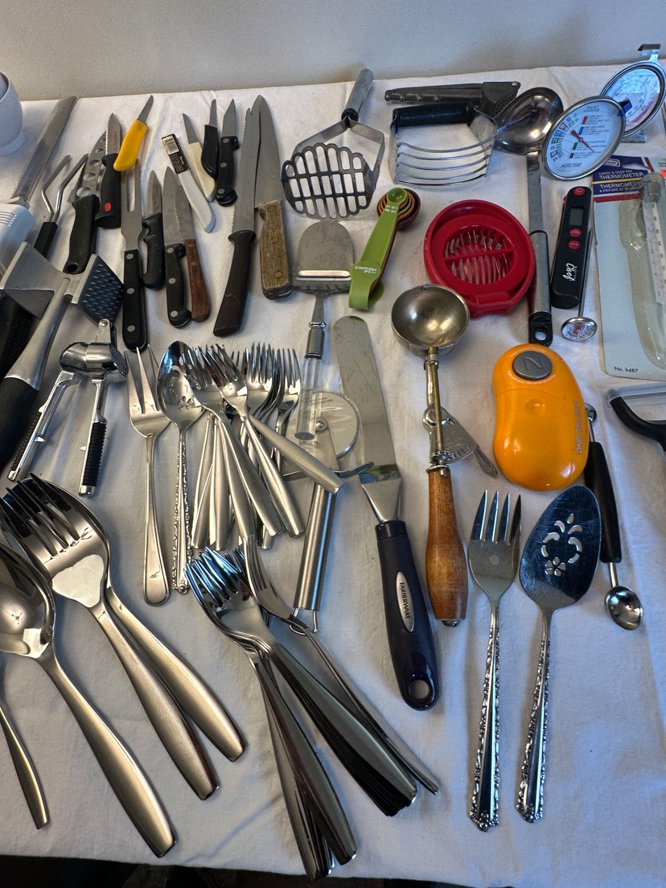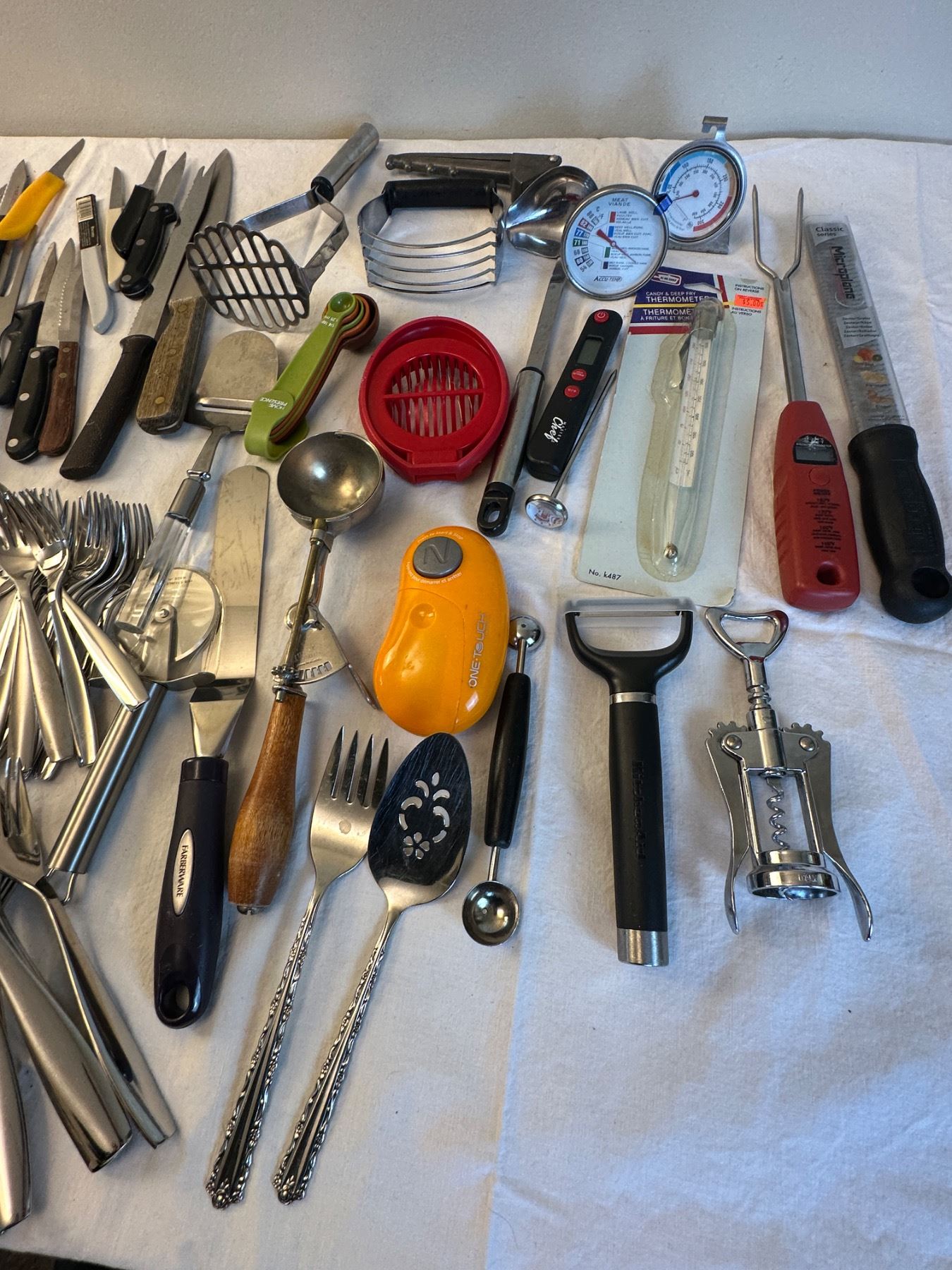 Includes cutlery, knives, measuring cups and spoons, ice cream scoop, etc