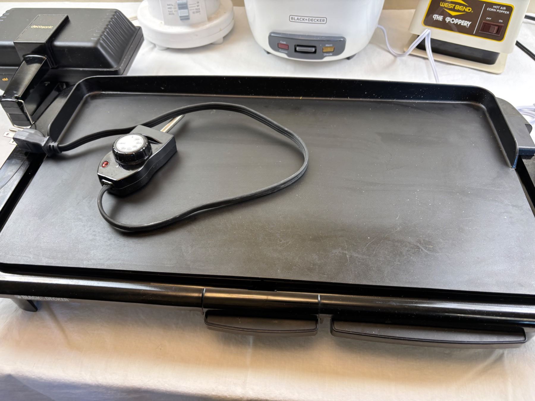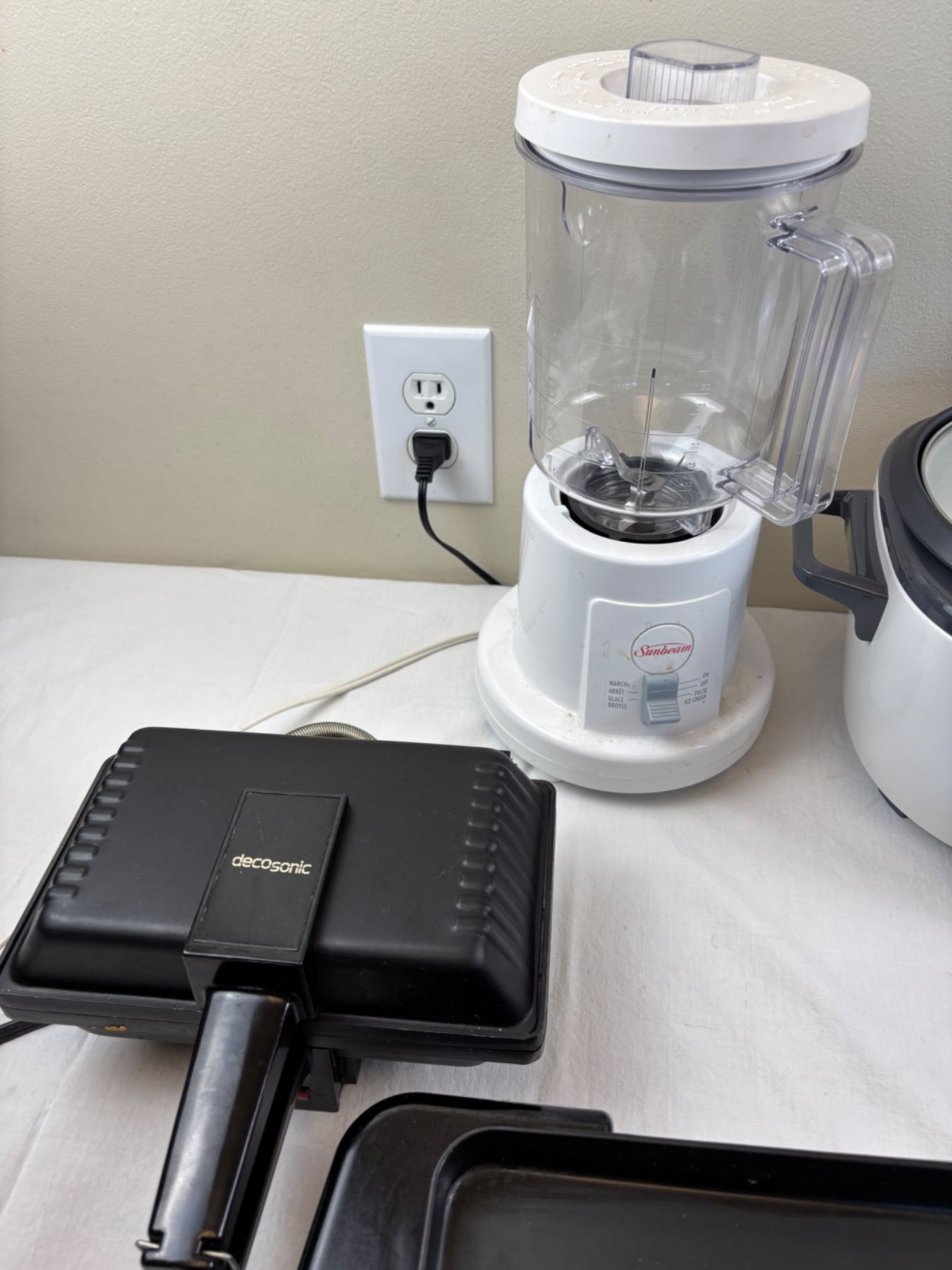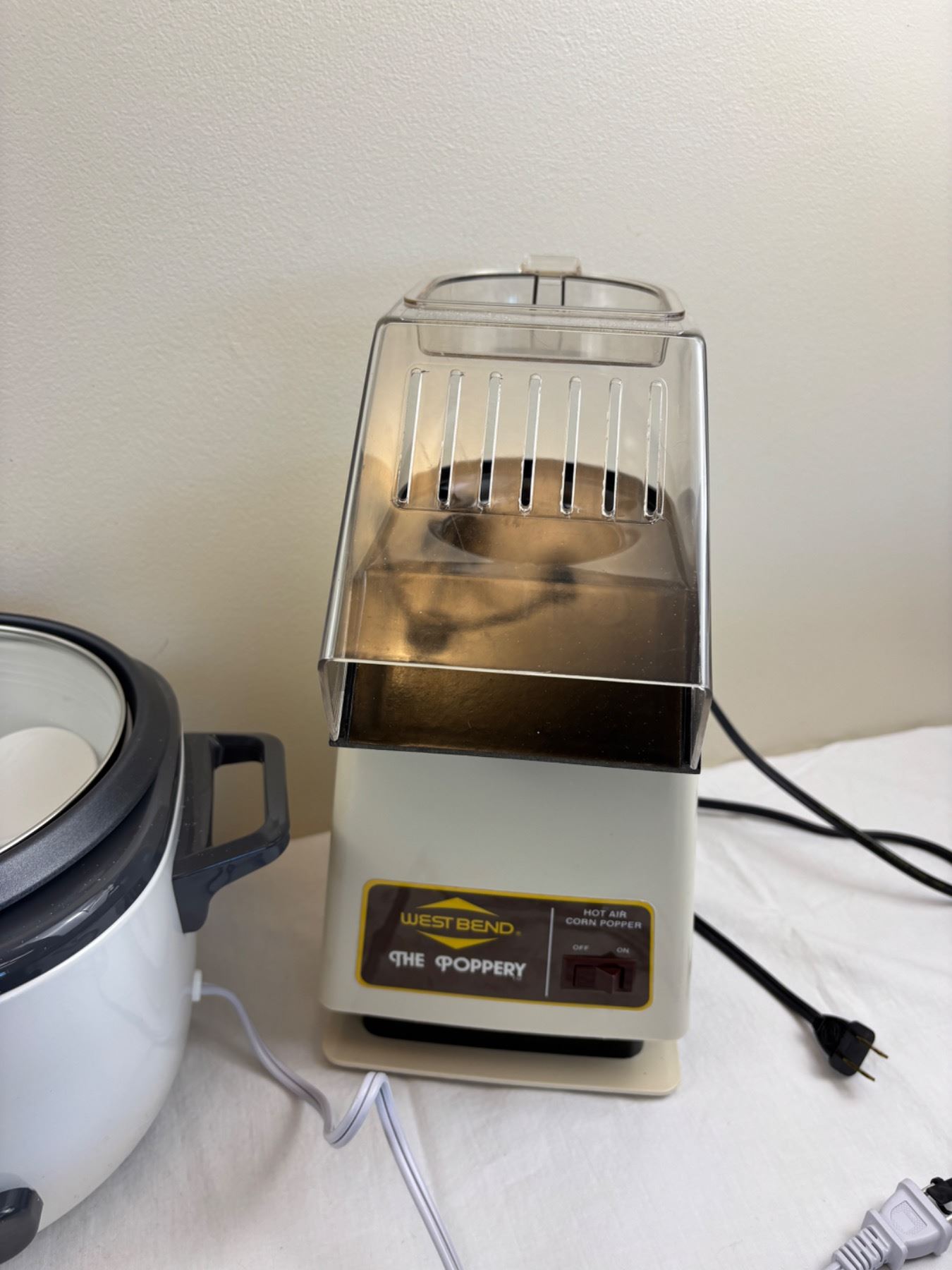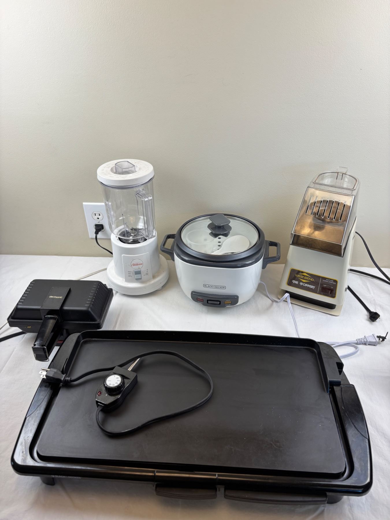 Includes, West Bend The Poppery, Black & Decker Rice Cooker, Sunbeam Blender, and more, all turn on
