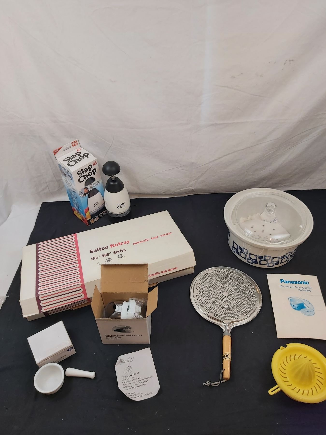 Includes,Panasonic microwave slow cooker (works), Salton Hot tray, Slap Chop, Corn Stripper, etc.