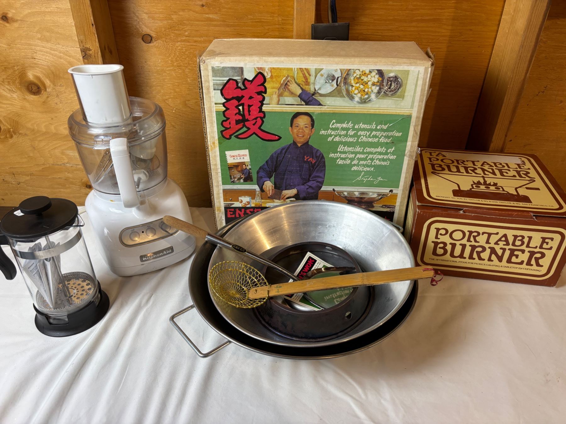 Includes, Kitchen Aid Food Processor (works), Wok set, Portable Burner, and more