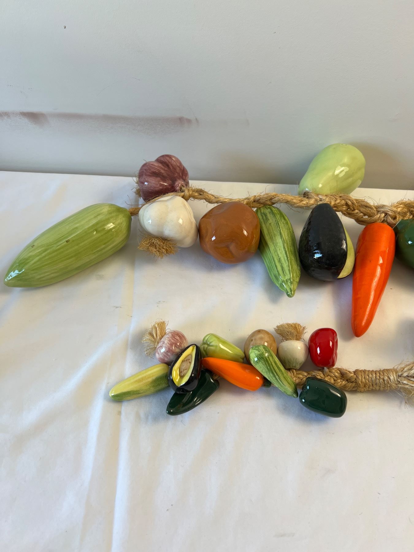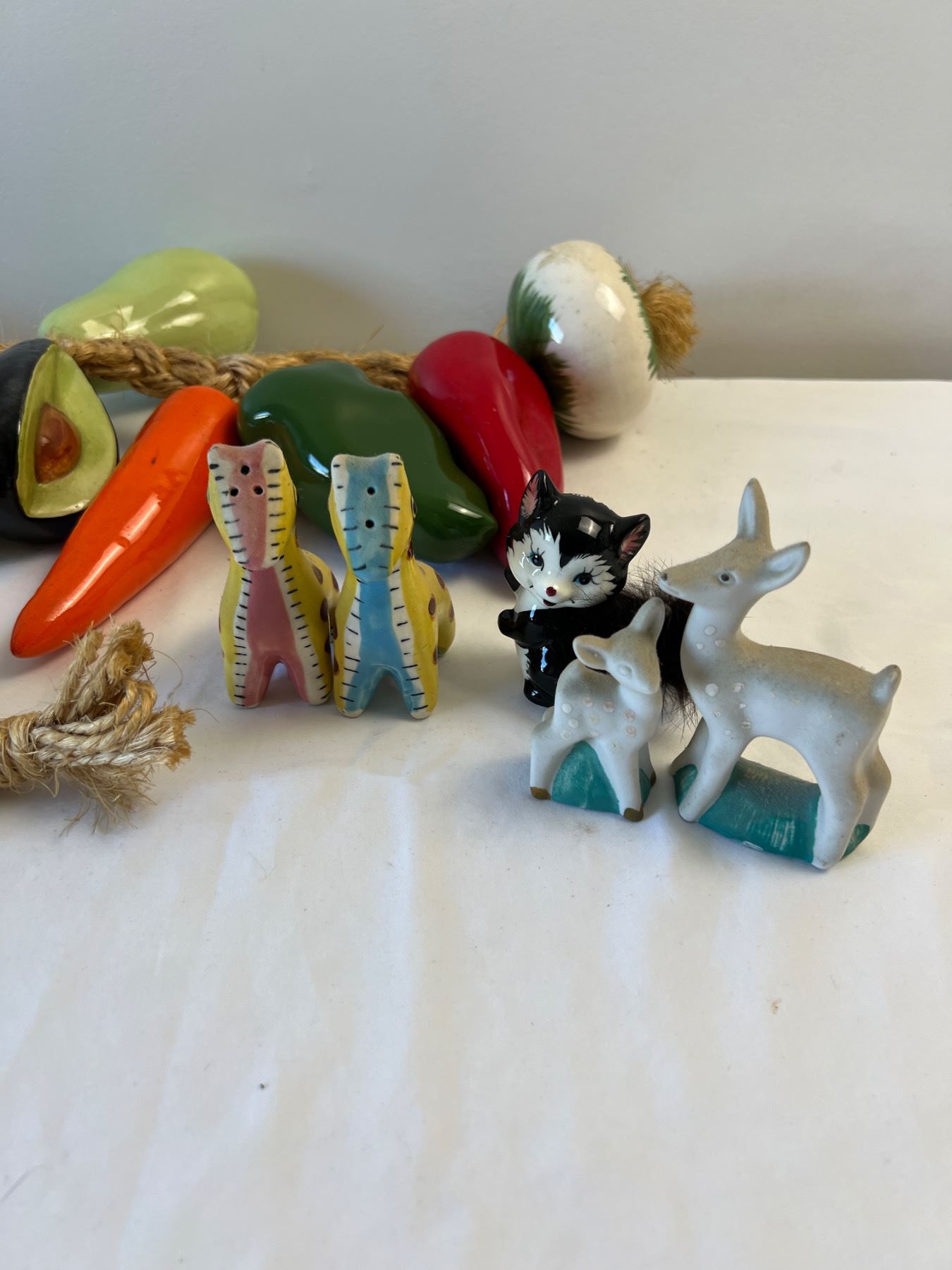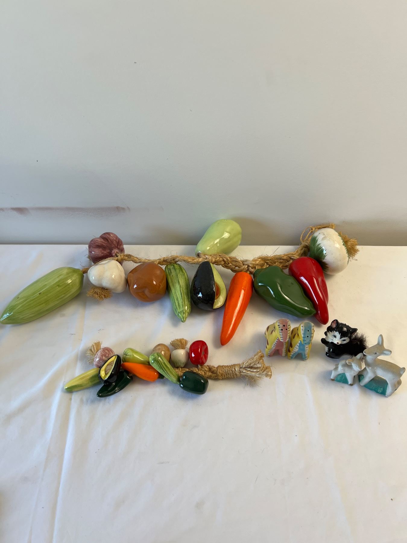 Includes ceramic vegetables as well as figures. Also includes giraffe salt and pepper shakers. Large vegetable string is approximately 20" wide